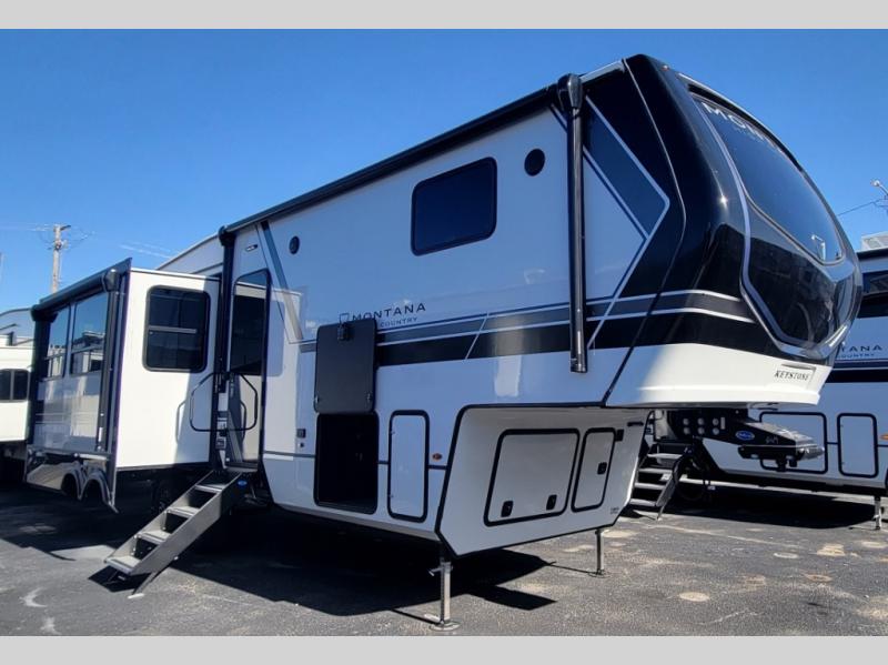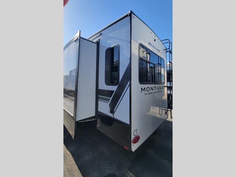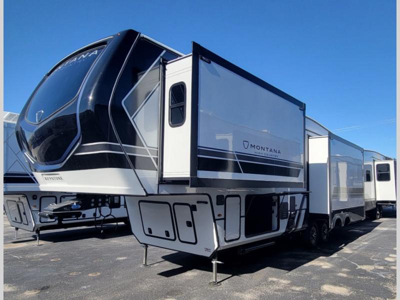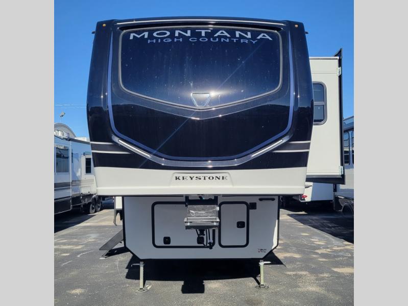 Live the high life with a Keystone Montana High Country fifth wheel! You'll have all the luxury you need with these units. They come with a MaxTurn™ front cap with KeyShield™ automotive-grade paint, a fully walkable roof with Alpha seamless TPO membrane system, and an insulated underbelly with forced hot air and electric tank heaters. The MORryde CRE3000 suspension with wet bolts helps provide a smooth tow, and the Ground Control® four-point electric auto-leveling with hitch memory will make set-up quite easy. The interior is elegantly appointed with the Thomas Payne Collection furniture, hardwood decorative slide-out fascia, Beauflor® vinyl throughout, accent crown molding, and premium solid surface kitchen countertops.