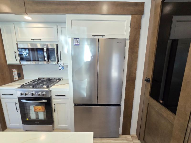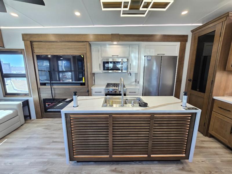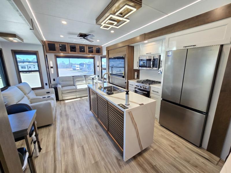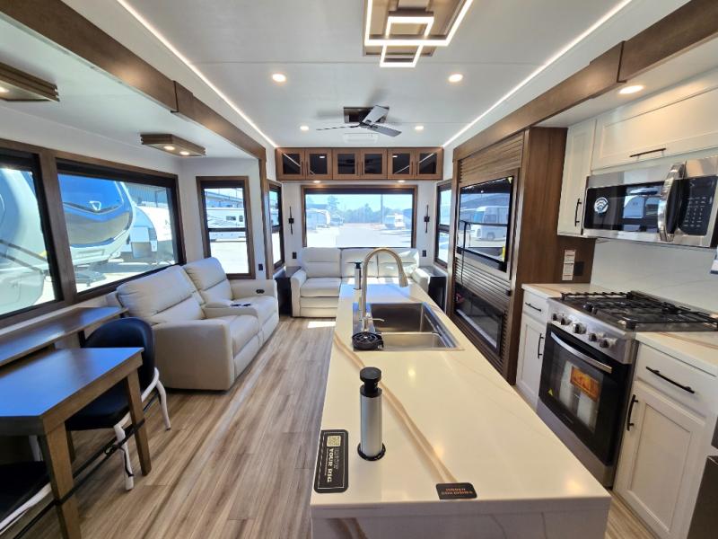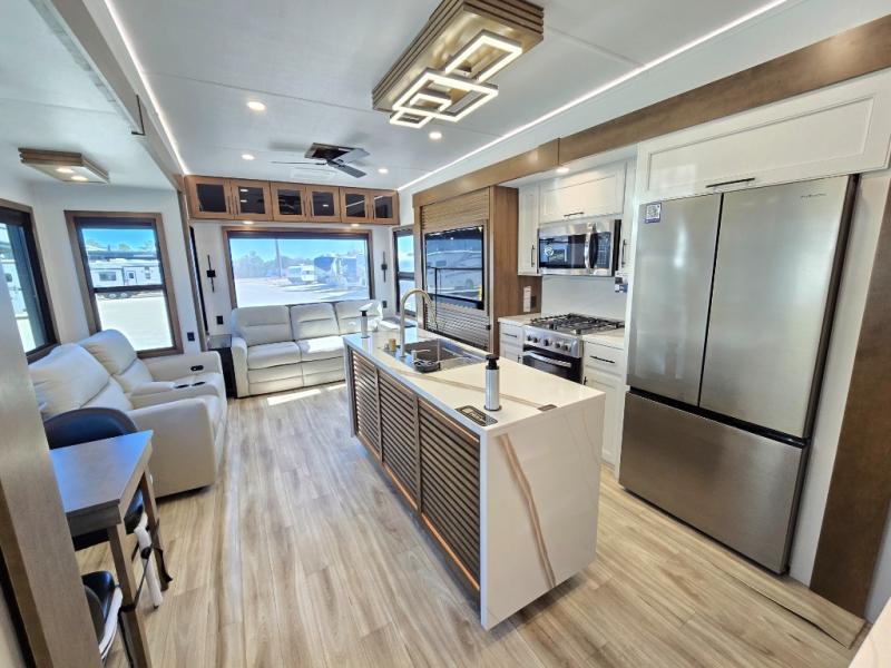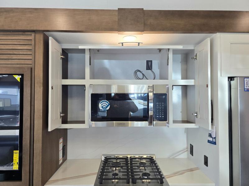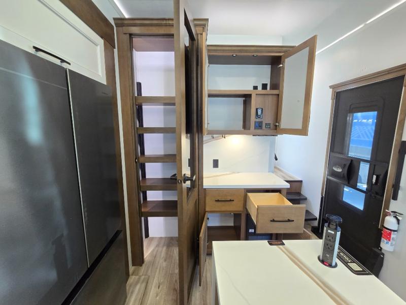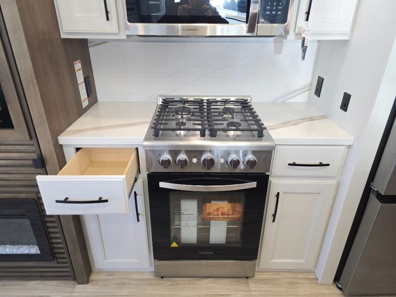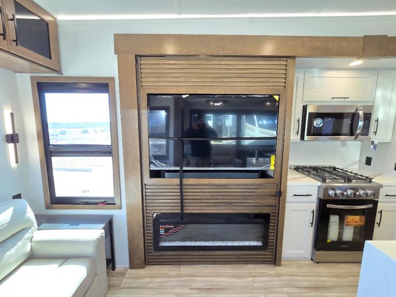 It won't be hard to find comfort in this fifth wheel with triple slides for more space, a spacious front bedroom, and a rear living area with a comfy sofa! Once you've unloaded the exterior pull-out storage tray, you can put out the two awnings, then relax in your camp chairs. A four-burner range inside will let you make lunch for your crew, and a spacious kitchen island will provide more counter space. There is also a pantry, overhead cabinets, plus a second, swing-out hidden pantry behind the entertainment center with a fireplace. The pull-out dinette, power theater seating, and rear sofa will give you plenty of seating options, and the dual opposing slides in the combined kitchen and living area will create an open floorplan you are sure to love. Head towards the front to freshen up in the spacious bath with ample counter space, then enjoy a perfect night's rest in the front bedroom, complete with a king bed slide, dual nightstands, front wardrobe, plus a second wardrobe with washer and dryer prep.