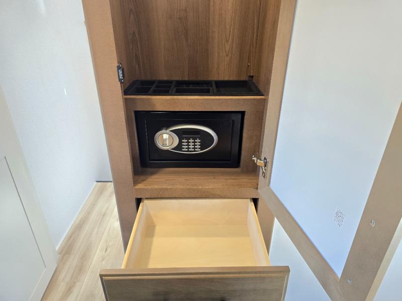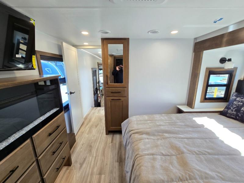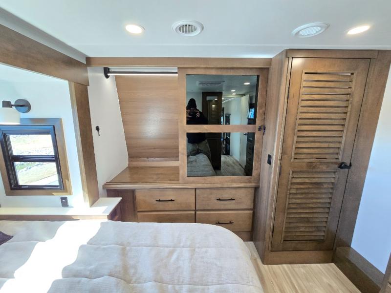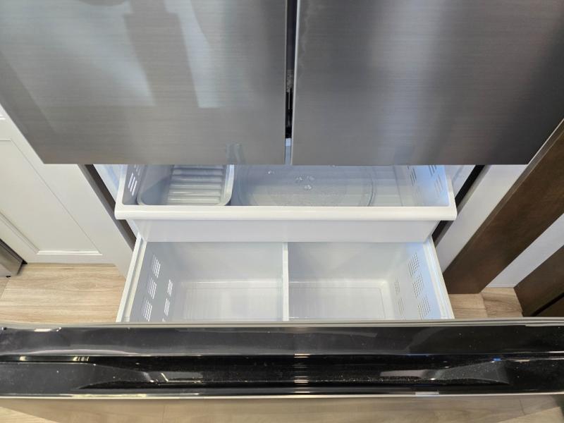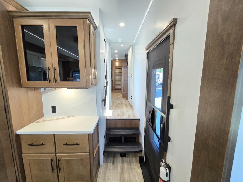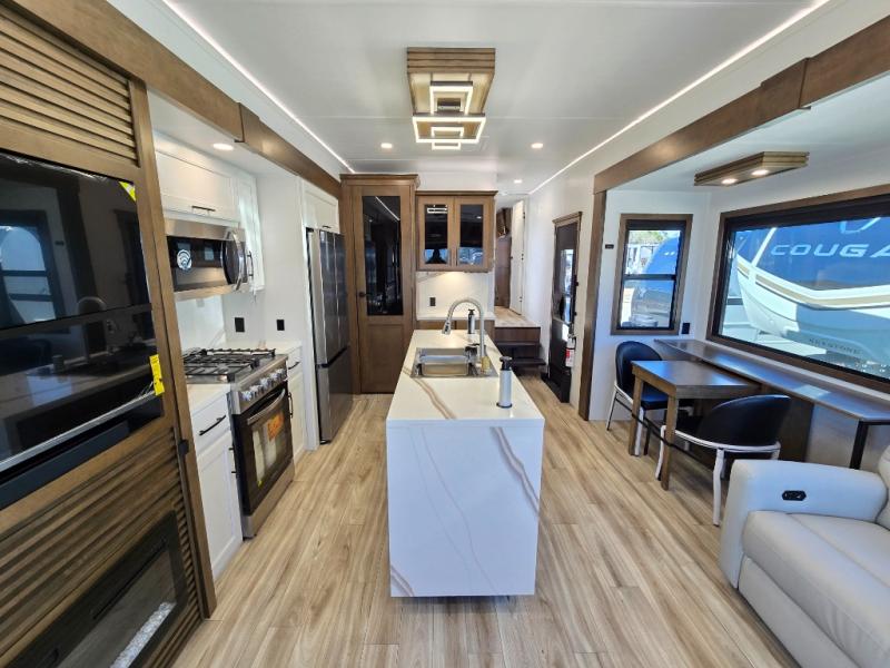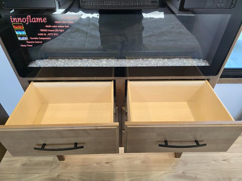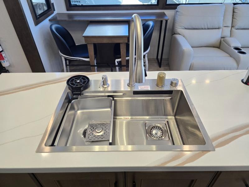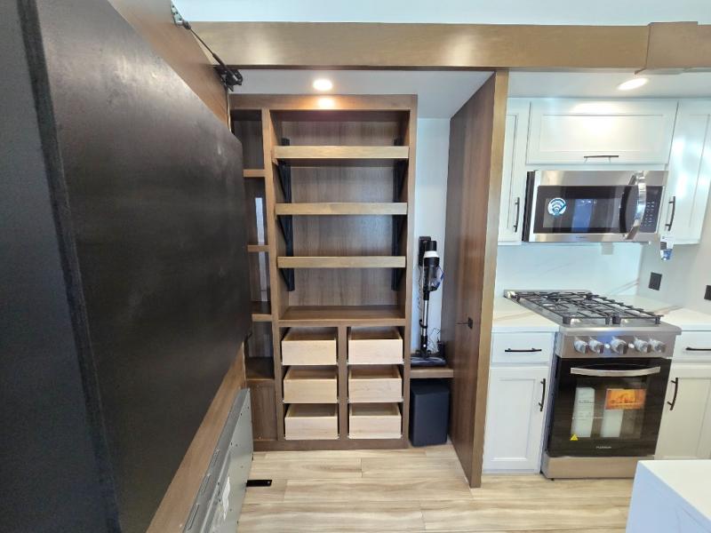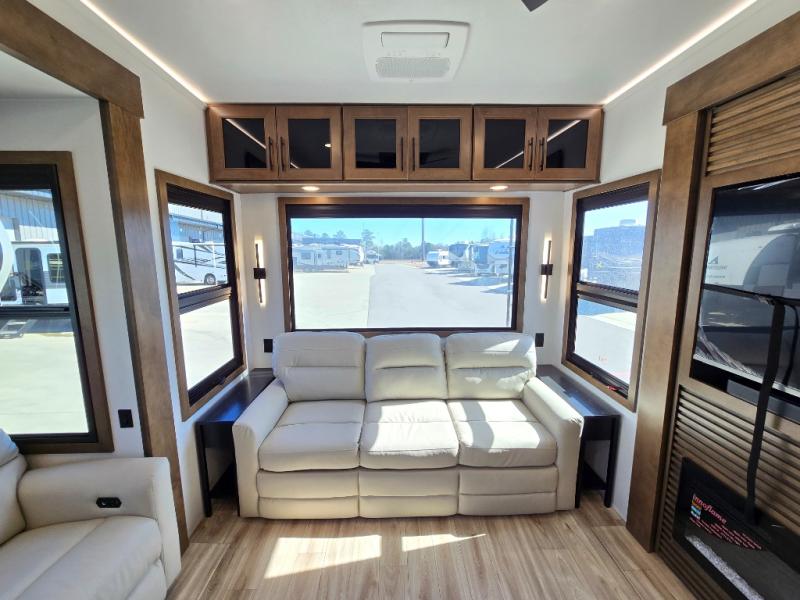 It won't be hard to find comfort in this fifth wheel with triple slides for more space, a spacious front bedroom, and a rear living area with a comfy sofa! Once you've unloaded the exterior pull-out storage tray, you can put out the two awnings, then relax in your camp chairs. A four-burner range inside will let you make lunch for your crew, and a spacious kitchen island will provide more counter space. There is also a pantry, overhead cabinets, plus a second, swing-out hidden pantry behind the entertainment center with a fireplace. The pull-out dinette, power theater seating, and rear sofa will give you plenty of seating options, and the dual opposing slides in the combined kitchen and living area will create an open floorplan you are sure to love. Head towards the front to freshen up in the spacious bath with ample counter space, then enjoy a perfect night's rest in the front bedroom, complete with a king bed slide, dual nightstands, front wardrobe, plus a second wardrobe with washer and dryer prep.