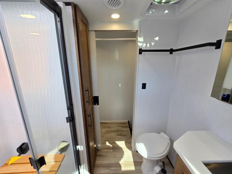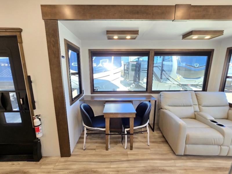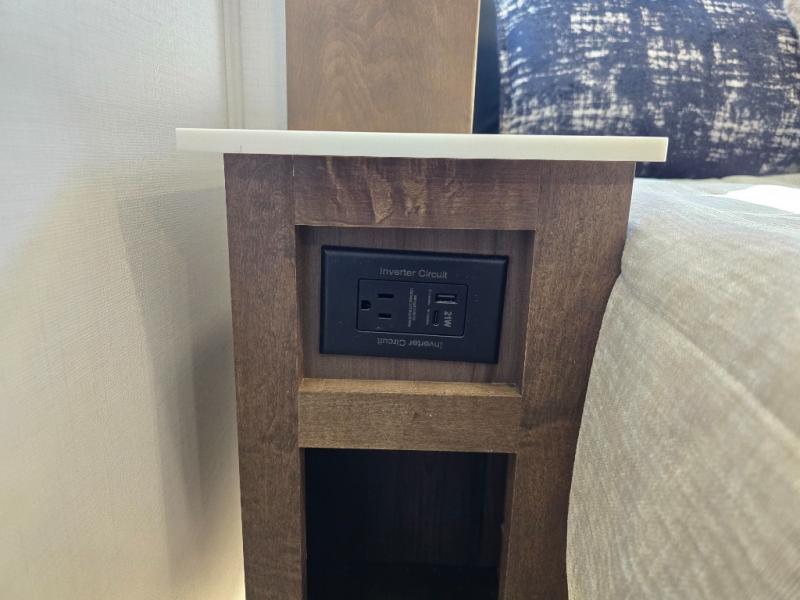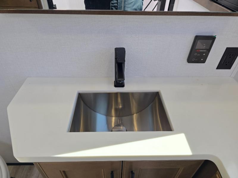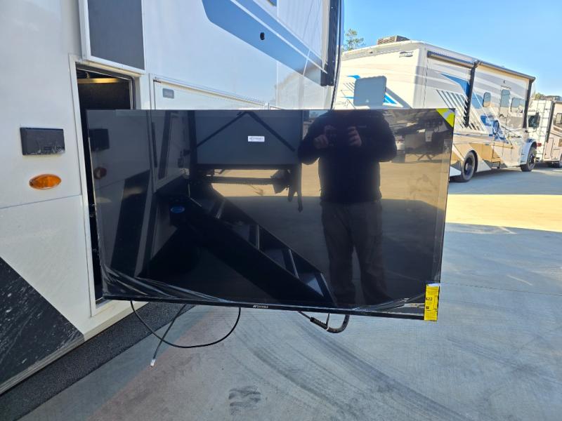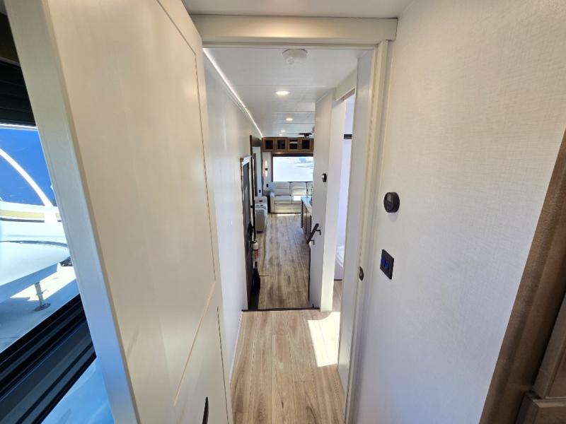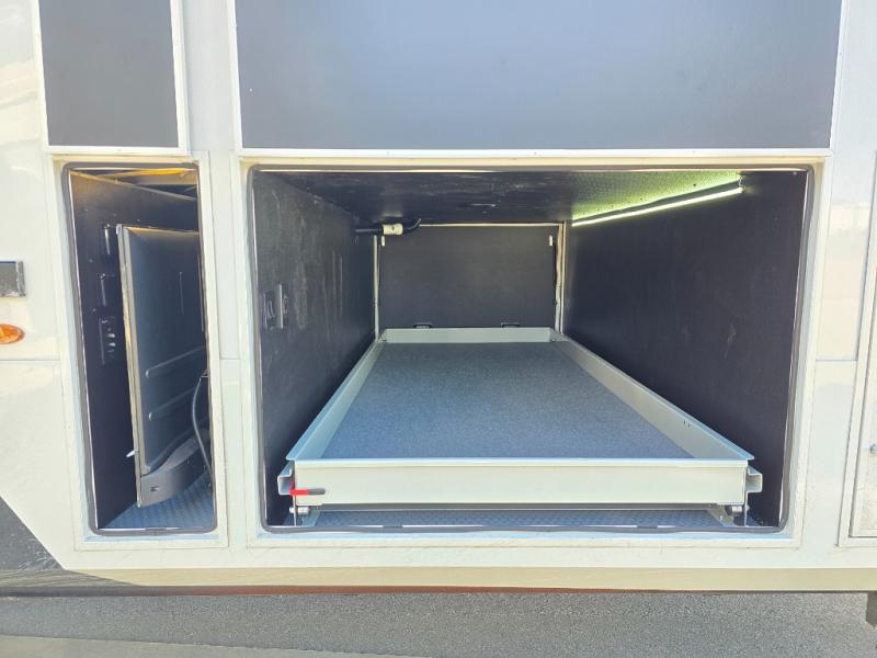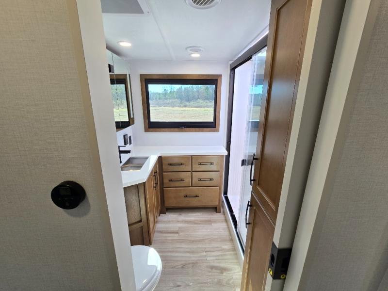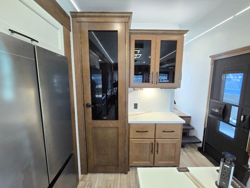 It won't be hard to find comfort in this fifth wheel with triple slides for more space, a spacious front bedroom, and a rear living area with a comfy sofa! Once you've unloaded the exterior pull-out storage tray, you can put out the two awnings, then relax in your camp chairs. A four-burner range inside will let you make lunch for your crew, and a spacious kitchen island will provide more counter space. There is also a pantry, overhead cabinets, plus a second, swing-out hidden pantry behind the entertainment center with a fireplace. The pull-out dinette, power theater seating, and rear sofa will give you plenty of seating options, and the dual opposing slides in the combined kitchen and living area will create an open floorplan you are sure to love. Head towards the front to freshen up in the spacious bath with ample counter space, then enjoy a perfect night's rest in the front bedroom, complete with a king bed slide, dual nightstands, front wardrobe, plus a second wardrobe with washer and dryer prep.