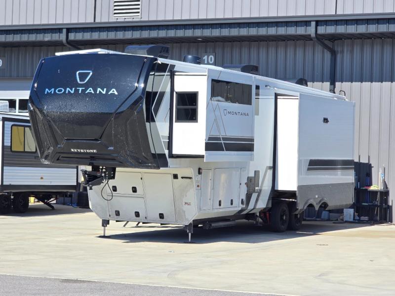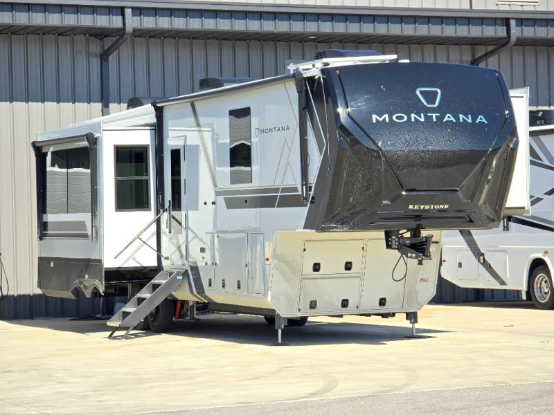 Enjoy luxury, innovation, and the outdoors in any one of Montana's finest fifth wheels. Each set the standard with exceptional features, and exciting factory installed options to provide you a great home on the road. Keystone's 12" I-beam chassis with z-frame technology provides a strong and durable foundation to your fifth wheel, and the four-season living package will help extend your camping season. There are also square frameless windows outside, along with storage solutions, and a hydraulic leveling system that will have you set up in no-time! Inside, you'll love the hardwood cabinetry, solid surface countertops, spacious showers, and cozy bedrooms!