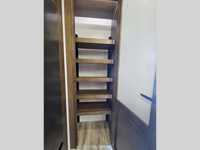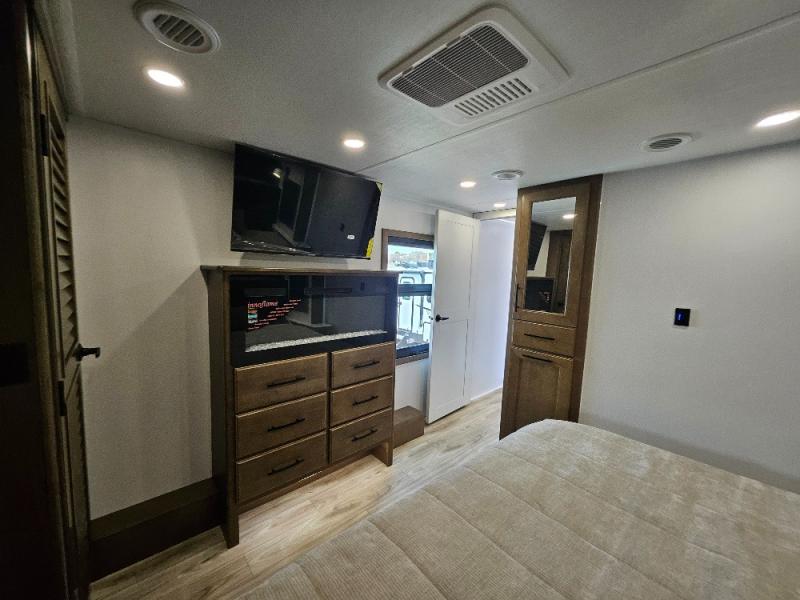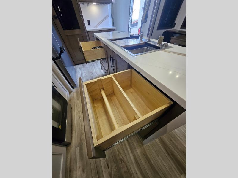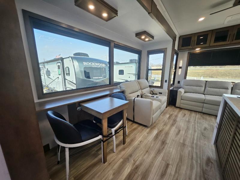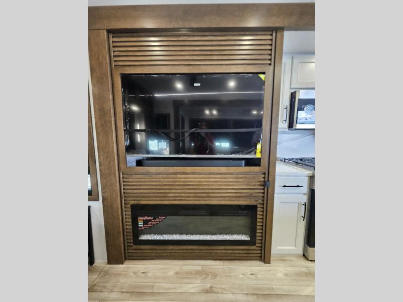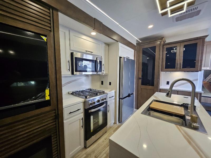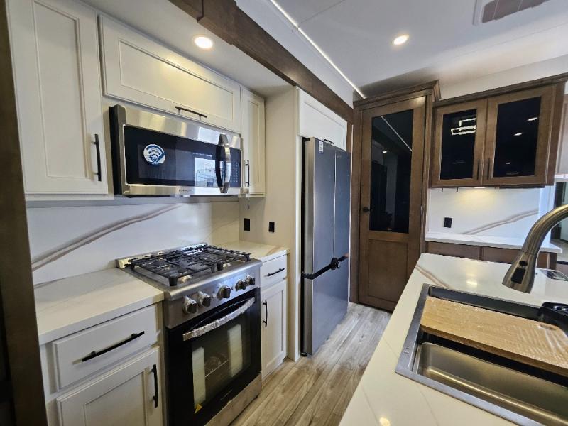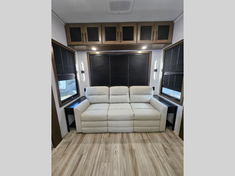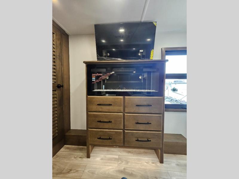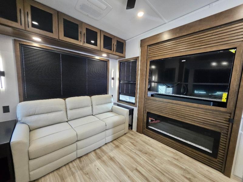 It won't be hard to find comfort in this fifth wheel with triple slides for more space, a spacious front bedroom, and a rear living area with a comfy sofa! Once you've unloaded the exterior pull-out storage tray, you can put out the two awnings, then relax in your camp chairs. A four-burner range inside will let you make lunch for your crew, and a spacious kitchen island will provide more counter space. There is also a pantry, overhead cabinets, plus a second, swing-out hidden pantry behind the entertainment center with a fireplace. The pull-out dinette, power theater seating, and rear sofa will give you plenty of seating options, and the dual opposing slides in the combined kitchen and living area will create an open floorplan you are sure to love. Head towards the front to freshen up in the spacious bath with ample counter space, then enjoy a perfect night's rest in the front bedroom, complete with a king bed slide, dual nightstands, front wardrobe, plus a second wardrobe with washer and dryer prep.
