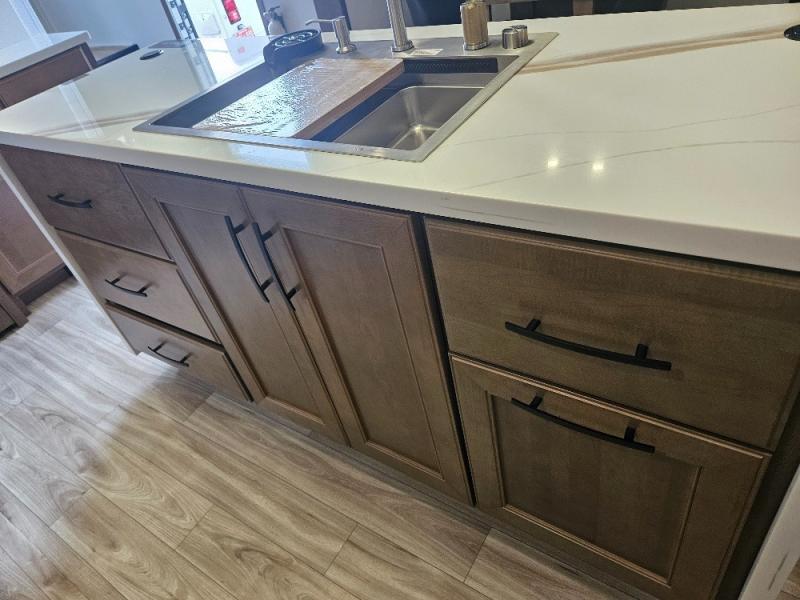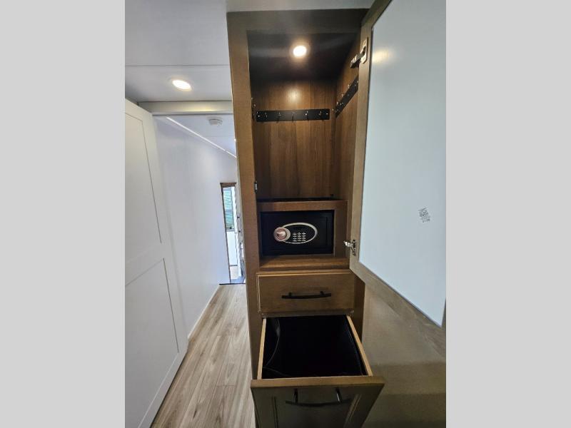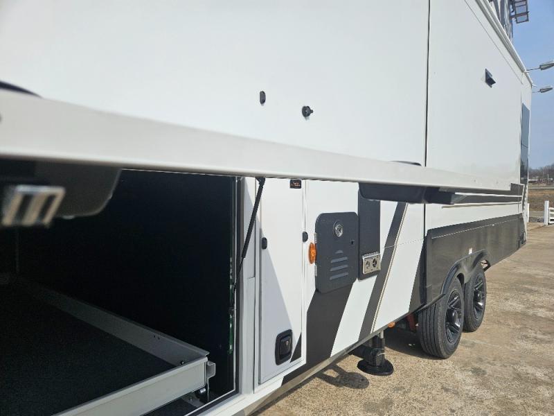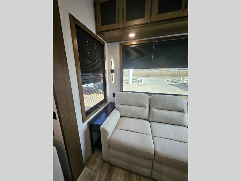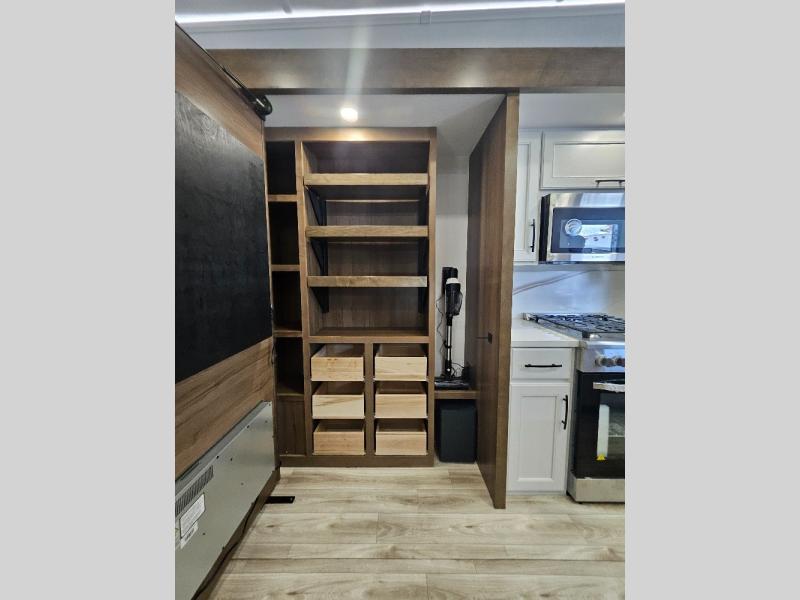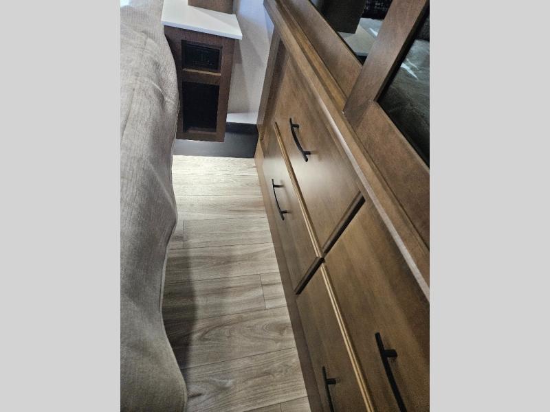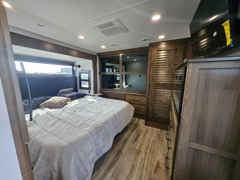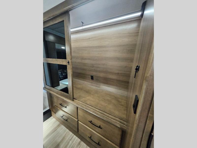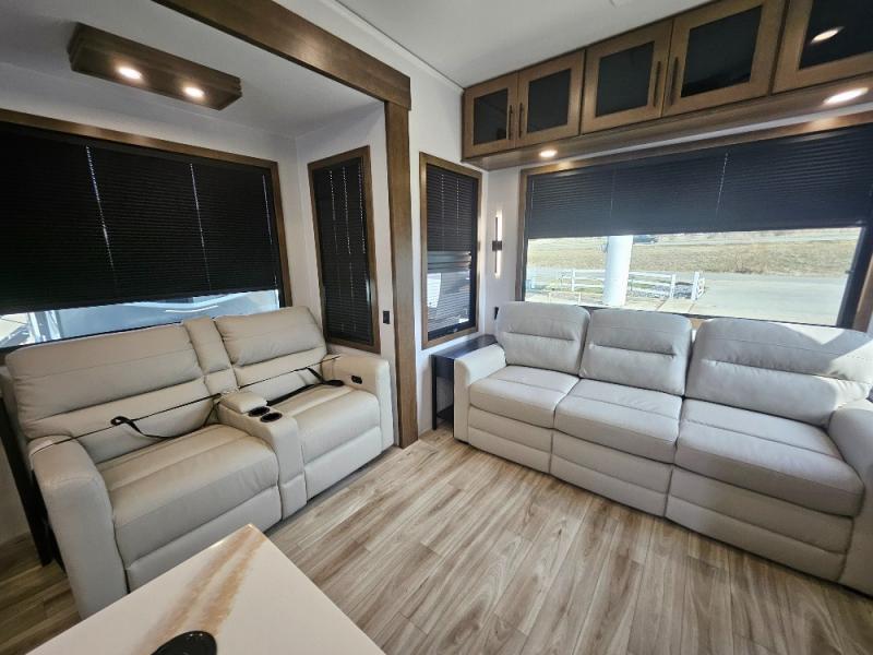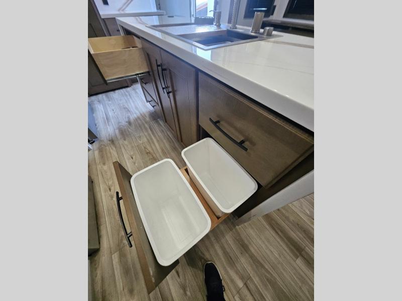 It won't be hard to find comfort in this fifth wheel with triple slides for more space, a spacious front bedroom, and a rear living area with a comfy sofa! Once you've unloaded the exterior pull-out storage tray, you can put out the two awnings, then relax in your camp chairs. A four-burner range inside will let you make lunch for your crew, and a spacious kitchen island will provide more counter space. There is also a pantry, overhead cabinets, plus a second, swing-out hidden pantry behind the entertainment center with a fireplace. The pull-out dinette, power theater seating, and rear sofa will give you plenty of seating options, and the dual opposing slides in the combined kitchen and living area will create an open floorplan you are sure to love. Head towards the front to freshen up in the spacious bath with ample counter space, then enjoy a perfect night's rest in the front bedroom, complete with a king bed slide, dual nightstands, front wardrobe, plus a second wardrobe with washer and dryer prep.