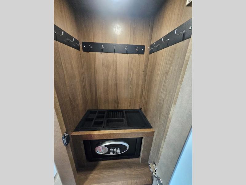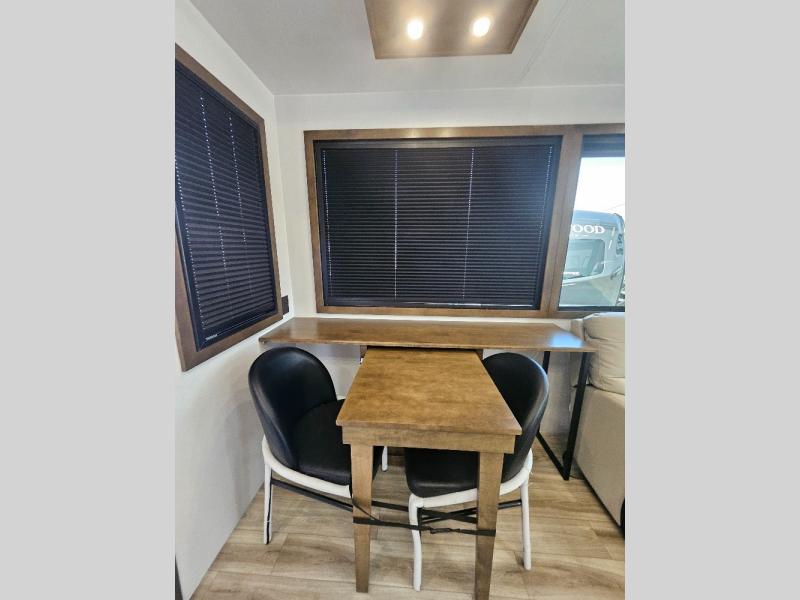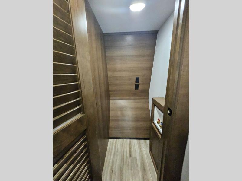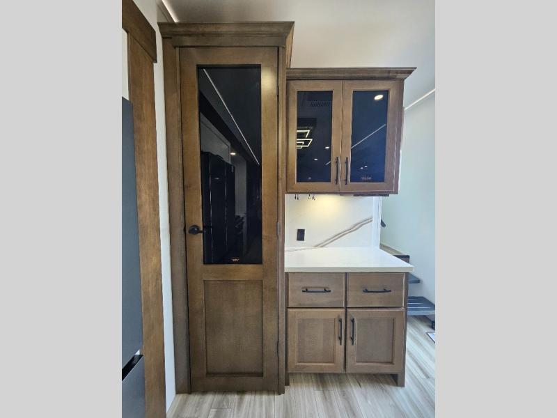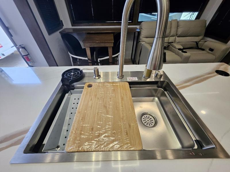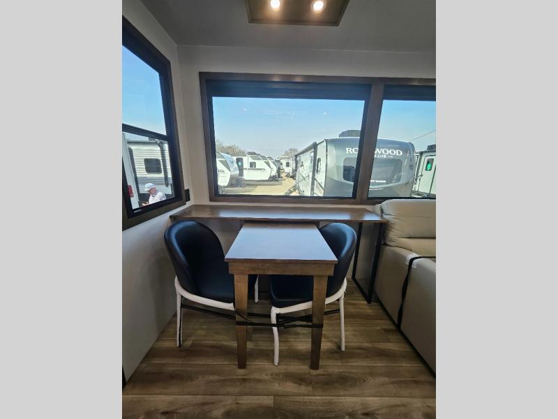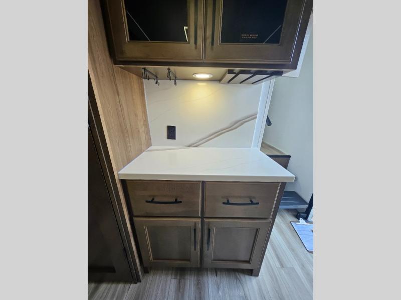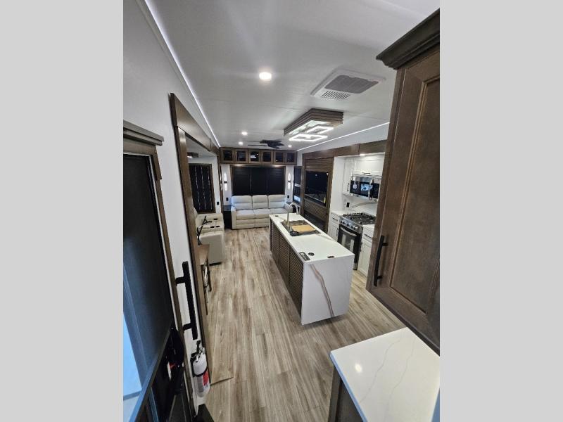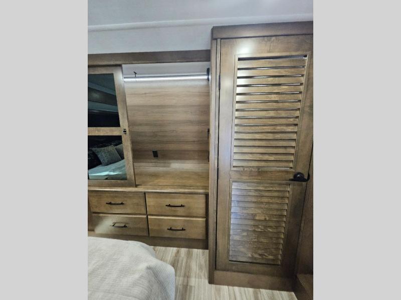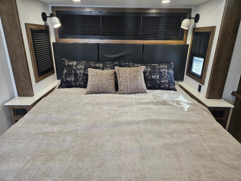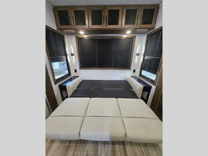 It won't be hard to find comfort in this fifth wheel with triple slides for more space, a spacious front bedroom, and a rear living area with a comfy sofa! Once you've unloaded the exterior pull-out storage tray, you can put out the two awnings, then relax in your camp chairs. A four-burner range inside will let you make lunch for your crew, and a spacious kitchen island will provide more counter space. There is also a pantry, overhead cabinets, plus a second, swing-out hidden pantry behind the entertainment center with a fireplace. The pull-out dinette, power theater seating, and rear sofa will give you plenty of seating options, and the dual opposing slides in the combined kitchen and living area will create an open floorplan you are sure to love. Head towards the front to freshen up in the spacious bath with ample counter space, then enjoy a perfect night's rest in the front bedroom, complete with a king bed slide, dual nightstands, front wardrobe, plus a second wardrobe with washer and dryer prep.