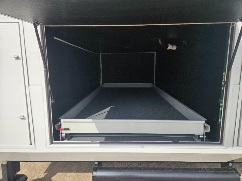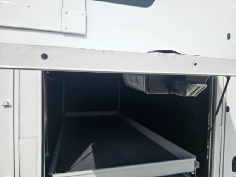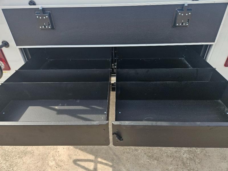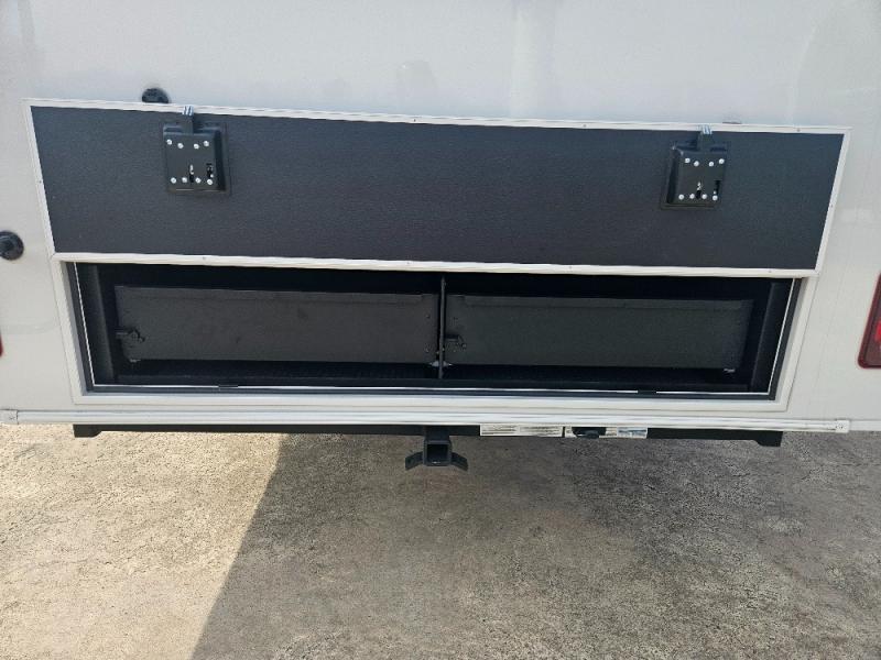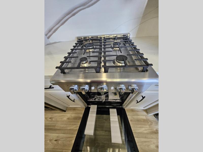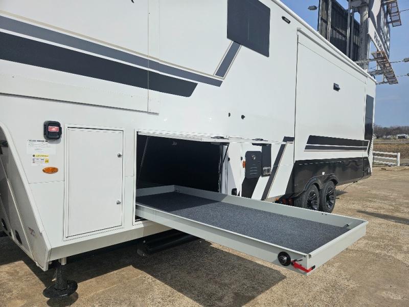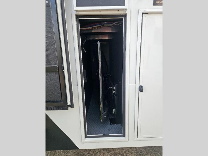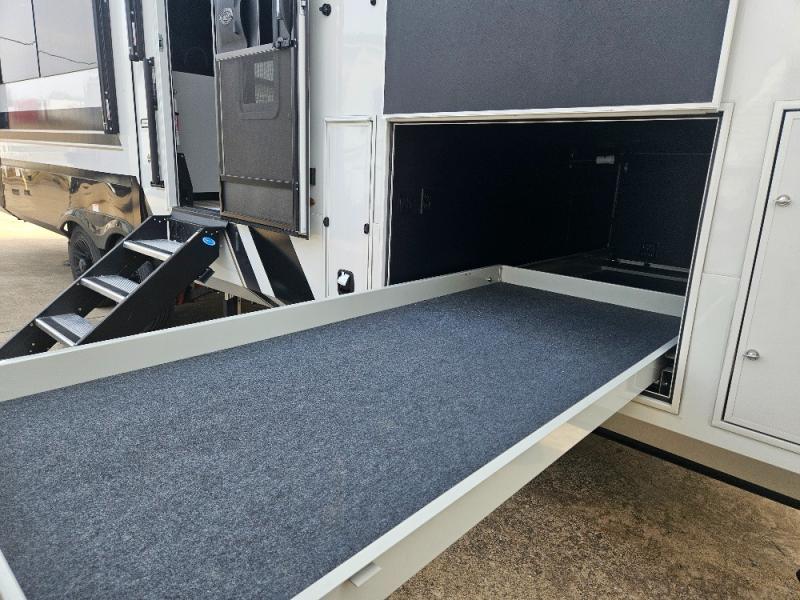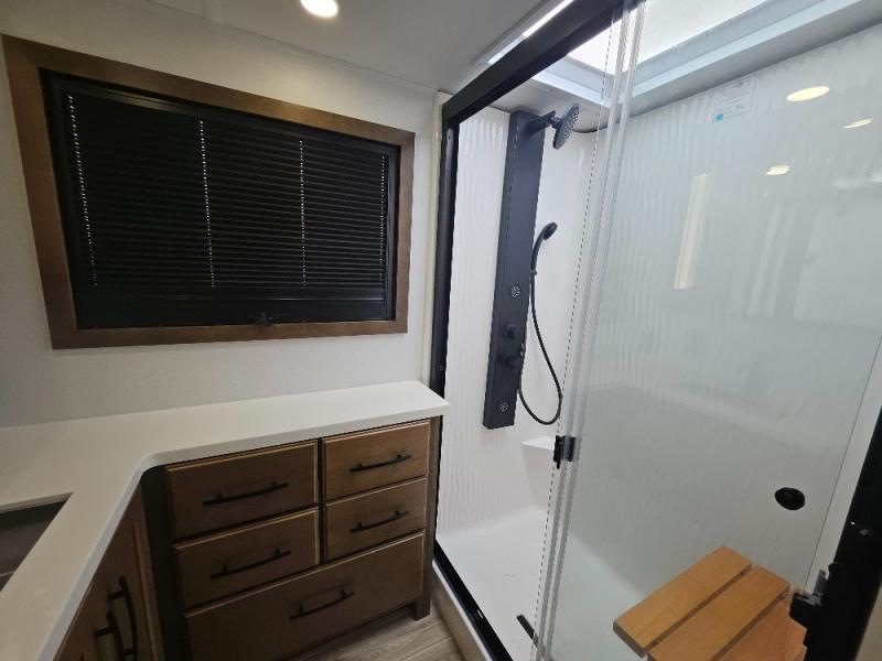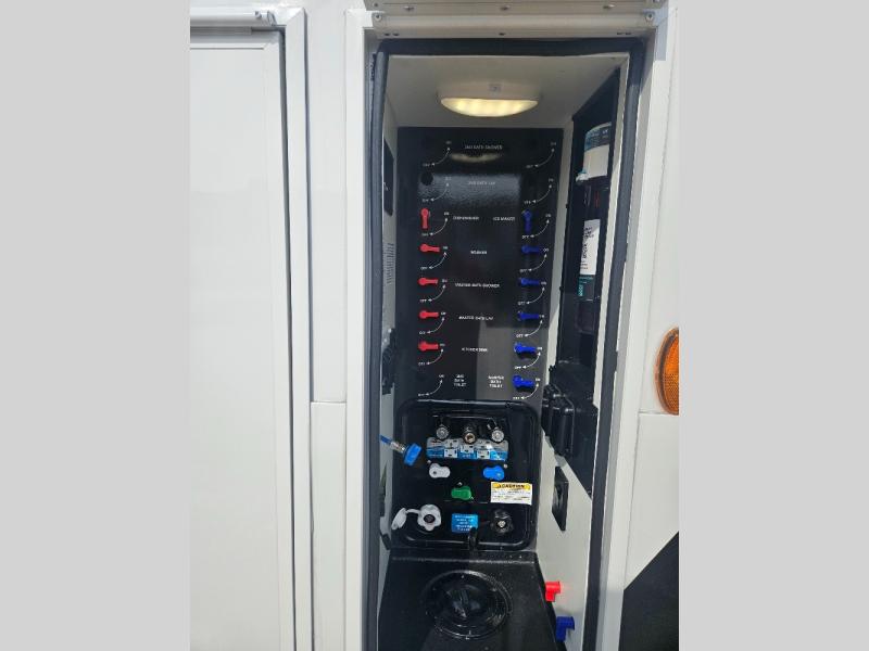 It won't be hard to find comfort in this fifth wheel with triple slides for more space, a spacious front bedroom, and a rear living area with a comfy sofa! Once you've unloaded the exterior pull-out storage tray, you can put out the two awnings, then relax in your camp chairs. A four-burner range inside will let you make lunch for your crew, and a spacious kitchen island will provide more counter space. There is also a pantry, overhead cabinets, plus a second, swing-out hidden pantry behind the entertainment center with a fireplace. The pull-out dinette, power theater seating, and rear sofa will give you plenty of seating options, and the dual opposing slides in the combined kitchen and living area will create an open floorplan you are sure to love. Head towards the front to freshen up in the spacious bath with ample counter space, then enjoy a perfect night's rest in the front bedroom, complete with a king bed slide, dual nightstands, front wardrobe, plus a second wardrobe with washer and dryer prep.
