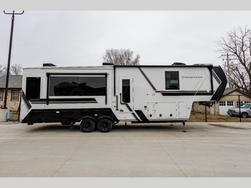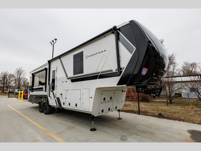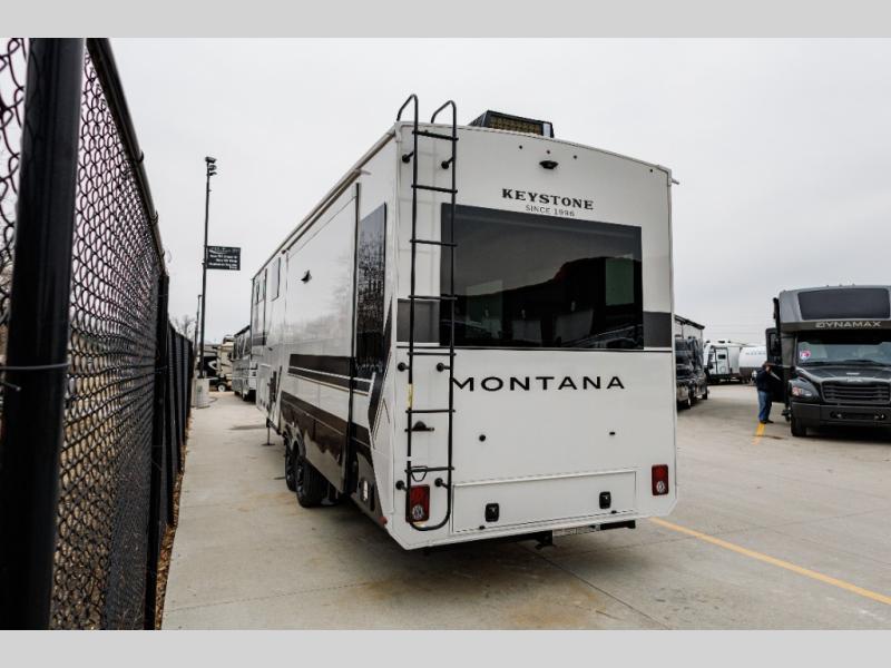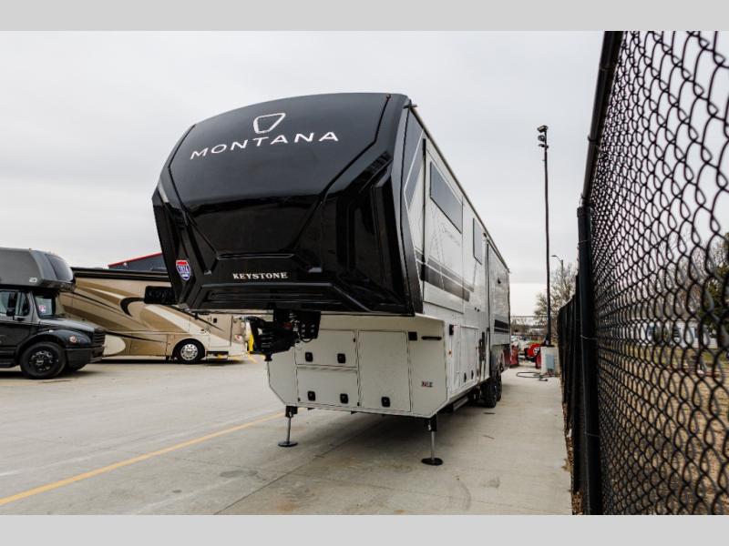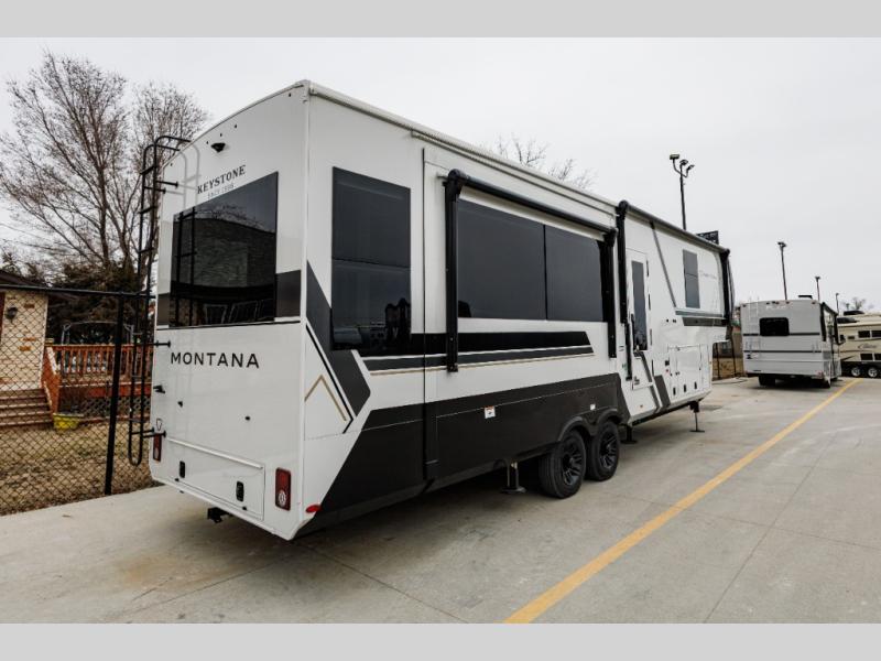 Enjoy luxury, innovation, and the outdoors in any one of Montana's finest fifth wheels. Each set the standard with exceptional features, and exciting factory installed options to provide you a great home on the road. Keystone's 12" I-beam chassis with z-frame technology provides a strong and durable foundation to your fifth wheel, and the four-season living package will help extend your camping season. There are also square frameless windows outside, along with storage solutions, and a hydraulic leveling system that will have you set up in no-time! Inside, you'll love the hardwood cabinetry, solid surface countertops, spacious showers, and cozy bedrooms!