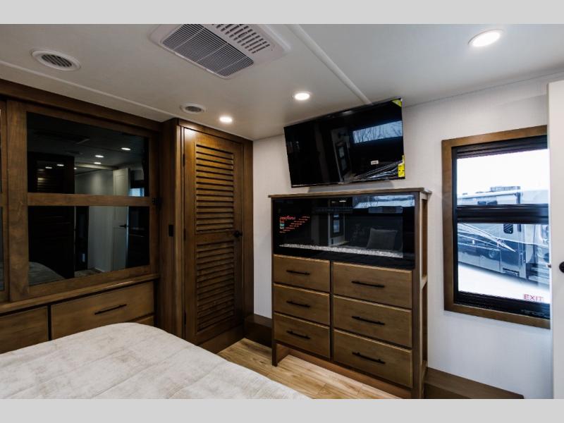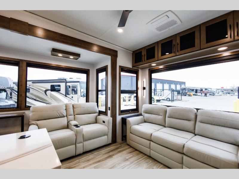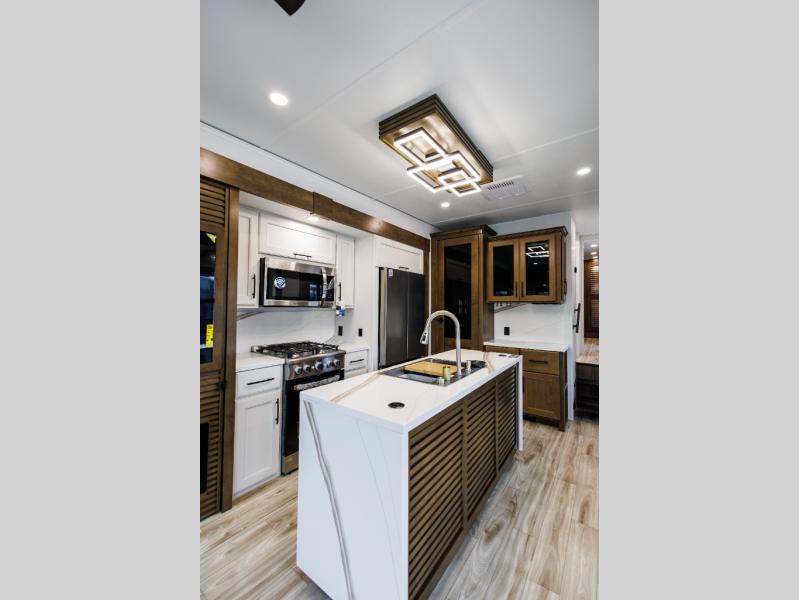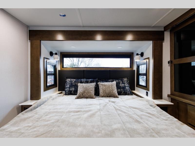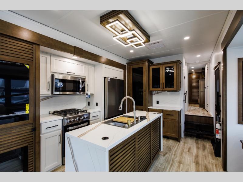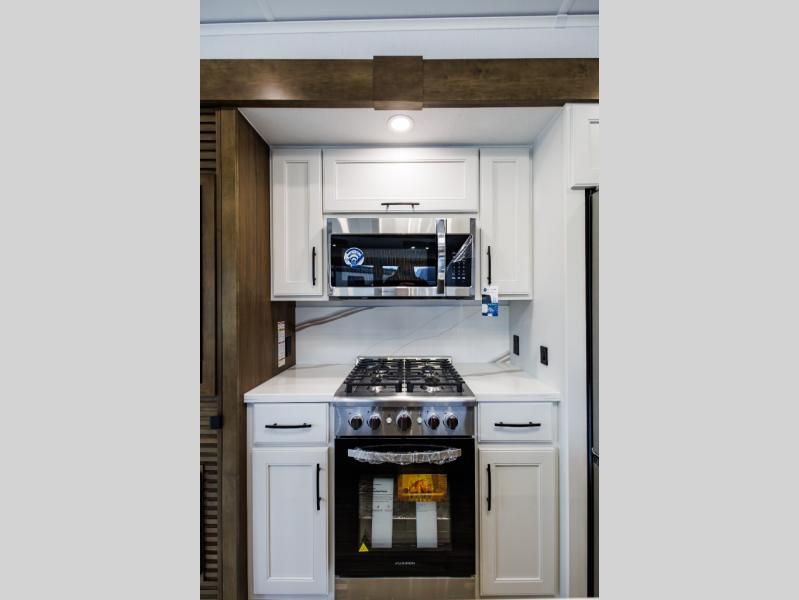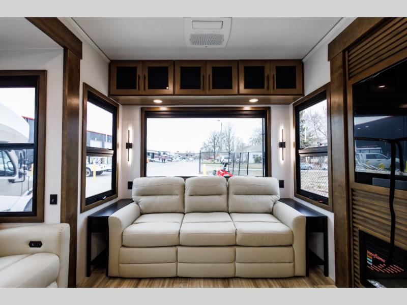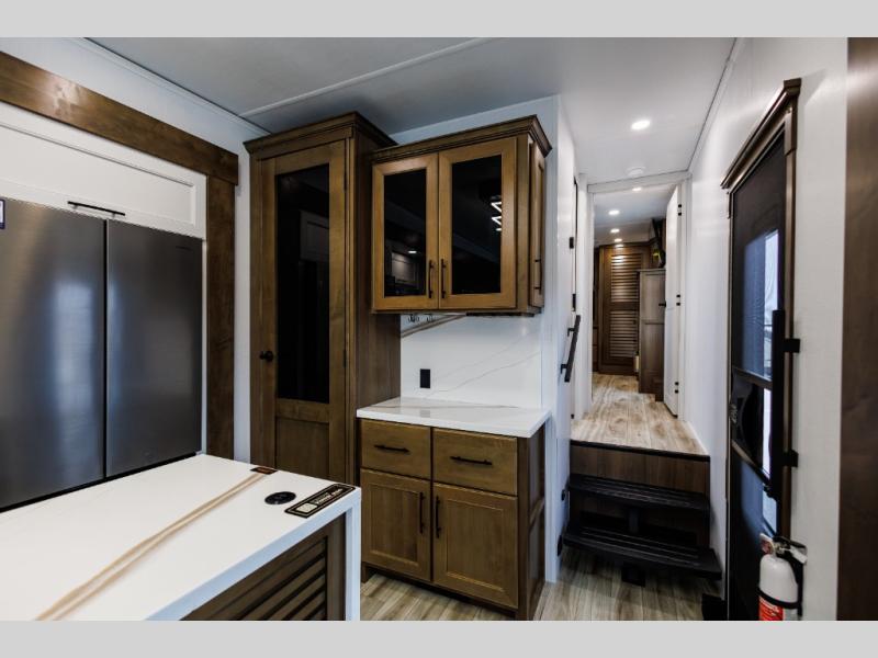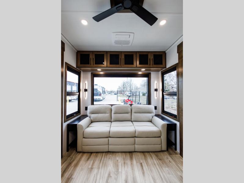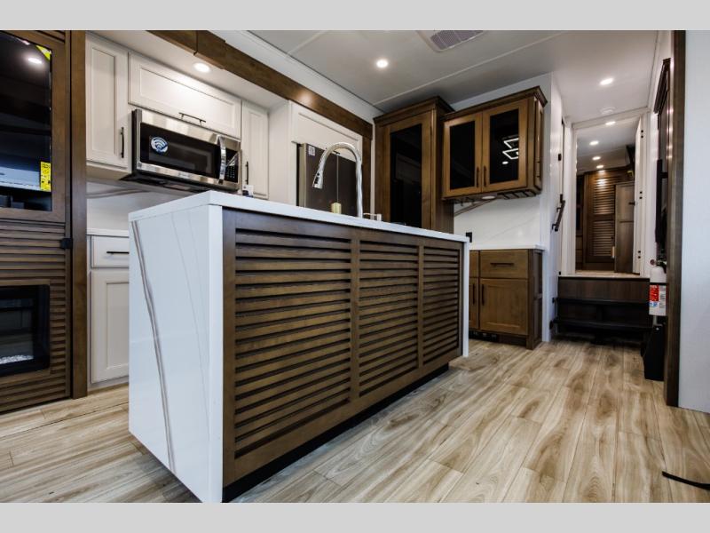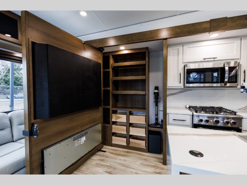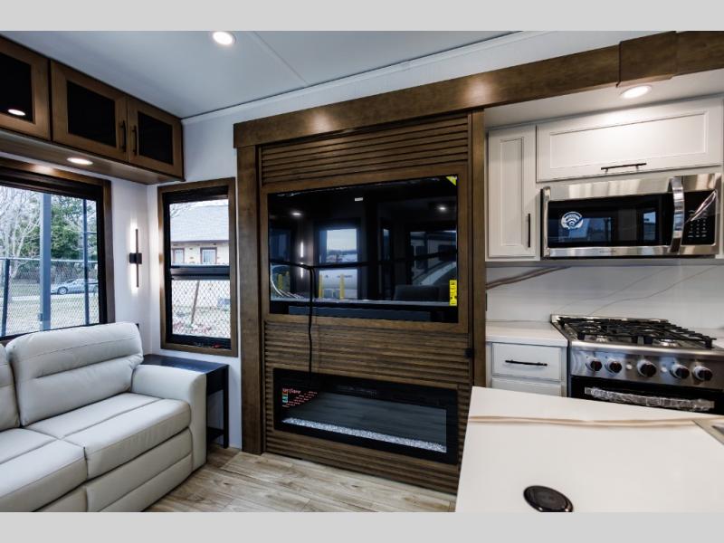 It won't be hard to find comfort in this fifth wheel with triple slides for more space, a spacious front bedroom, and a rear living area with a comfy sofa! Once you've unloaded the exterior pull-out storage tray, you can put out the two awnings, then relax in your camp chairs. A four-burner range inside will let you make lunch for your crew, and a spacious kitchen island will provide more counter space. There is also a pantry, overhead cabinets, plus a second, swing-out hidden pantry behind the entertainment center with a fireplace. The pull-out dinette, power theater seating, and rear sofa will give you plenty of seating options, and the dual opposing slides in the combined kitchen and living area will create an open floorplan you are sure to love. Head towards the front to freshen up in the spacious bath with ample counter space, then enjoy a perfect night's rest in the front bedroom, complete with a king bed slide, dual nightstands, front wardrobe, plus a second wardrobe with washer and dryer prep.