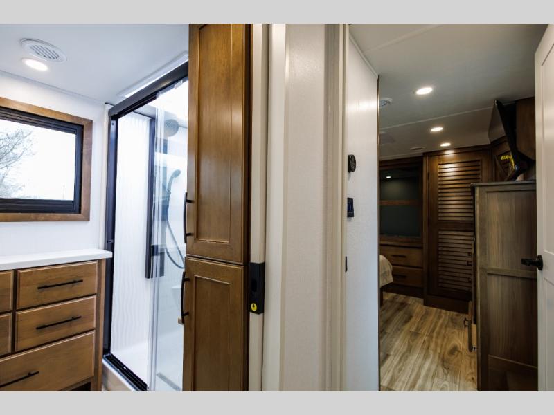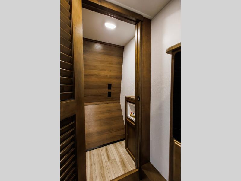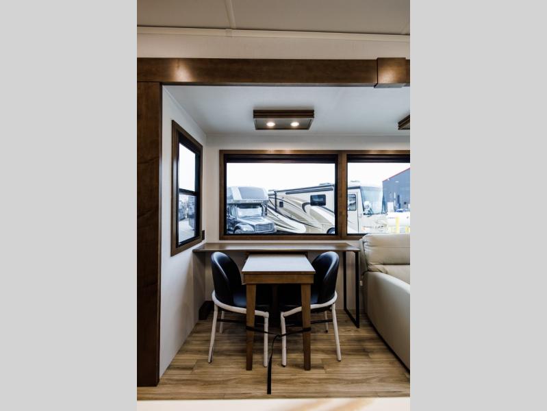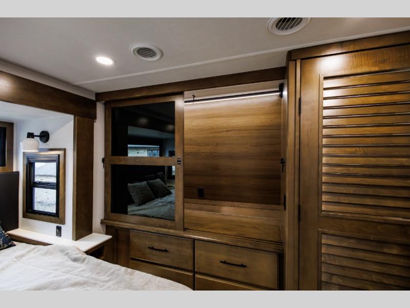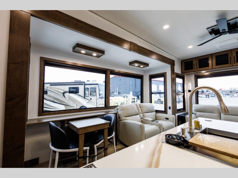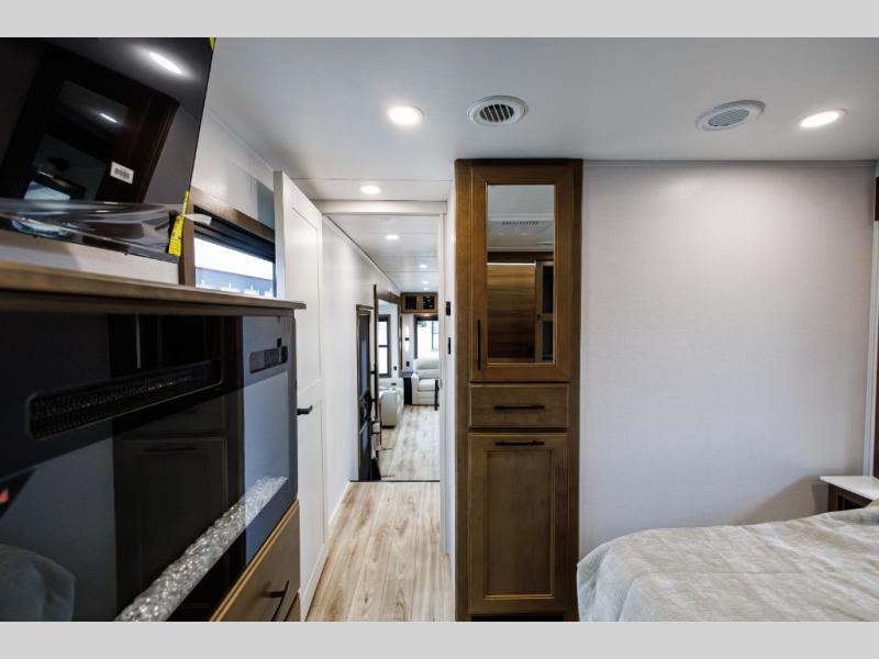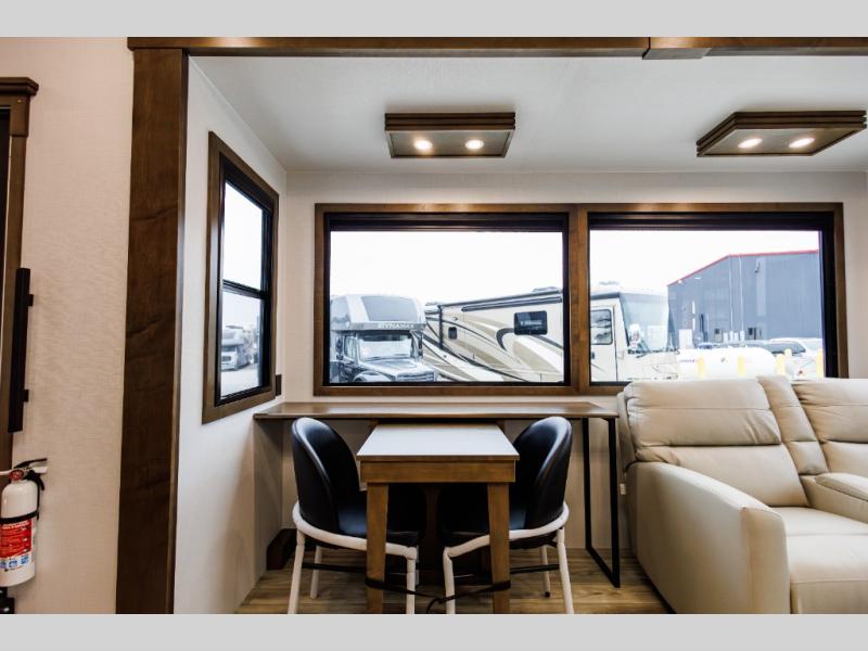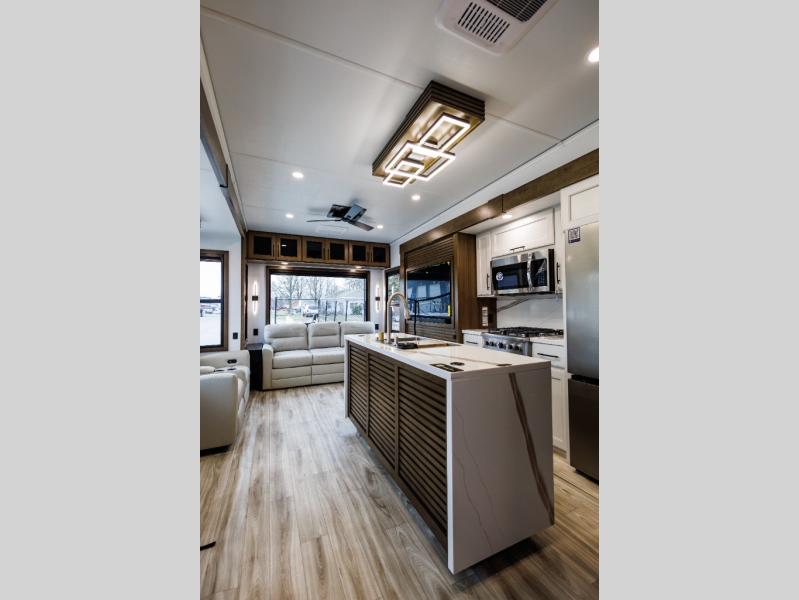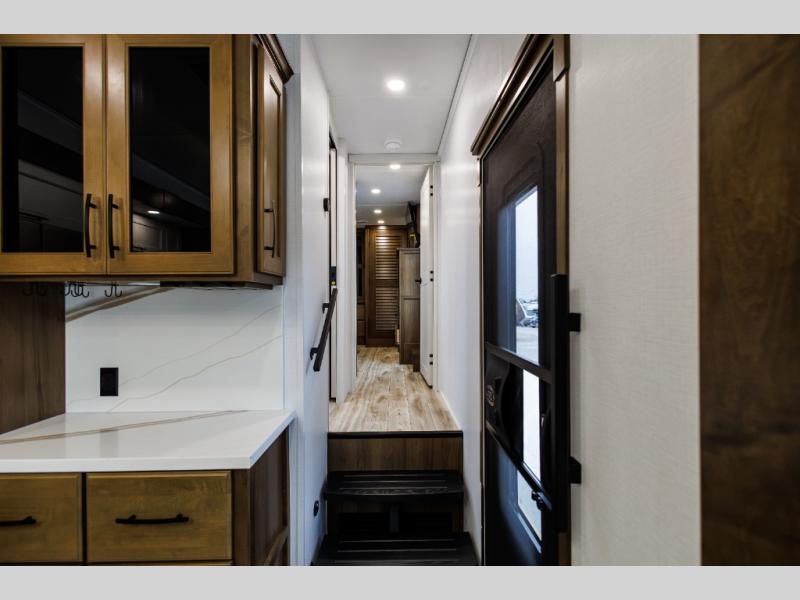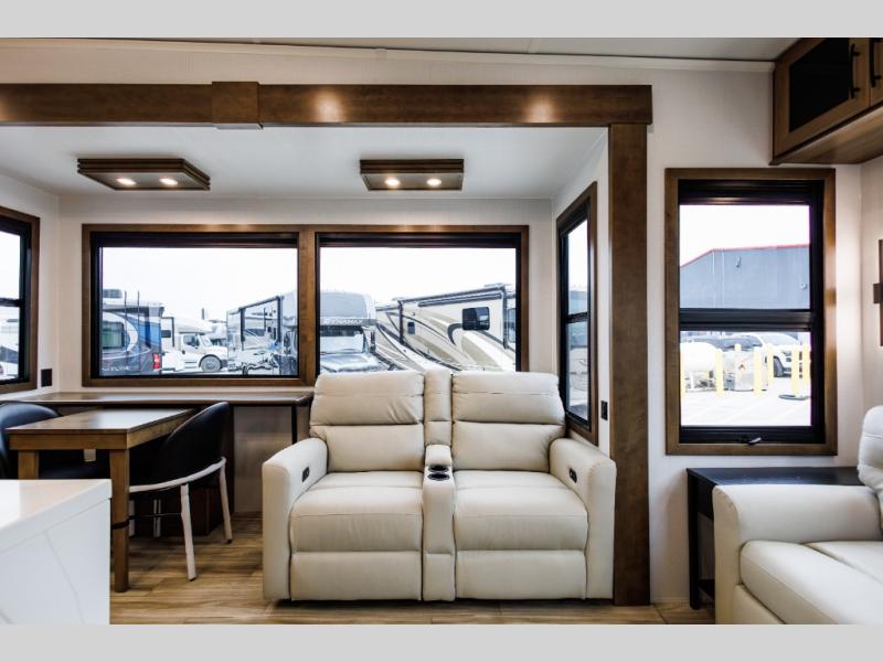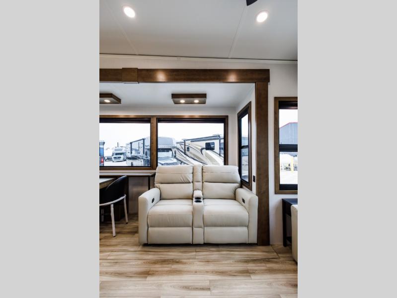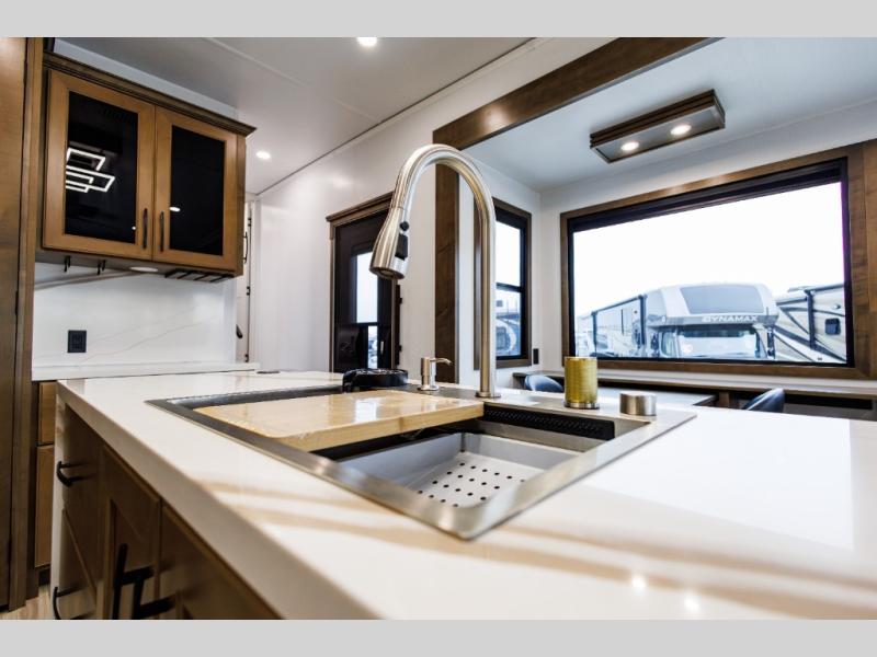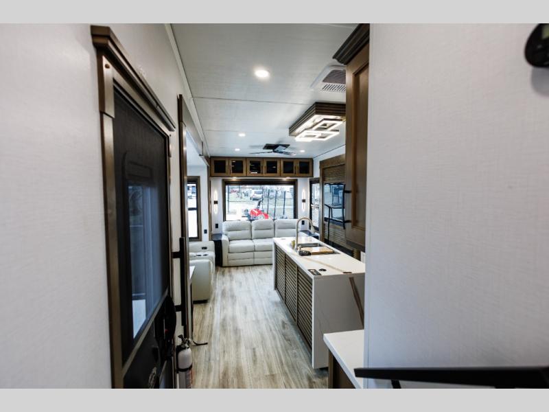 It won't be hard to find comfort in this fifth wheel with triple slides for more space, a spacious front bedroom, and a rear living area with a comfy sofa! Once you've unloaded the exterior pull-out storage tray, you can put out the two awnings, then relax in your camp chairs. A four-burner range inside will let you make lunch for your crew, and a spacious kitchen island will provide more counter space. There is also a pantry, overhead cabinets, plus a second, swing-out hidden pantry behind the entertainment center with a fireplace. The pull-out dinette, power theater seating, and rear sofa will give you plenty of seating options, and the dual opposing slides in the combined kitchen and living area will create an open floorplan you are sure to love. Head towards the front to freshen up in the spacious bath with ample counter space, then enjoy a perfect night's rest in the front bedroom, complete with a king bed slide, dual nightstands, front wardrobe, plus a second wardrobe with washer and dryer prep.