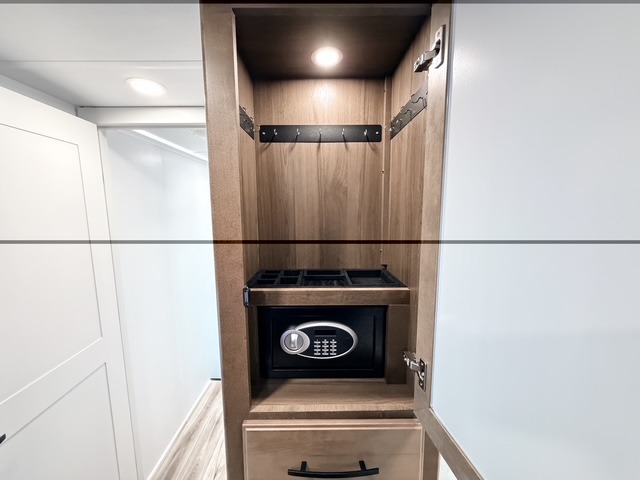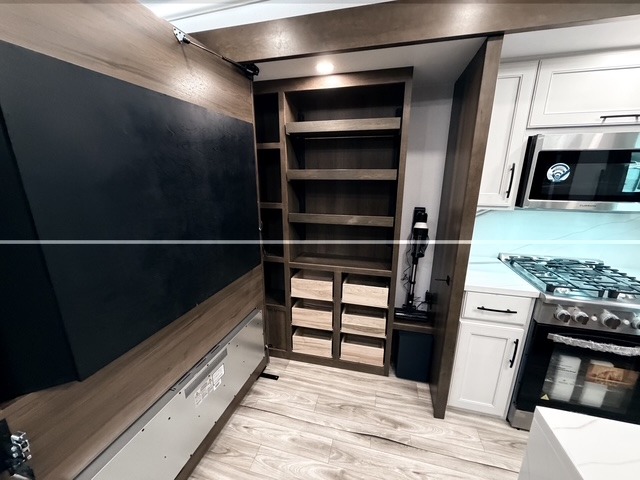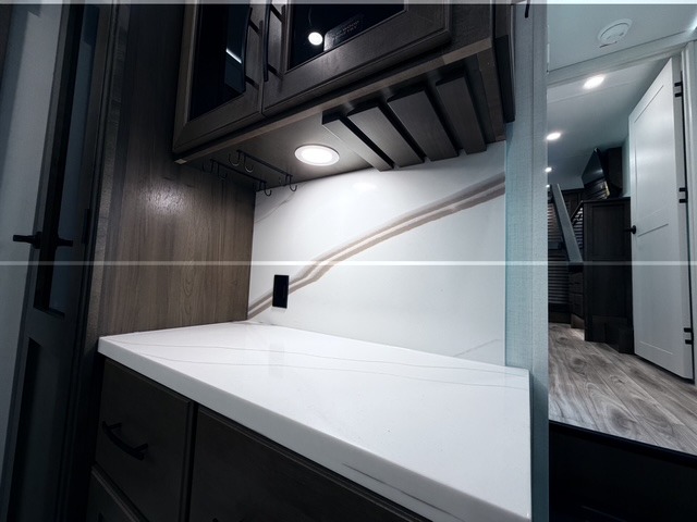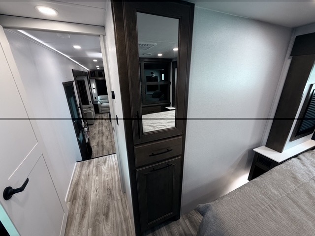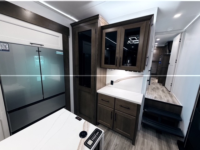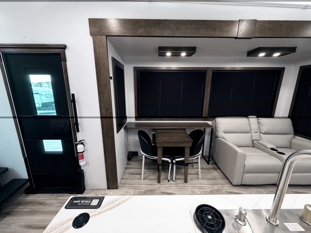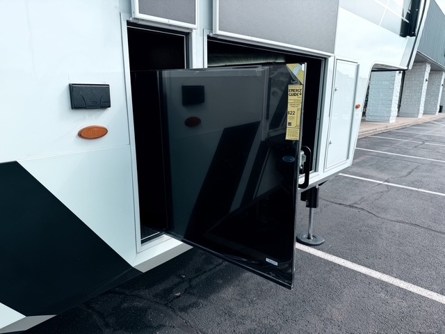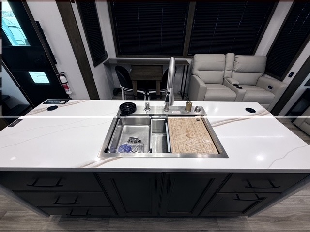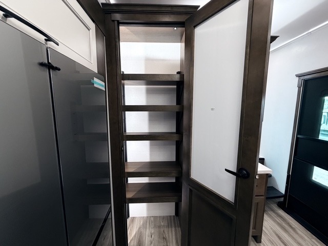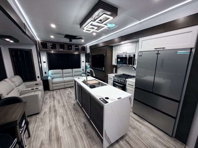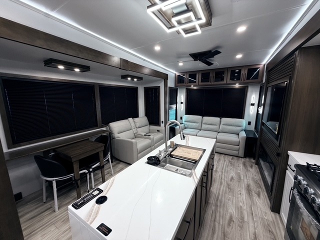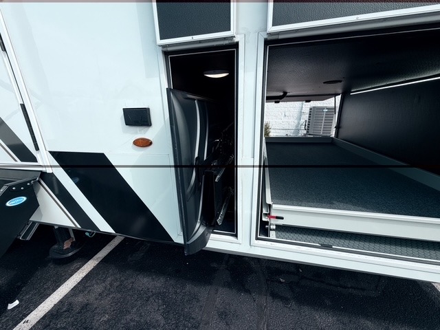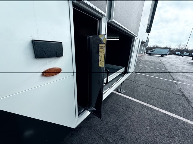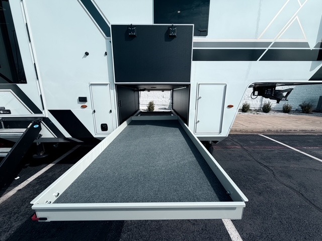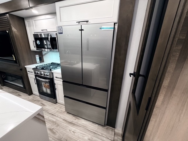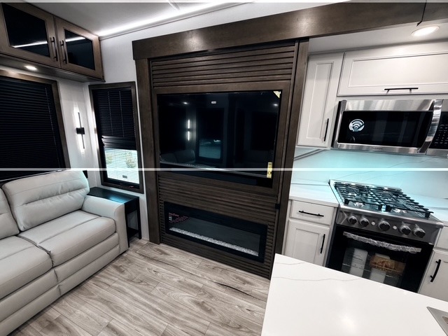 It won't be hard to find comfort in this fifth wheel with triple slides for more space, a spacious front bedroom, and a rear living area with a comfy sofa! Once you've unloaded the exterior pull-out storage tray, you can put out the two awnings, then relax in your camp chairs. A four-burner range inside will let you make lunch for your crew, and a spacious kitchen island will provide more counter space. There is also a pantry, overhead cabinets, plus a second, swing-out hidden pantry behind the entertainment center with a fireplace. The pull-out dinette, power theater seating, and rear sofa will give you plenty of seating options, and the dual opposing slides in the combined kitchen and living area will create an open floorplan you are sure to love. Head towards the front to freshen up in the spacious bath with ample counter space, then enjoy a perfect night's rest in the front bedroom, complete with a king bed slide, dual nightstands, front wardrobe, plus a second wardrobe with washer and dryer prep.