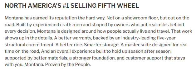 Enjoy luxury, innovation, and the outdoors in any one of Montana's finest fifth wheels. Each set the standard with exceptional features, and exciting factory installed options to provide you a great home on the road. Keystone's 12" I-beam chassis with z-frame technology provides a strong and durable foundation to your fifth wheel, and the four-season living package will help extend your camping season. There are also square frameless windows outside, along with storage solutions, and a hydraulic leveling system that will have you set up in no-time! Inside, you'll love the hardwood cabinetry, solid surface countertops, spacious showers, and cozy bedrooms!