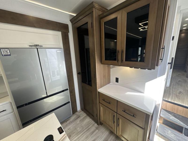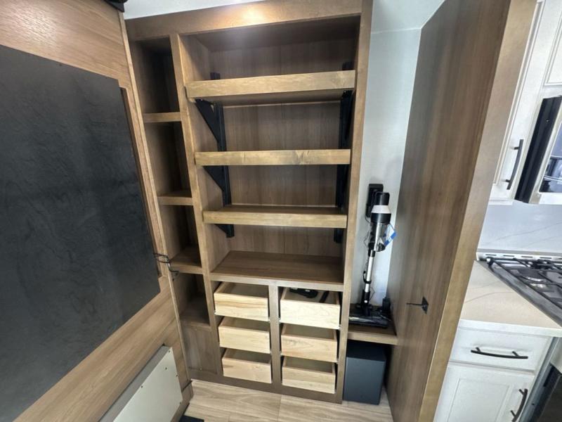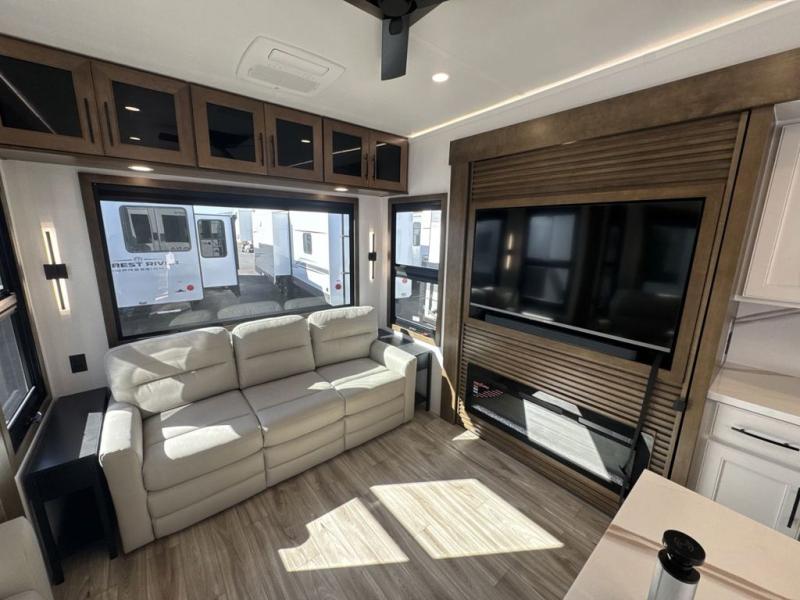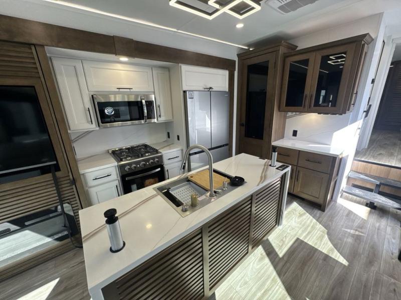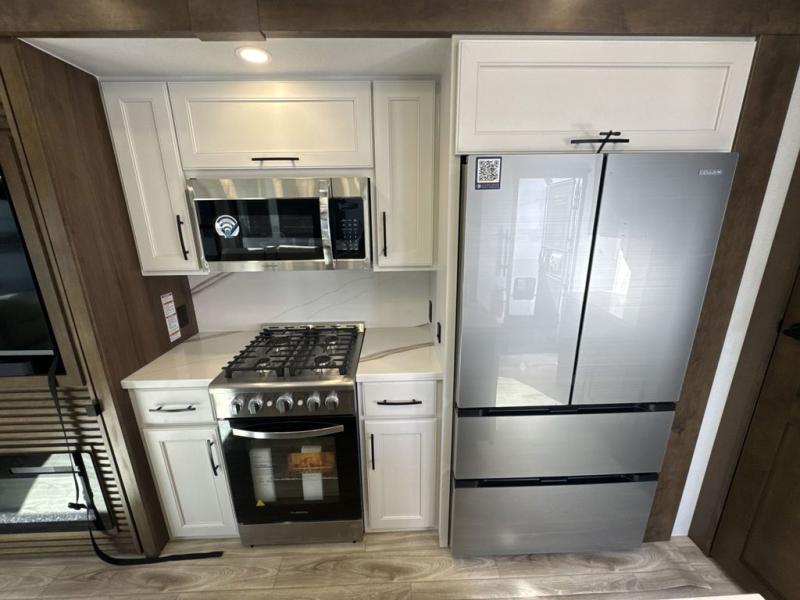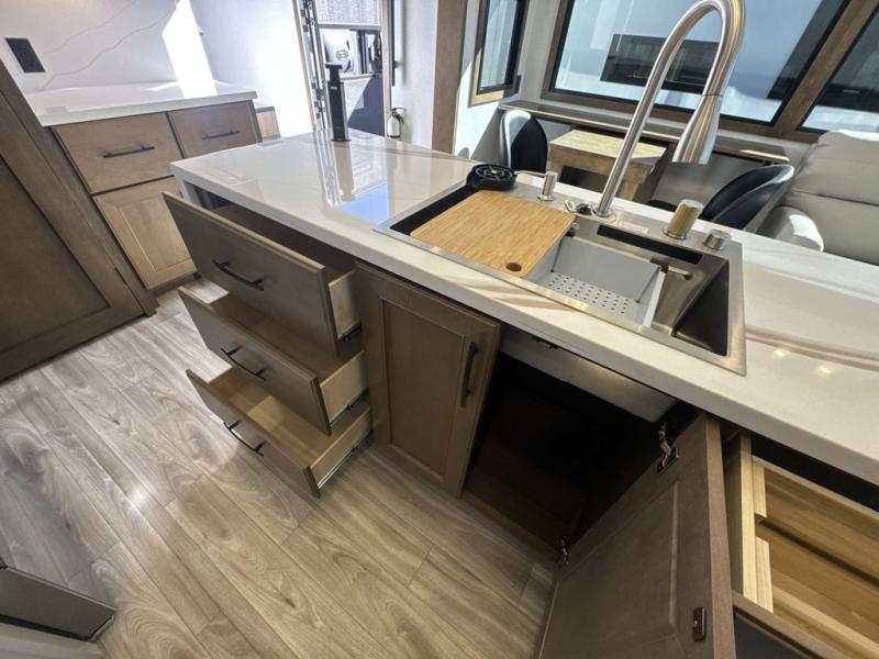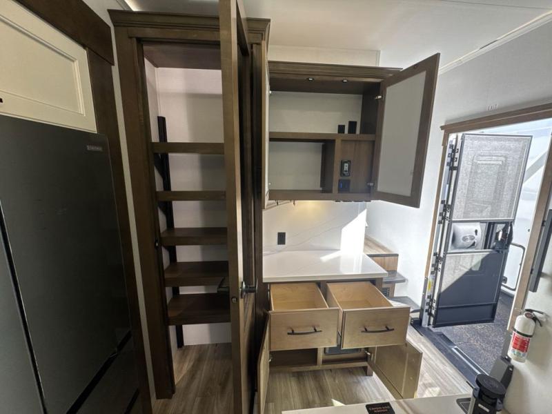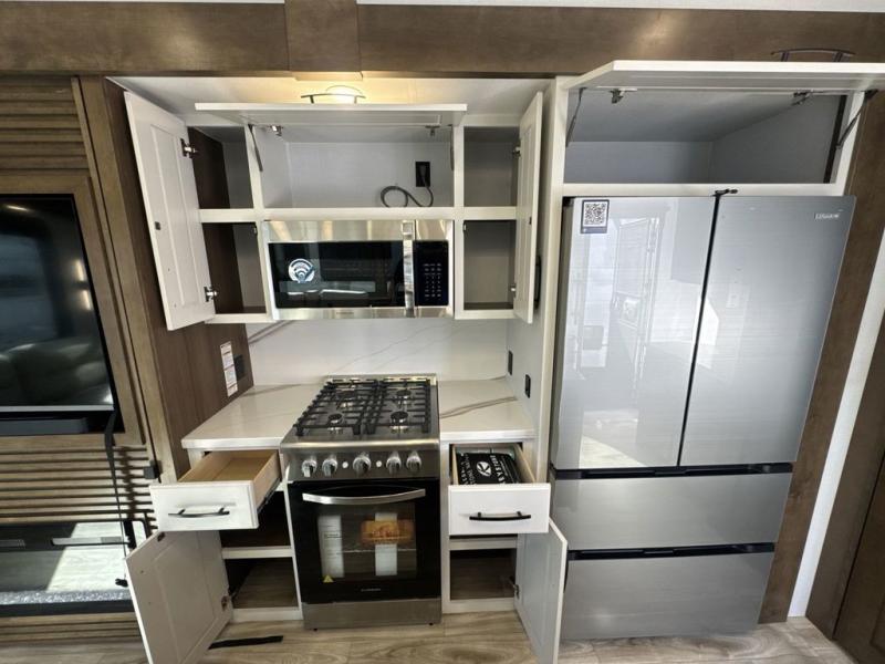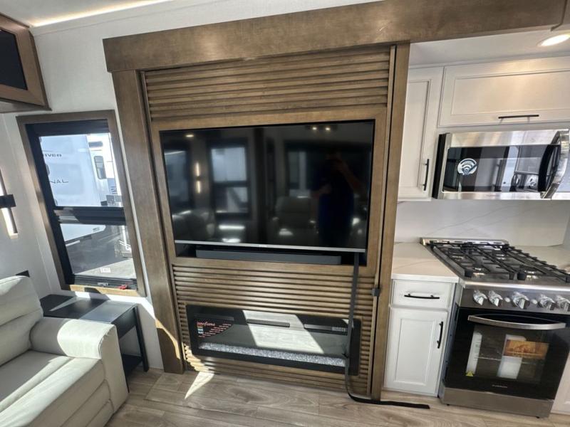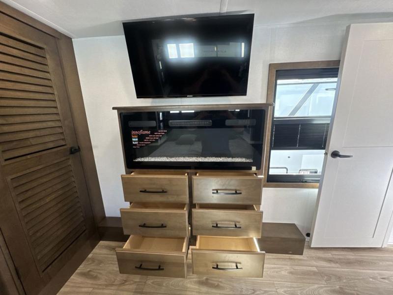 It won't be hard to find comfort in this fifth wheel with triple slides for more space, a spacious front bedroom, and a rear living area with a comfy sofa! Once you've unloaded the exterior pull-out storage tray, you can put out the two awnings, then relax in your camp chairs. A four-burner range inside will let you make lunch for your crew, and a spacious kitchen island will provide more counter space. There is also a pantry, overhead cabinets, plus a second, swing-out hidden pantry behind the entertainment center with a fireplace. The pull-out dinette, power theater seating, and rear sofa will give you plenty of seating options, and the dual opposing slides in the combined kitchen and living area will create an open floorplan you are sure to love. Head towards the front to freshen up in the spacious bath with ample counter space, then enjoy a perfect night's rest in the front bedroom, complete with a king bed slide, dual nightstands, front wardrobe, plus a second wardrobe with washer and dryer prep.