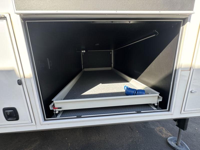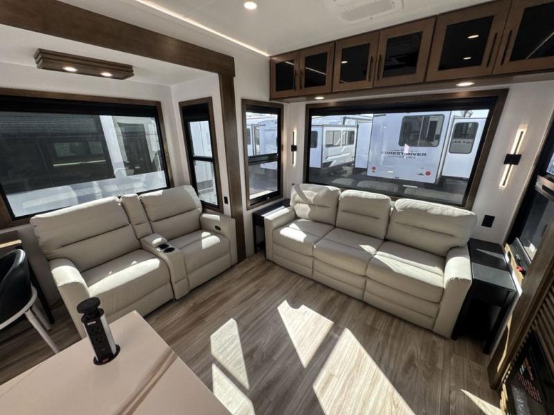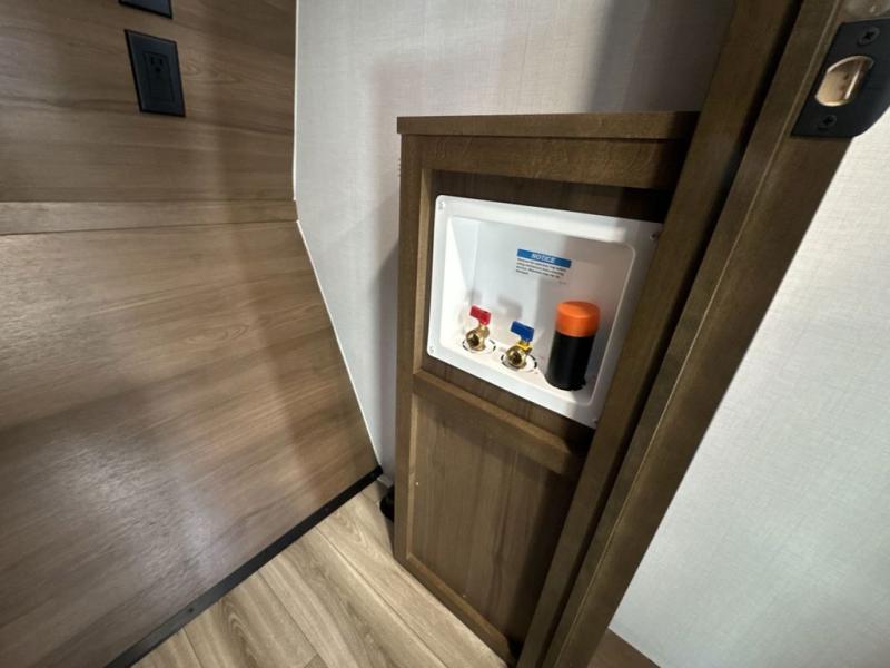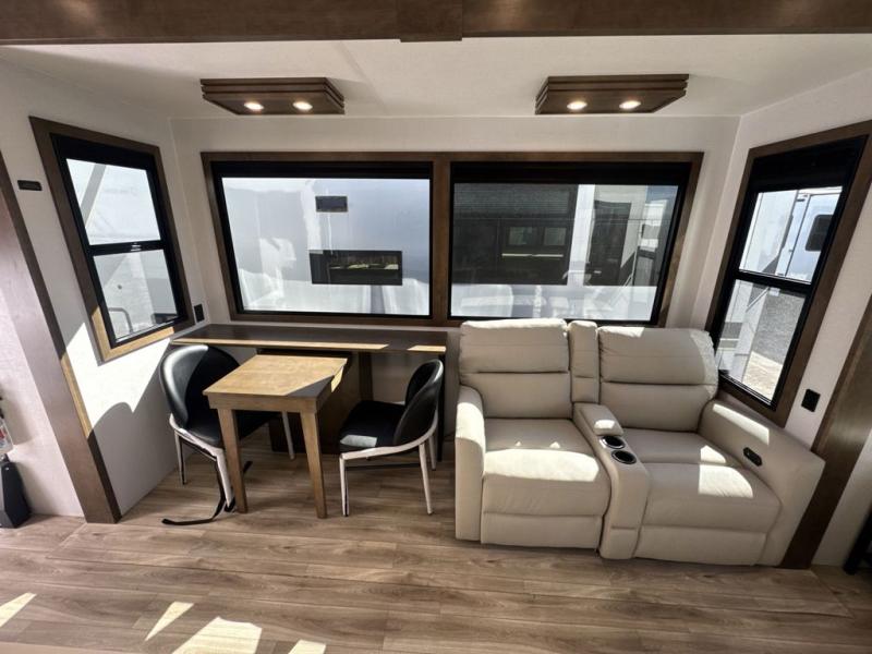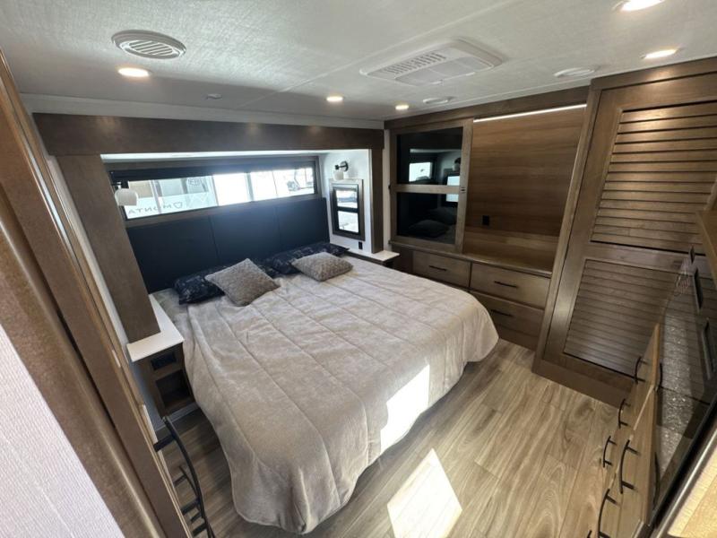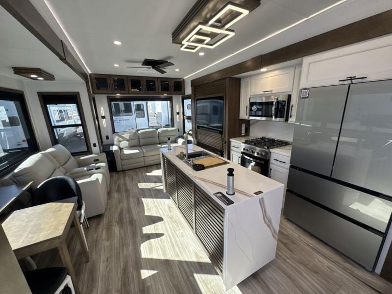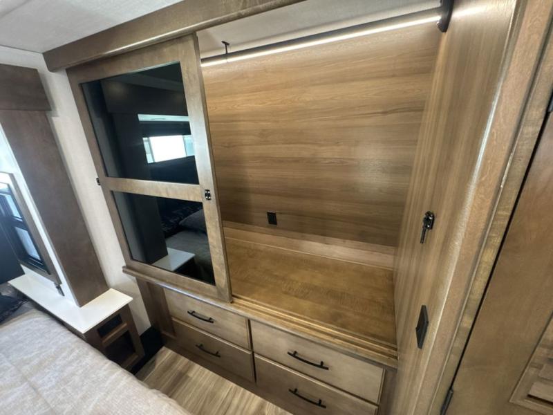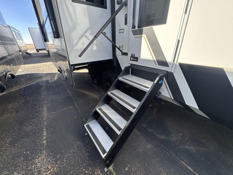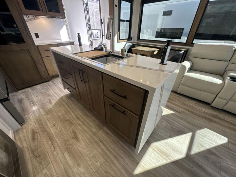 It won't be hard to find comfort in this fifth wheel with triple slides for more space, a spacious front bedroom, and a rear living area with a comfy sofa! Once you've unloaded the exterior pull-out storage tray, you can put out the two awnings, then relax in your camp chairs. A four-burner range inside will let you make lunch for your crew, and a spacious kitchen island will provide more counter space. There is also a pantry, overhead cabinets, plus a second, swing-out hidden pantry behind the entertainment center with a fireplace. The pull-out dinette, power theater seating, and rear sofa will give you plenty of seating options, and the dual opposing slides in the combined kitchen and living area will create an open floorplan you are sure to love. Head towards the front to freshen up in the spacious bath with ample counter space, then enjoy a perfect night's rest in the front bedroom, complete with a king bed slide, dual nightstands, front wardrobe, plus a second wardrobe with washer and dryer prep.