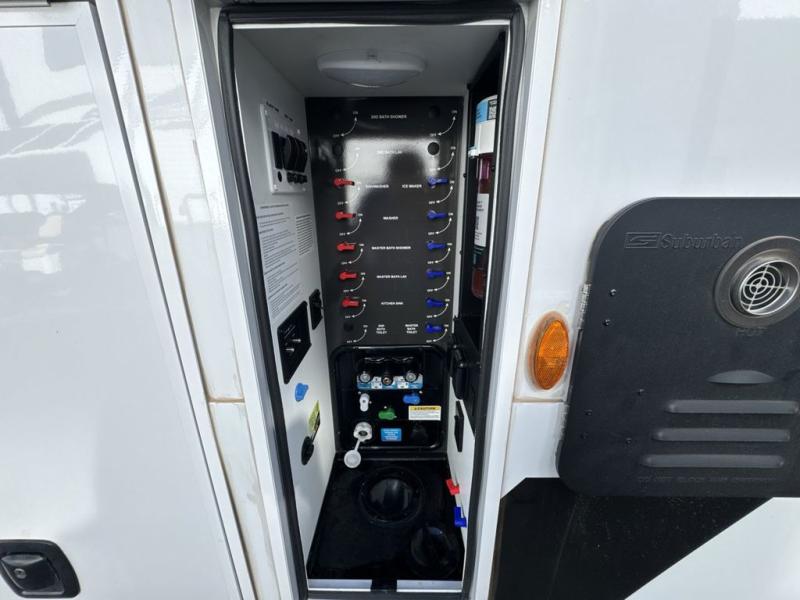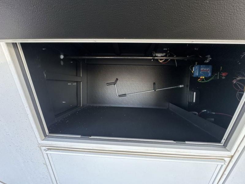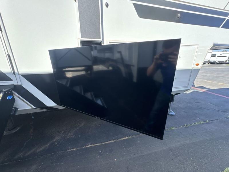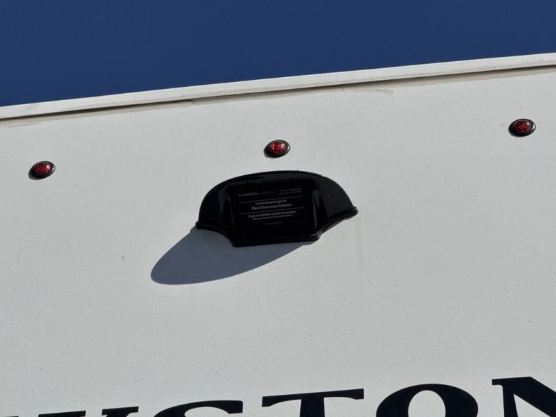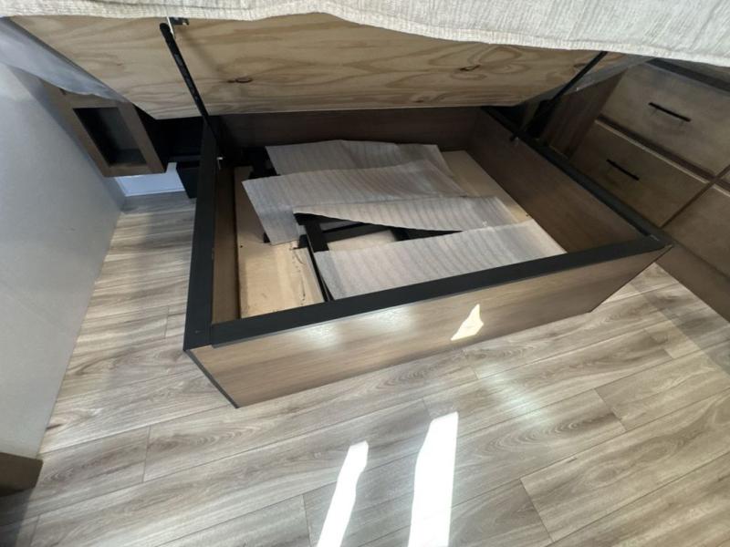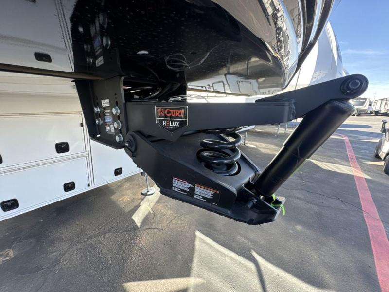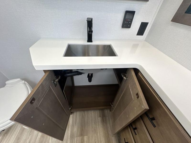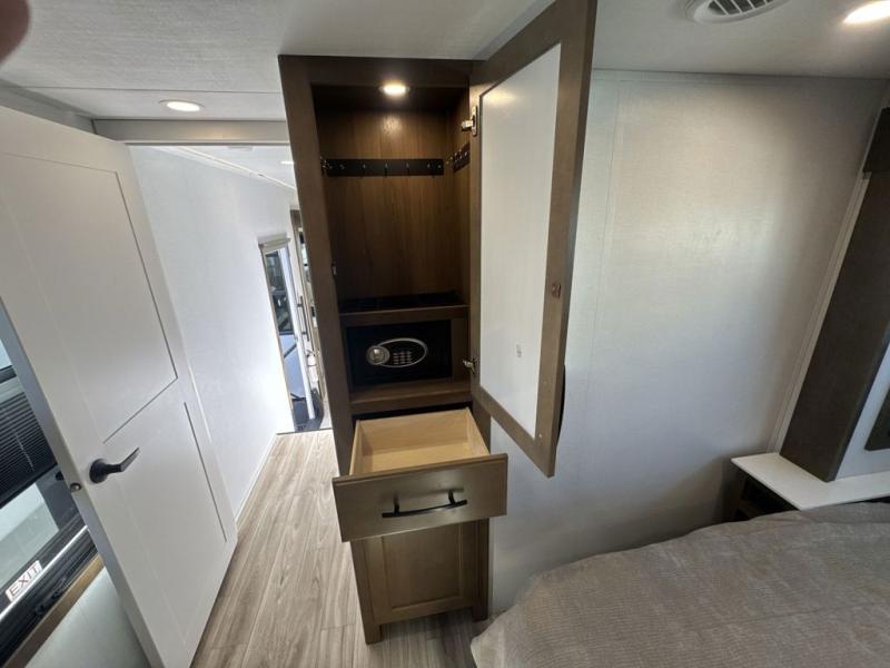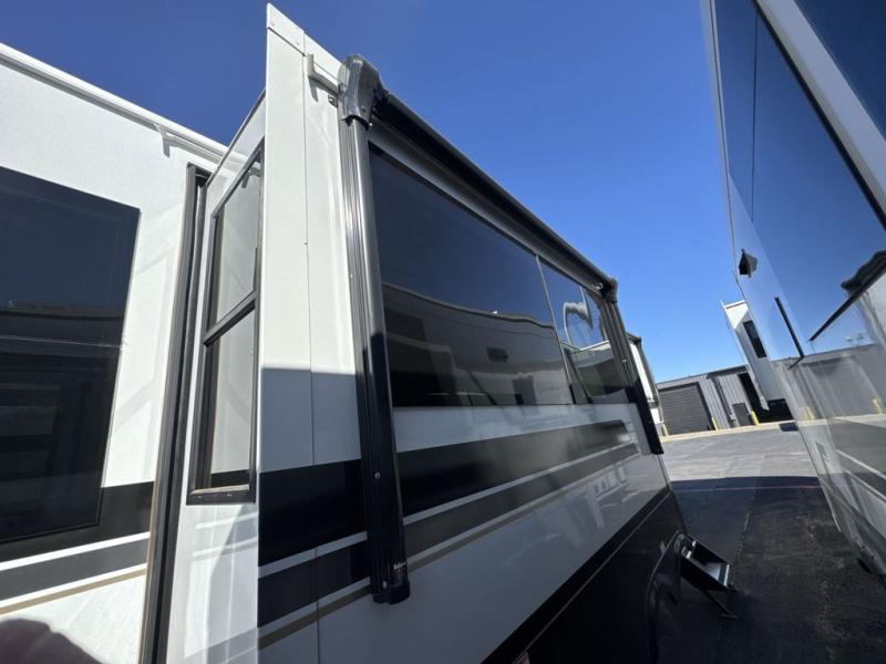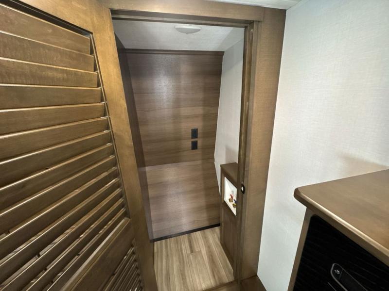 It won't be hard to find comfort in this fifth wheel with triple slides for more space, a spacious front bedroom, and a rear living area with a comfy sofa! Once you've unloaded the exterior pull-out storage tray, you can put out the two awnings, then relax in your camp chairs. A four-burner range inside will let you make lunch for your crew, and a spacious kitchen island will provide more counter space. There is also a pantry, overhead cabinets, plus a second, swing-out hidden pantry behind the entertainment center with a fireplace. The pull-out dinette, power theater seating, and rear sofa will give you plenty of seating options, and the dual opposing slides in the combined kitchen and living area will create an open floorplan you are sure to love. Head towards the front to freshen up in the spacious bath with ample counter space, then enjoy a perfect night's rest in the front bedroom, complete with a king bed slide, dual nightstands, front wardrobe, plus a second wardrobe with washer and dryer prep.