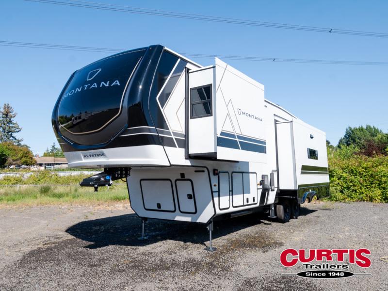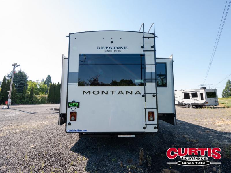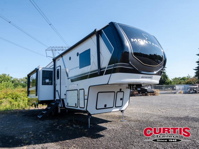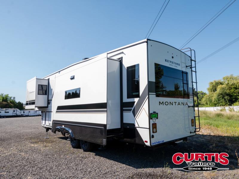Enjoy luxury, innovation, and the outdoors in any one of Montana's finest fifth wheels. Each set the standard with exceptional features, and exciting factory installed options to provide you a great home on the road. Keystone's 12" I-beam chassis with z-frame technology provides a strong and durable foundation to your fifth wheel, and the four season living package will help extend your camping season. A few other construction features you will appreciate include a MORryde CRE3000 suspension, a fully walkable roof with an alpha seamless TPO membrane system, and 4k square frameless tinted safety glass windows. Each feature stylish interiors with two decor choices paired with beautiful hardwood cabinetry, Beauflor vinyl flooring throughout, central vacuum, plus a La-Z-Boy furniture package for all-around comfort!