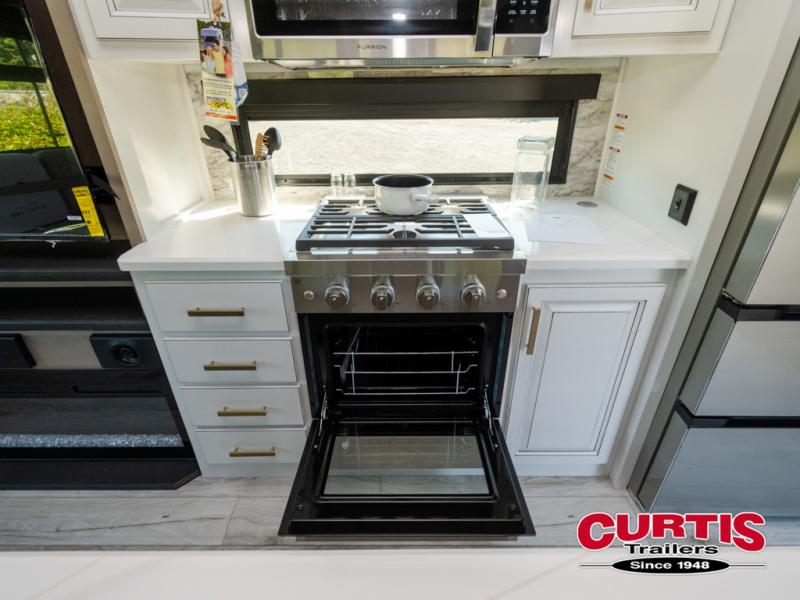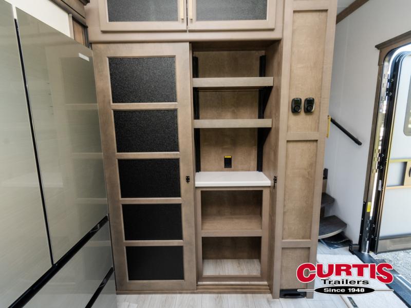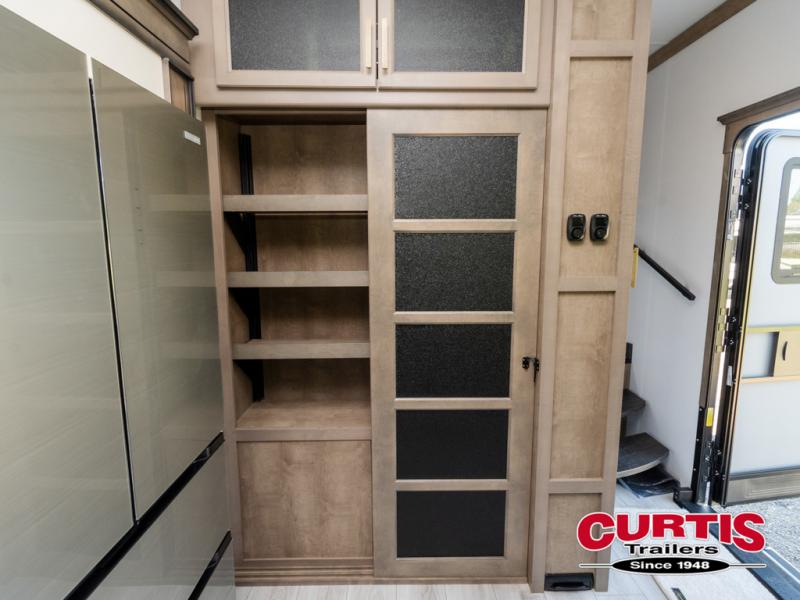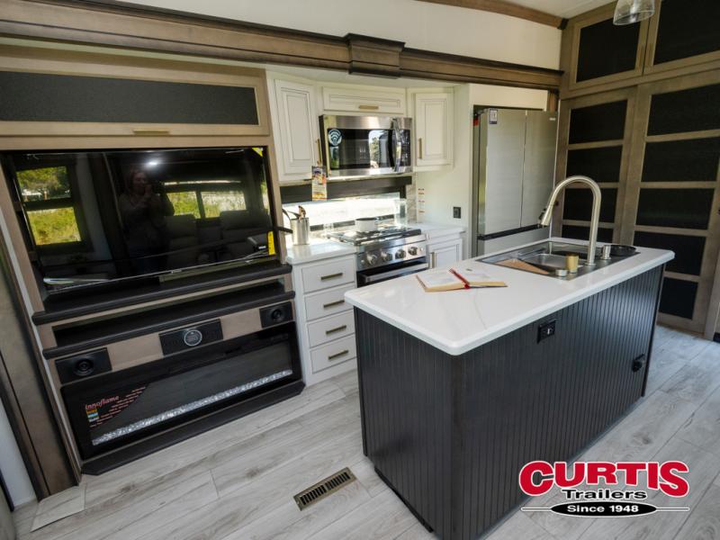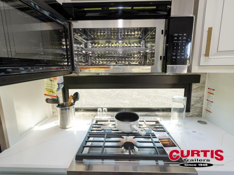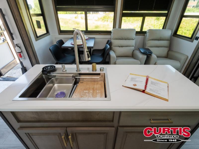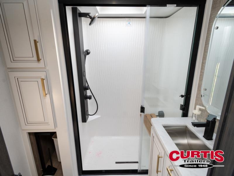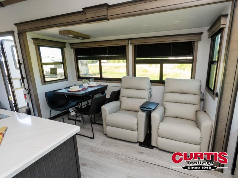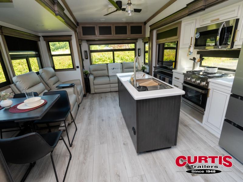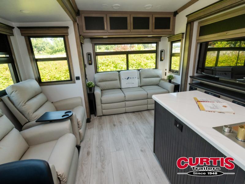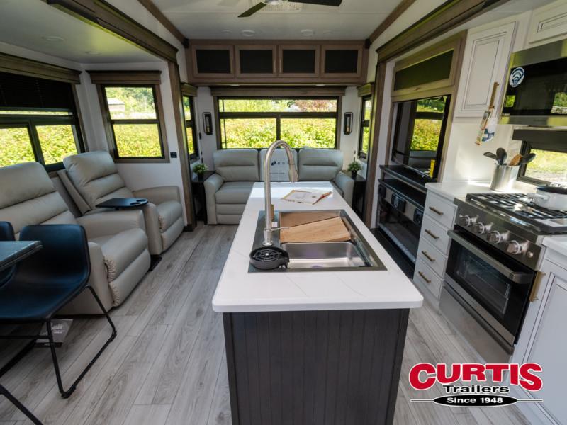 Luxury abounds throughout this fifth wheel! Starting in the kitchen with the island, pull down storage panty, 24" range, and residential convection microwave. The full bathroom has a 48" x 30" fiberglass shower with a seat, decorative glass enclosure, and a skylight above it for more natural lighting. Sleep like a baby in the front private bedroom on the king bed slide with storage underneath and keep your clothes looking their best with the front closet that has dual closets and additional storage. The rear living area offers true relaxation with a hide-a-bed sofa and residential power recliners, and there is a pivot dinette where you can dine at.