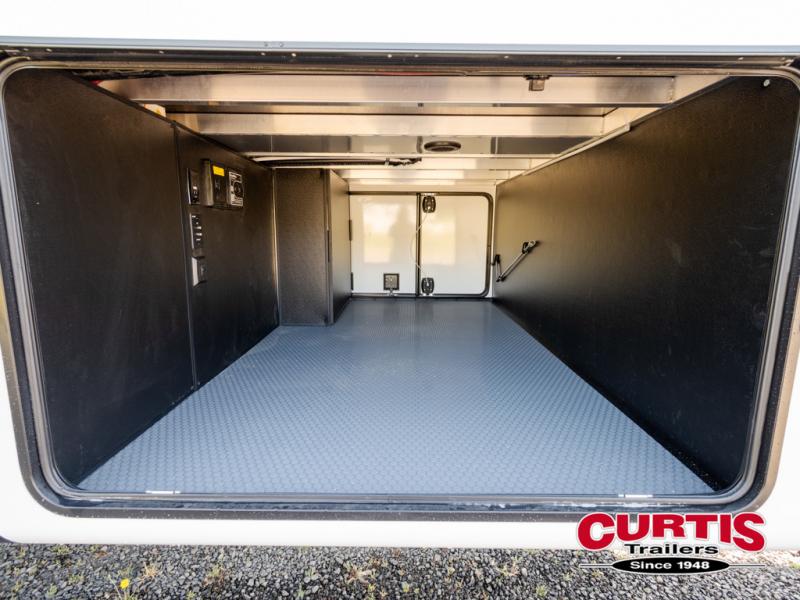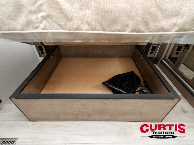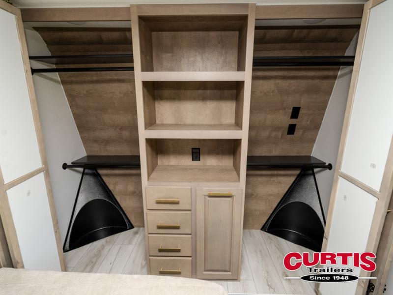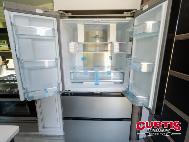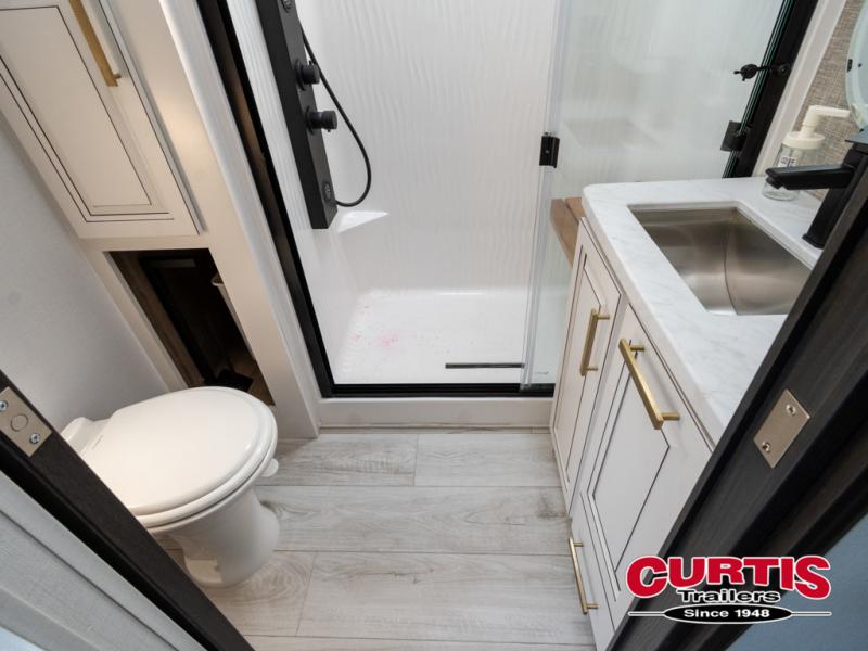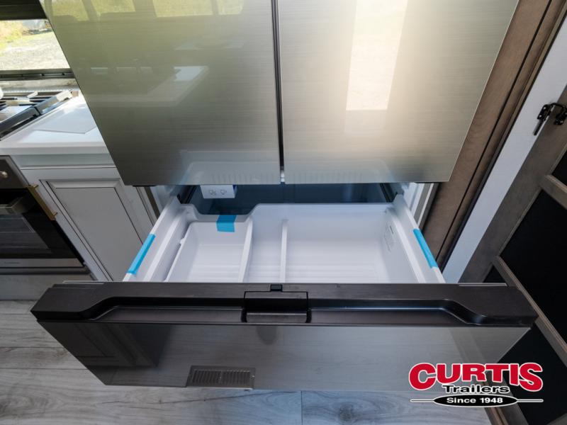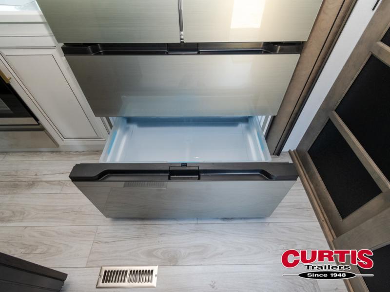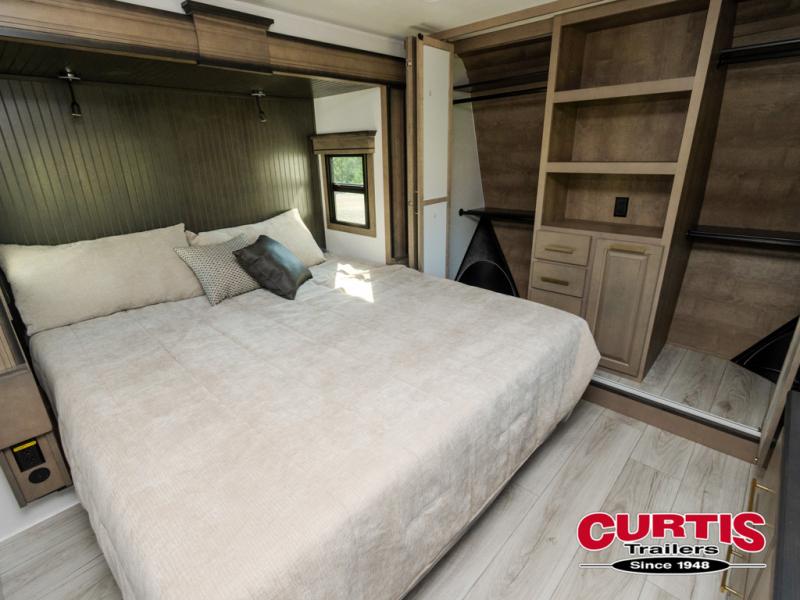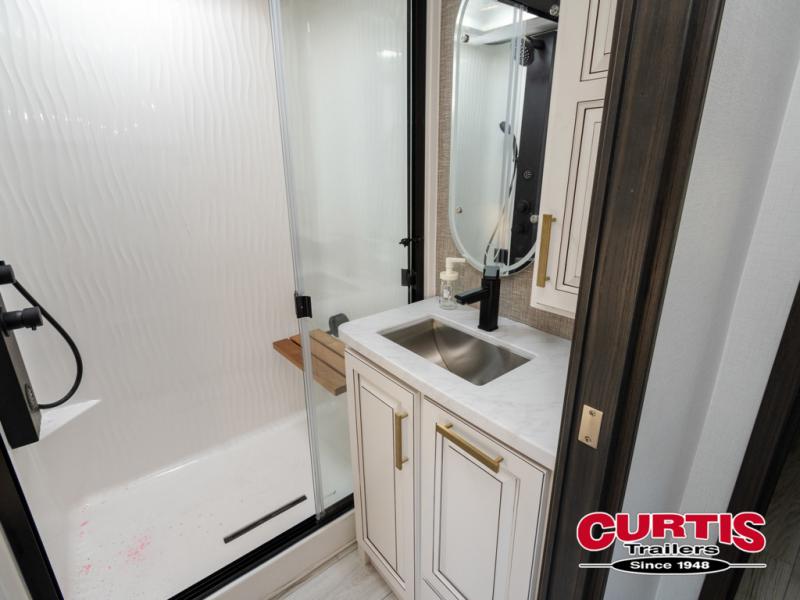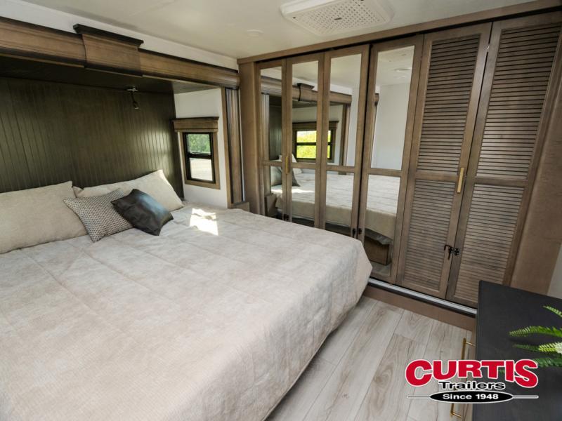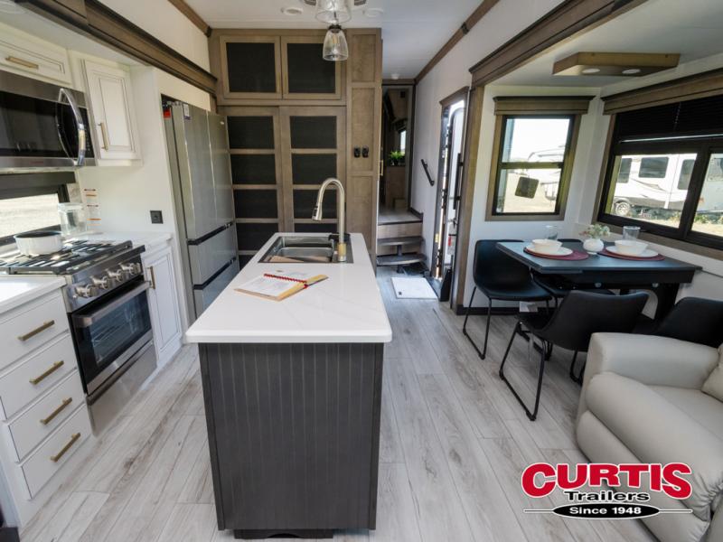 Luxury abounds throughout this fifth wheel! Starting in the kitchen with the island, pull down storage panty, 24" range, and residential convection microwave. The full bathroom has a 48" x 30" fiberglass shower with a seat, decorative glass enclosure, and a skylight above it for more natural lighting. Sleep like a baby in the front private bedroom on the king bed slide with storage underneath and keep your clothes looking their best with the front closet that has dual closets and additional storage. The rear living area offers true relaxation with a hide-a-bed sofa and residential power recliners, and there is a pivot dinette where you can dine at.