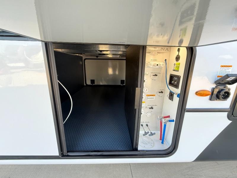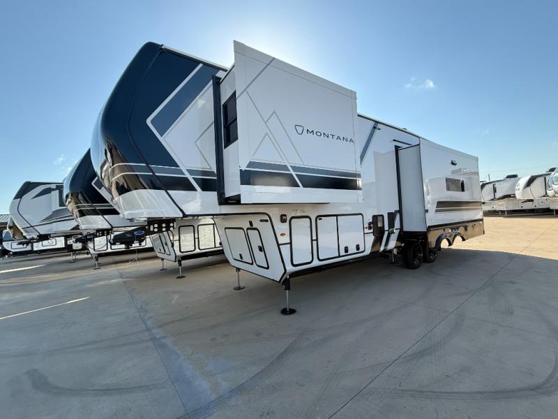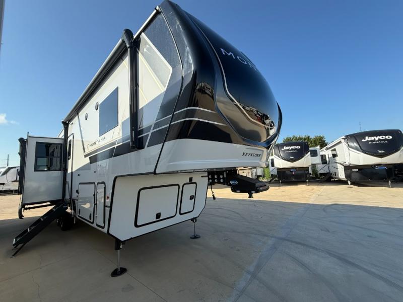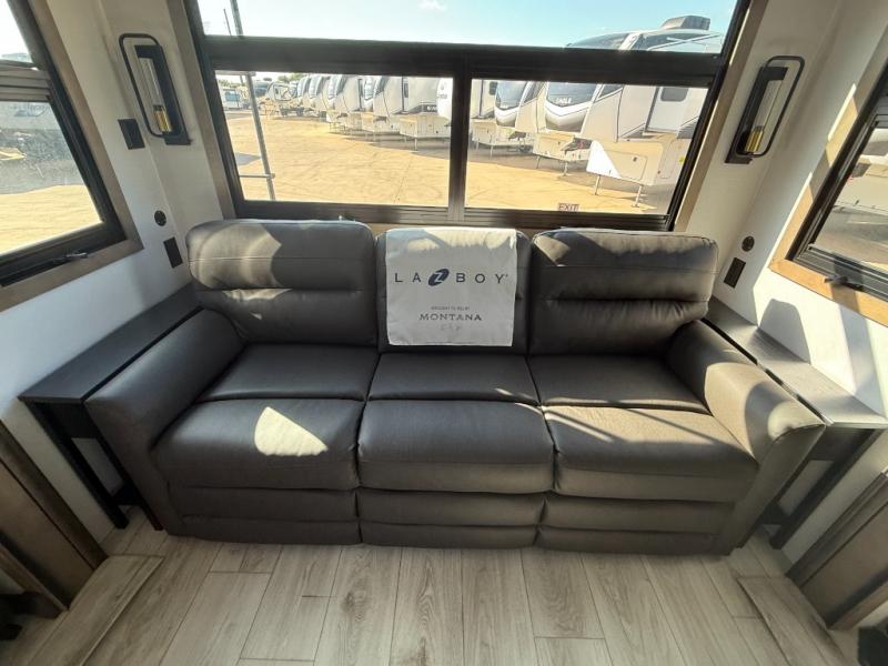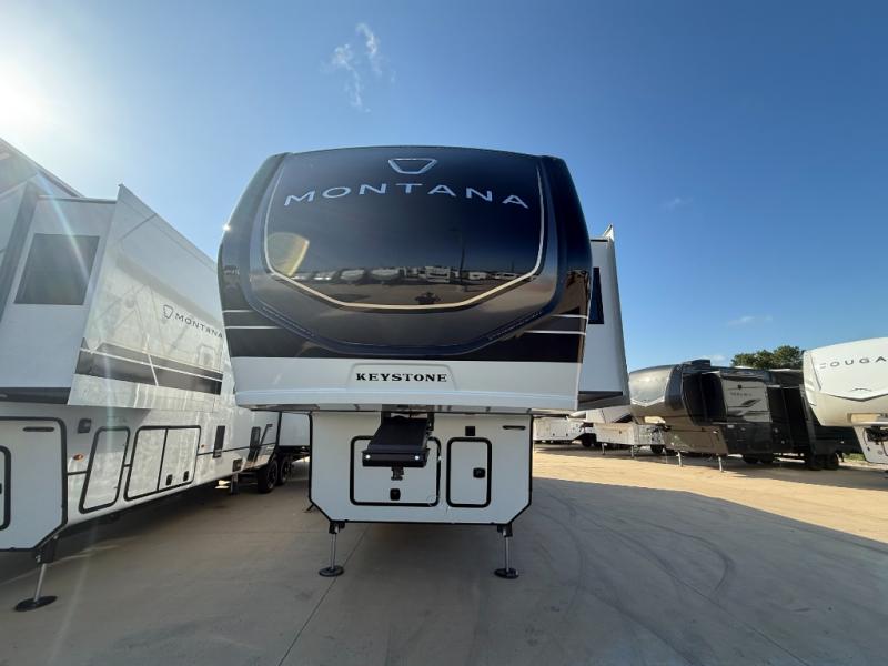 Enjoy luxury, innovation, and the outdoors in any one of Montana's finest fifth wheels. Each set the standard with exceptional features, and exciting factory installed options to provide you a great home on the road. Keystone's 12" I-beam chassis with z-frame technology provides a strong and durable foundation to your fifth wheel, and the four season living package will help extend your camping season. A few other construction features you will appreciate include a MORryde CRE3000 suspension, a fully walkable roof with an alpha seamless TPO membrane system, and 4k square frameless tinted safety glass windows. Each feature stylish interiors with two decor choices paired with beautiful hardwood cabinetry, Beauflor vinyl flooring throughout, central vacuum, plus a La-Z-Boy furniture package for all-around comfort!