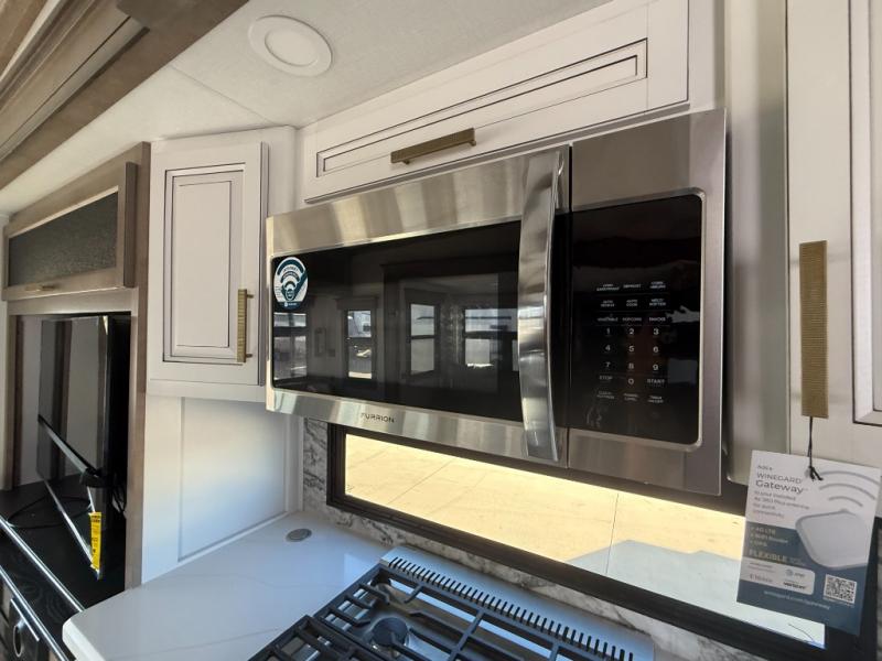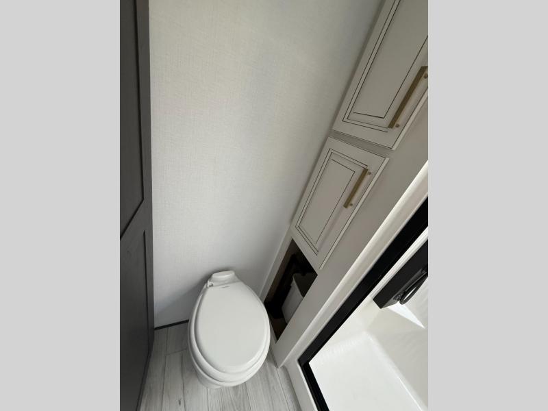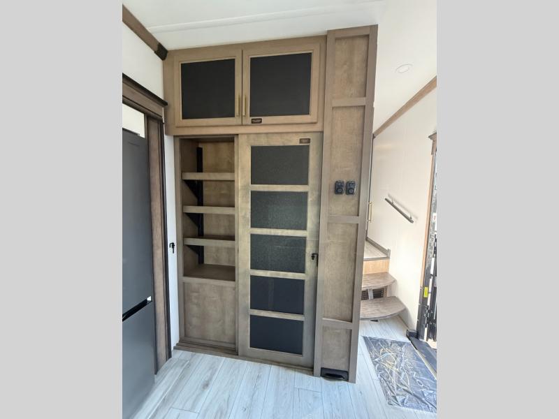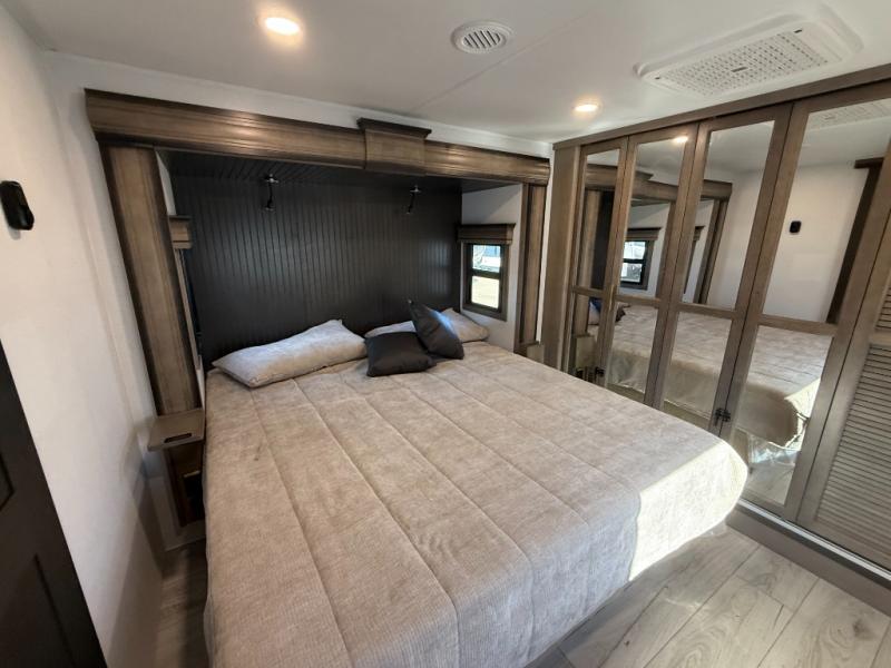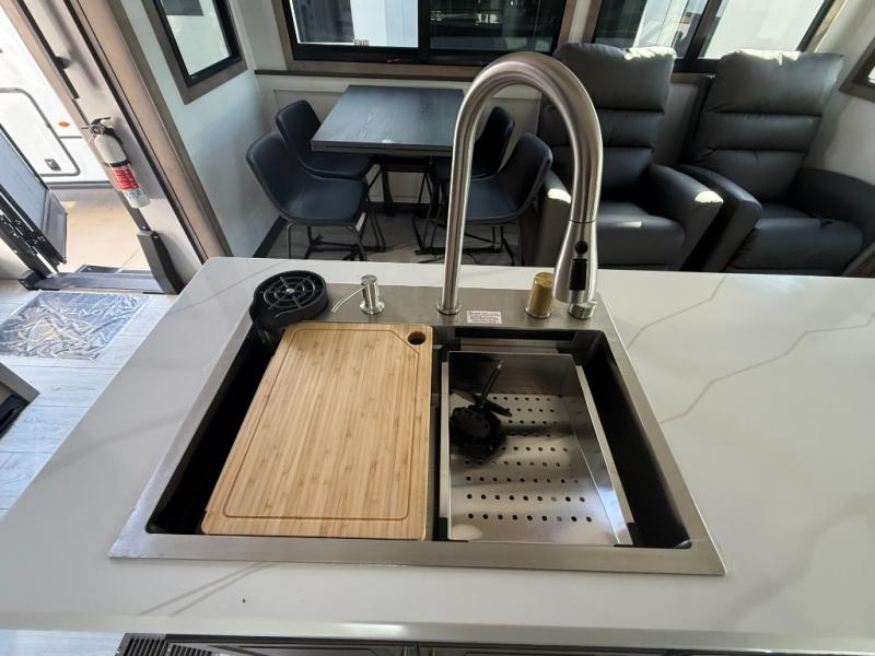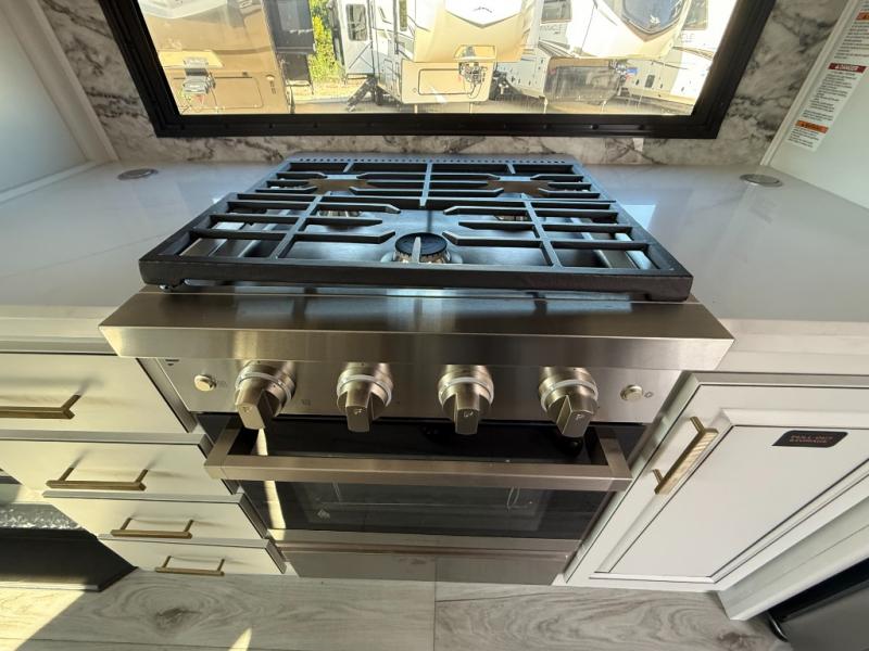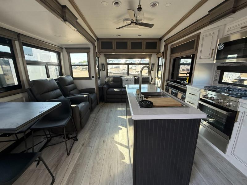 Luxury abounds throughout this fifth wheel! Starting in the kitchen with the island, pull down storage panty, 24" range, and residential convection microwave. The full bathroom has a 48" x 30" fiberglass shower with a seat, decorative glass enclosure, and a skylight above it for more natural lighting. Sleep like a baby in the front private bedroom on the king bed slide with storage underneath and keep your clothes looking their best with the front closet that has dual closets and additional storage. The rear living area offers true relaxation with a hide-a-bed sofa and residential power recliners, and there is a pivot dinette where you can dine at.