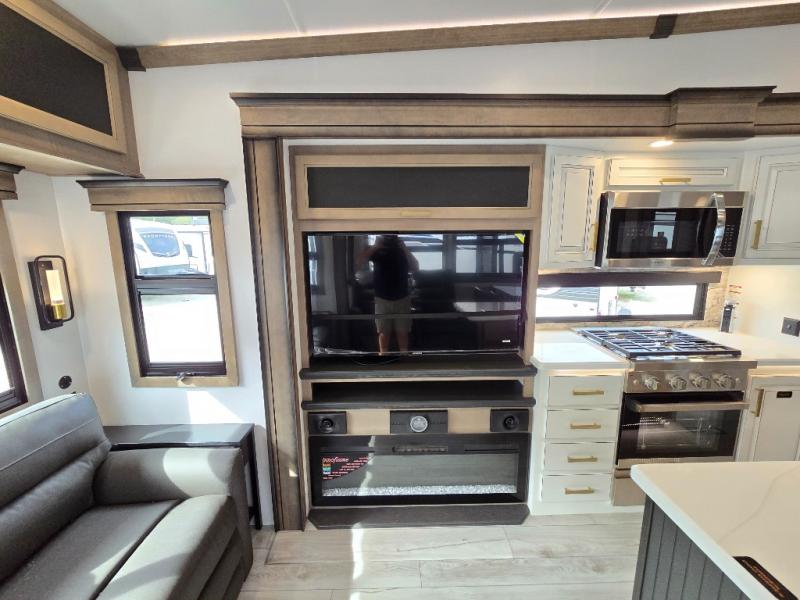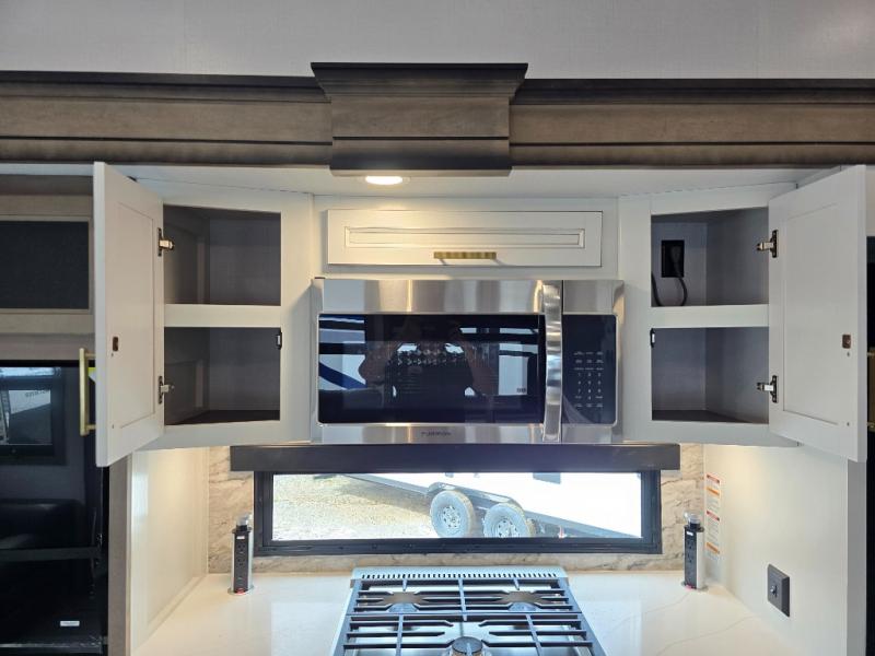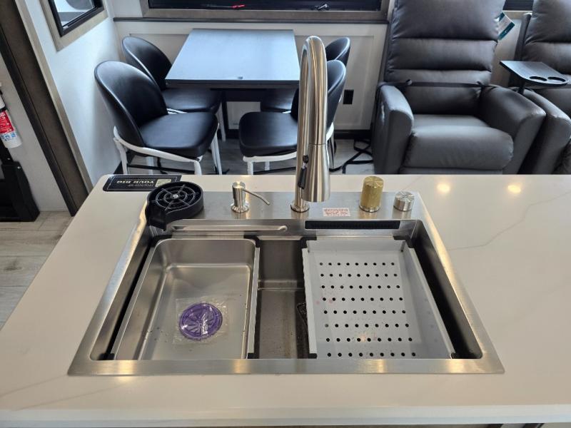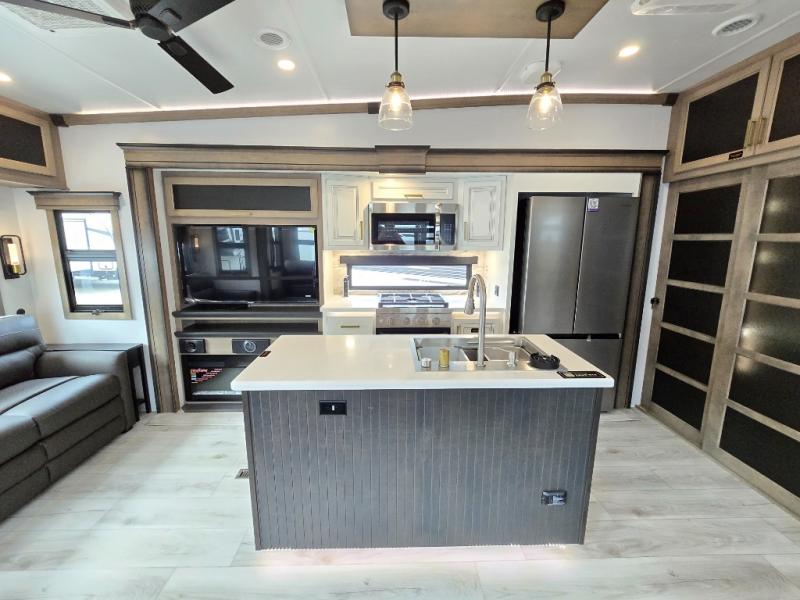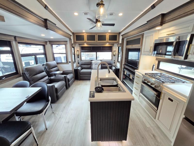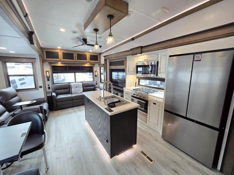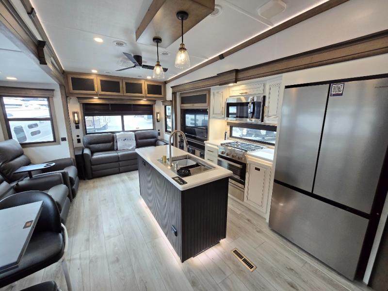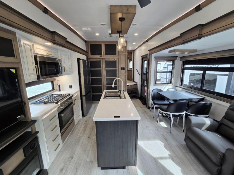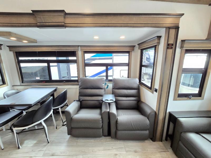 Luxury abounds throughout this fifth wheel! Starting in the kitchen with the island, pull down storage panty, 24" range, and residential convection microwave. The full bathroom has a 48" x 30" fiberglass shower with a seat, decorative glass enclosure, and a skylight above it for more natural lighting. Sleep like a baby in the front private bedroom on the king bed slide with storage underneath and keep your clothes looking their best with the front closet that has dual closets and additional storage. The rear living area offers true relaxation with a hide-a-bed sofa and residential power recliners, and there is a pivot dinette where you can dine at.