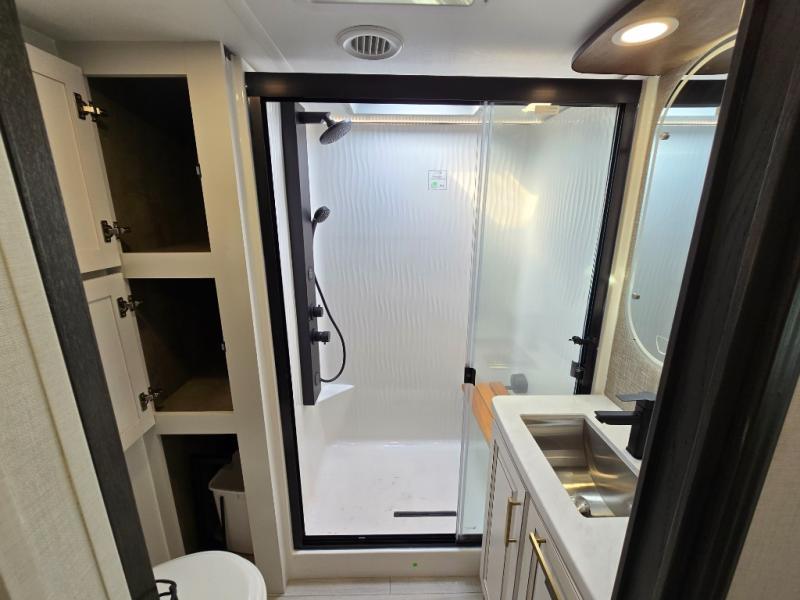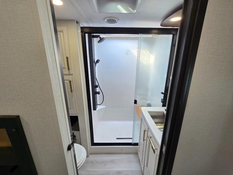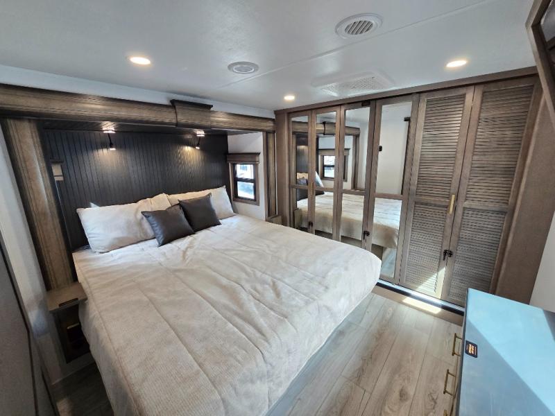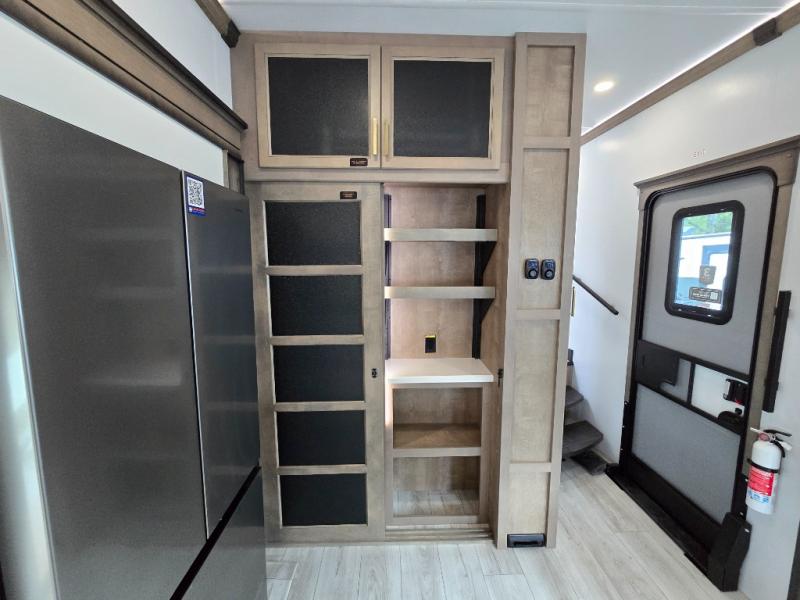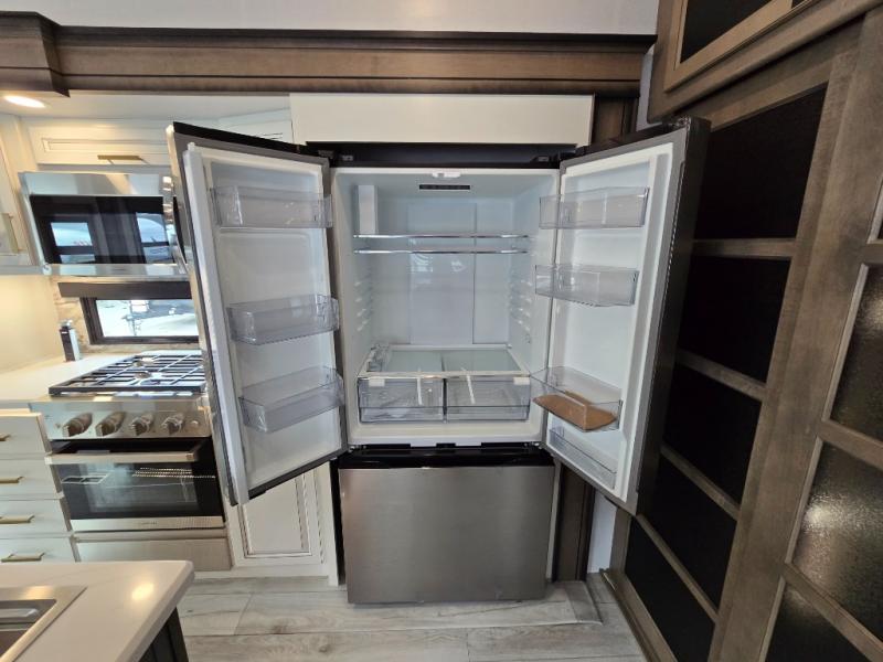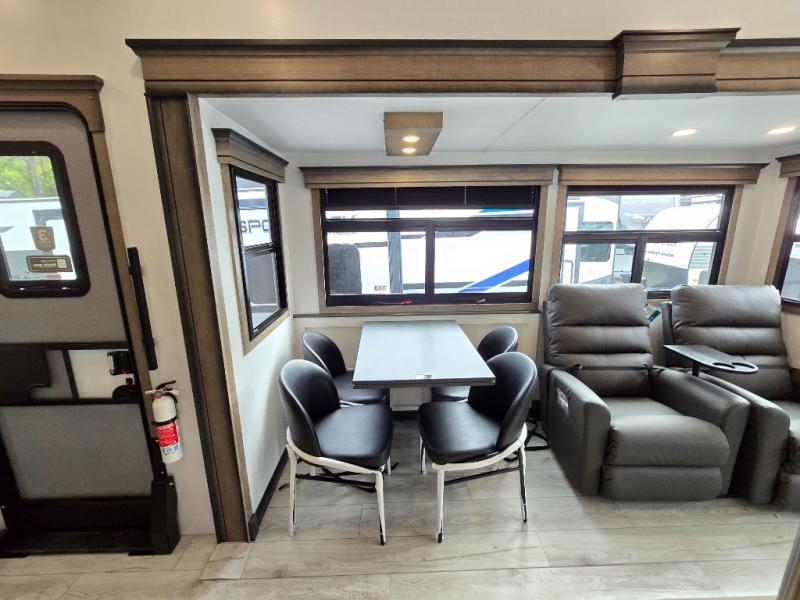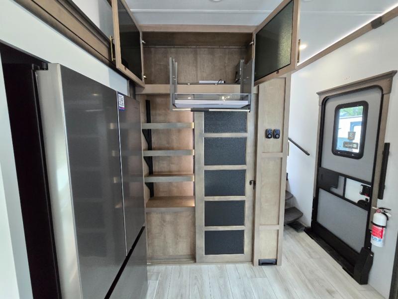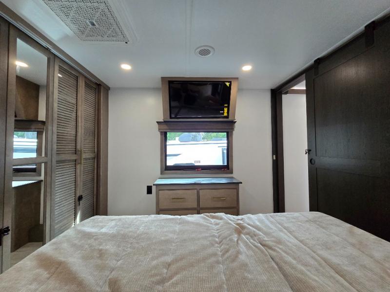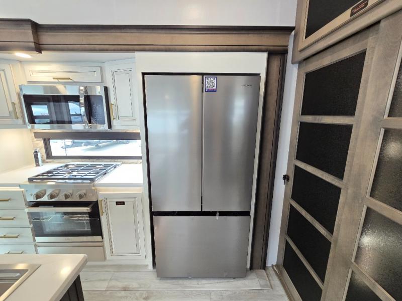 Luxury abounds throughout this fifth wheel! Starting in the kitchen with the island, pull down storage panty, 24" range, and residential convection microwave. The full bathroom has a 48" x 30" fiberglass shower with a seat, decorative glass enclosure, and a skylight above it for more natural lighting. Sleep like a baby in the front private bedroom on the king bed slide with storage underneath and keep your clothes looking their best with the front closet that has dual closets and additional storage. The rear living area offers true relaxation with a hide-a-bed sofa and residential power recliners, and there is a pivot dinette where you can dine at.
