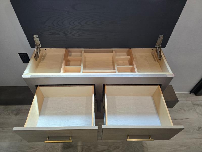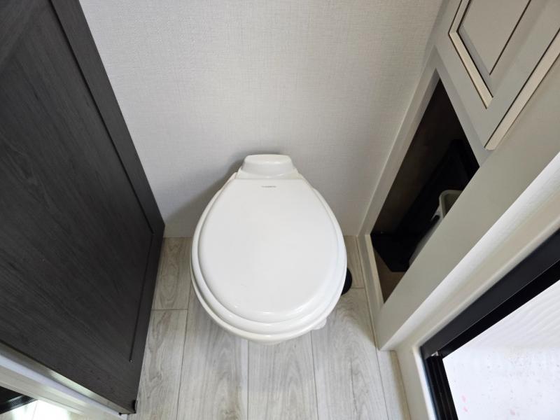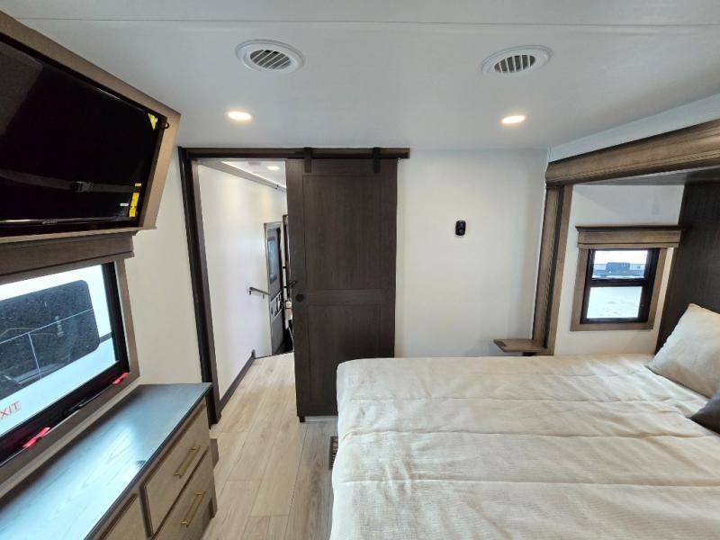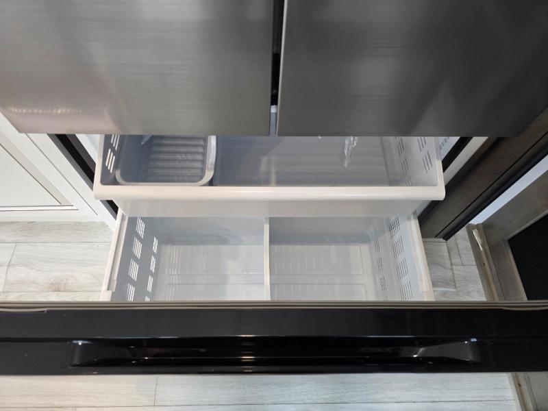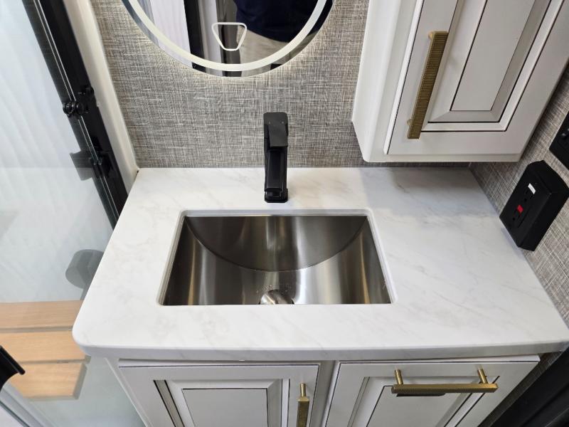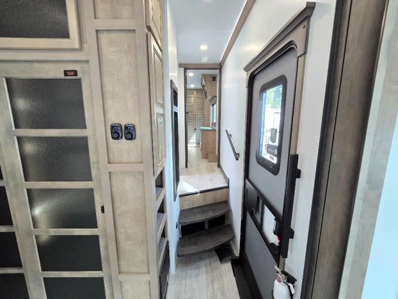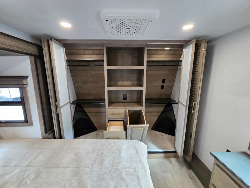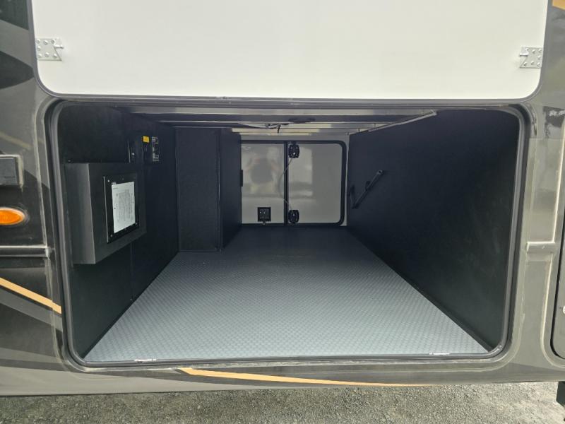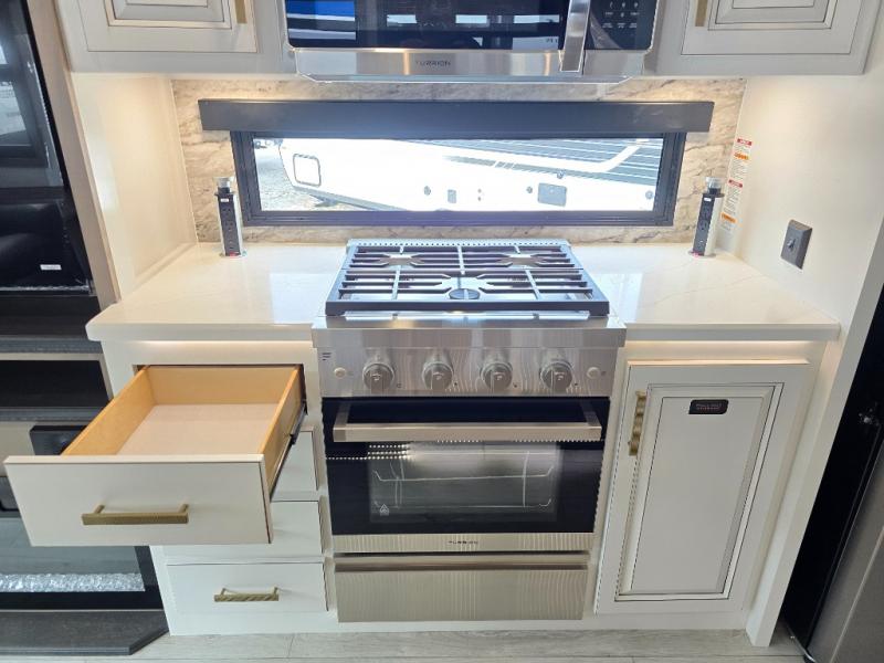 Luxury abounds throughout this fifth wheel! Starting in the kitchen with the island, pull down storage panty, 24" range, and residential convection microwave. The full bathroom has a 48" x 30" fiberglass shower with a seat, decorative glass enclosure, and a skylight above it for more natural lighting. Sleep like a baby in the front private bedroom on the king bed slide with storage underneath and keep your clothes looking their best with the front closet that has dual closets and additional storage. The rear living area offers true relaxation with a hide-a-bed sofa and residential power recliners, and there is a pivot dinette where you can dine at.