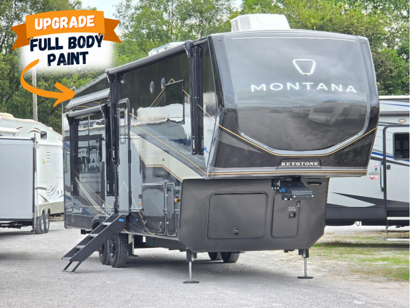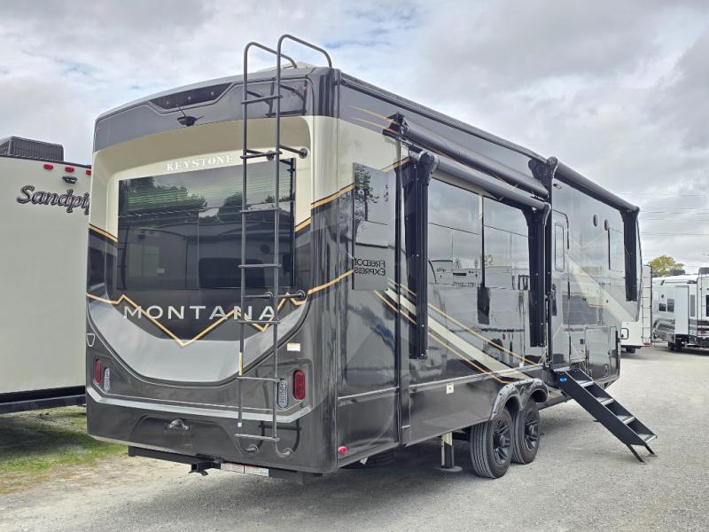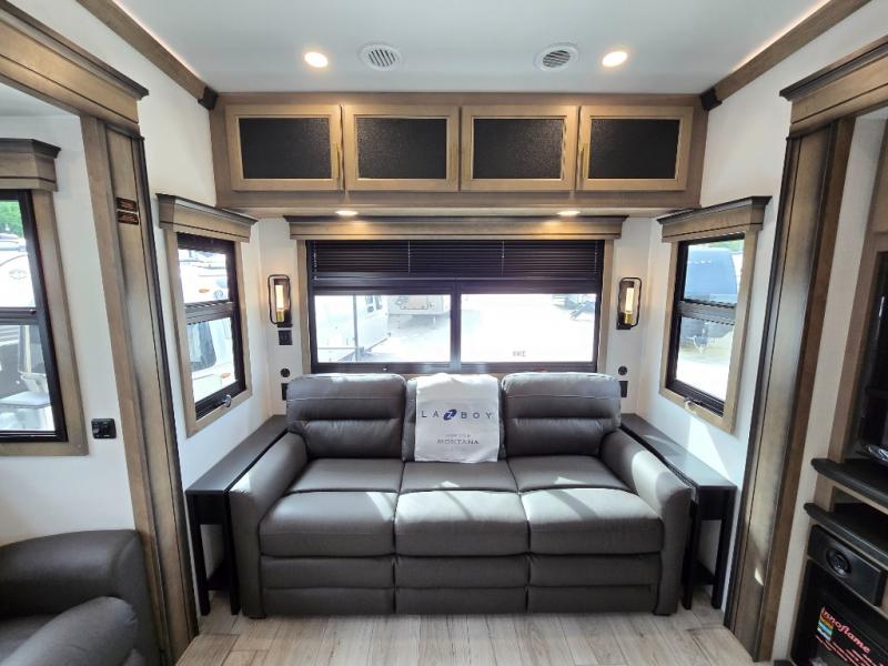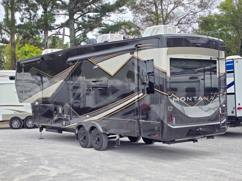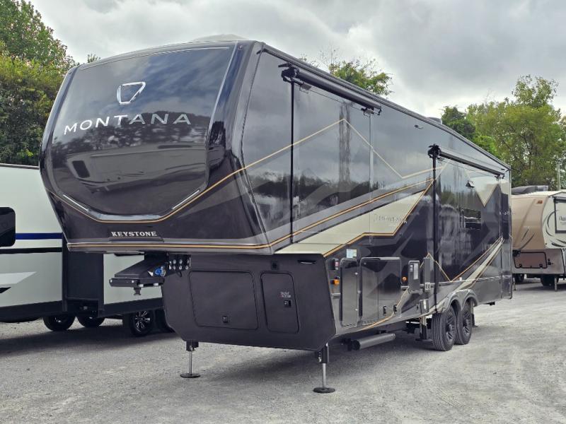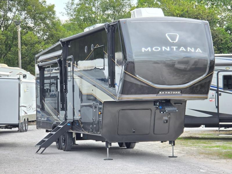 Enjoy luxury, innovation, and the outdoors in any one of Montana's finest fifth wheels. Each set the standard with exceptional features, and exciting factory installed options to provide you a great home on the road. Keystone's 12" I-beam chassis with z-frame technology provides a strong and durable foundation to your fifth wheel, and the four season living package will help extend your camping season. A few other construction features you will appreciate include a MORryde CRE3000 suspension, a fully walkable roof with an alpha seamless TPO membrane system, and 4k square frameless tinted safety glass windows. Each feature stylish interiors with two decor choices paired with beautiful hardwood cabinetry, Beauflor vinyl flooring throughout, central vacuum, plus a La-Z-Boy furniture package for all-around comfort!