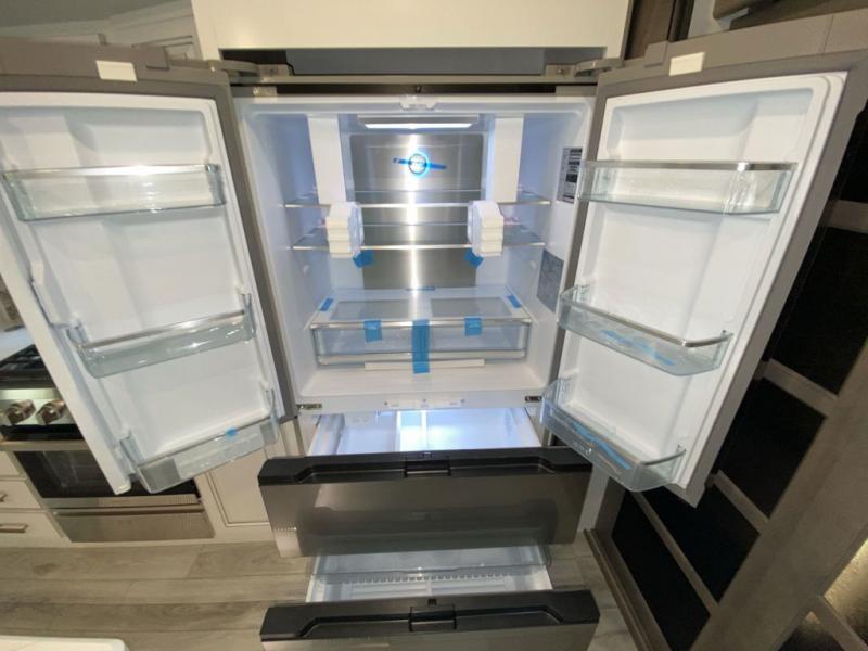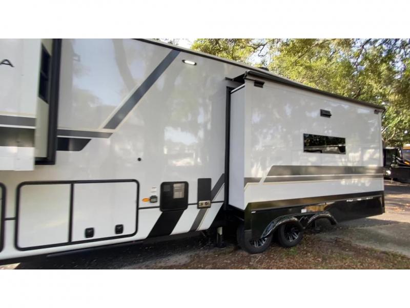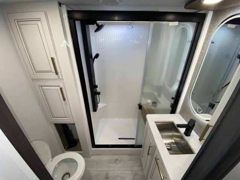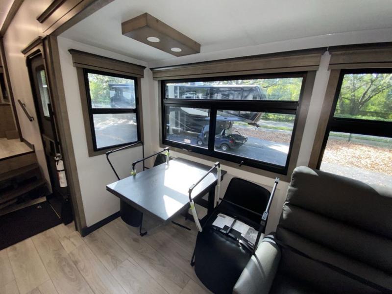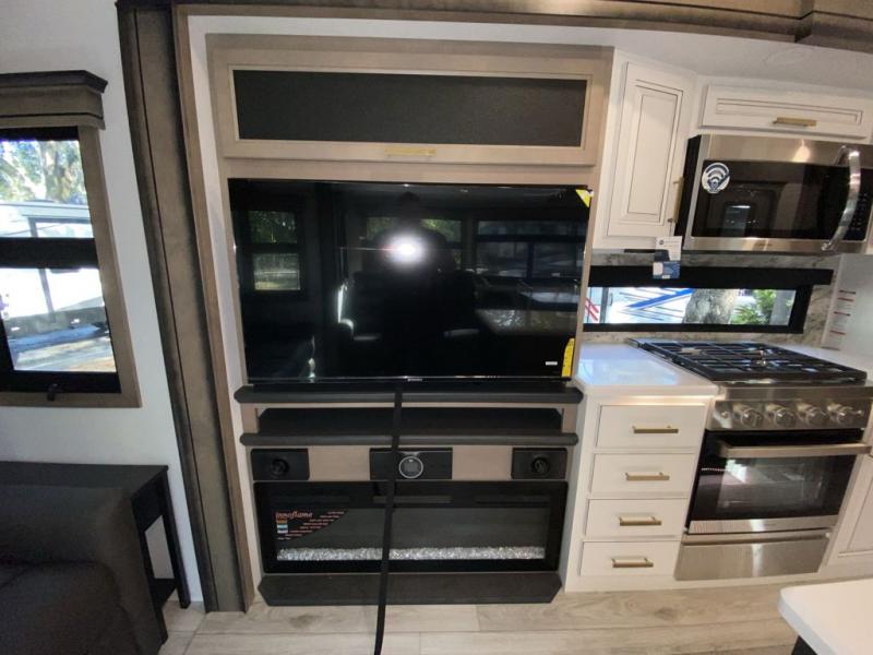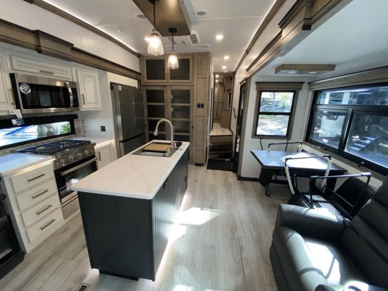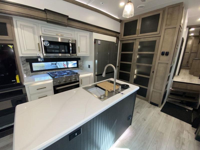 Luxury abounds throughout this fifth wheel! Starting in the kitchen with the island, pull down storage panty, 24" range, and residential convection microwave. The full bathroom has a 48" x 30" fiberglass shower with a seat, decorative glass enclosure, and a skylight above it for more natural lighting. Sleep like a baby in the front private bedroom on the king bed slide with storage underneath and keep your clothes looking their best with the front closet that has dual closets and additional storage. The rear living area offers true relaxation with a hide-a-bed sofa and residential power recliners, and there is a pivot dinette where you can dine at.