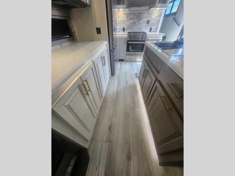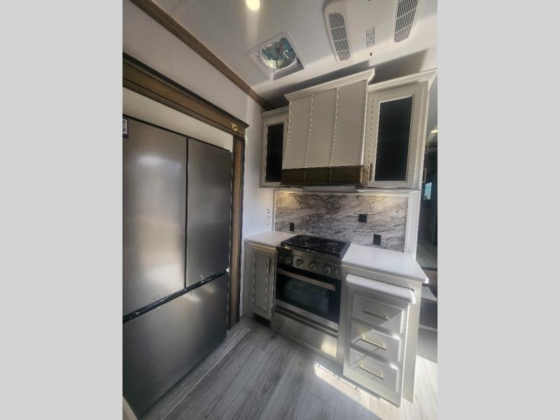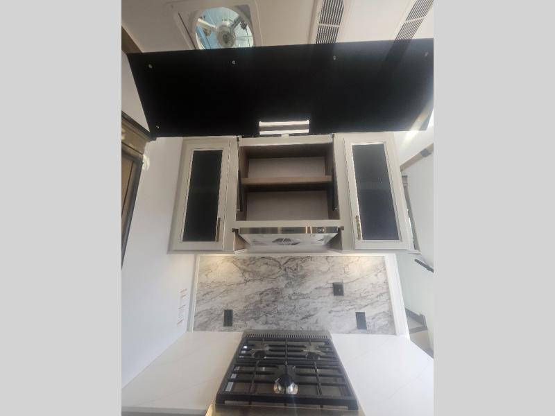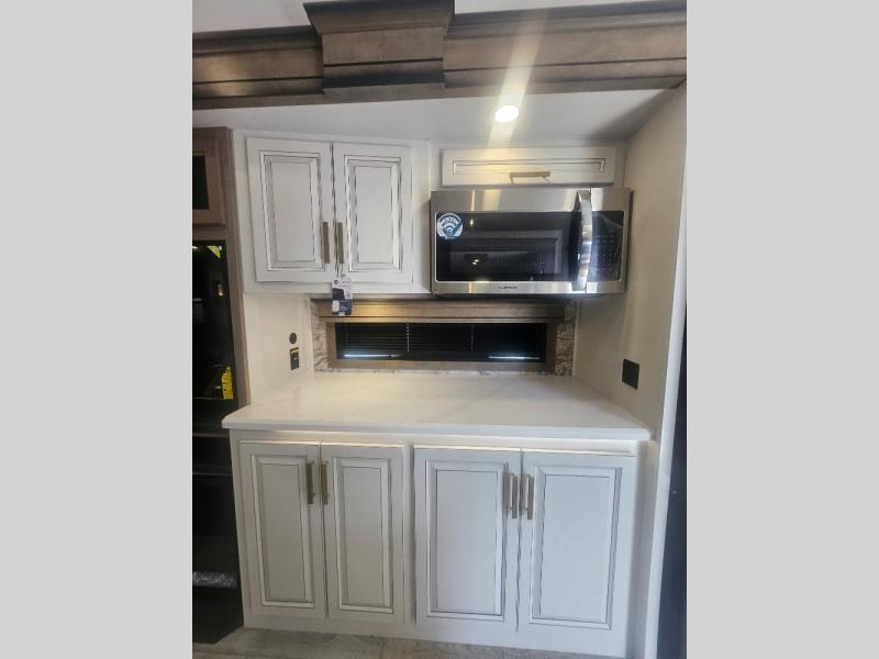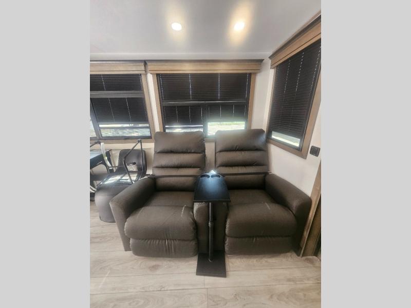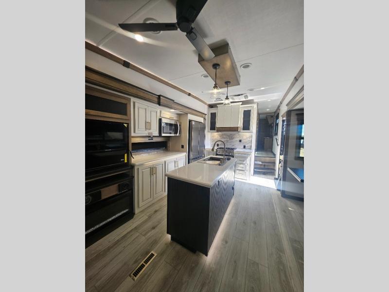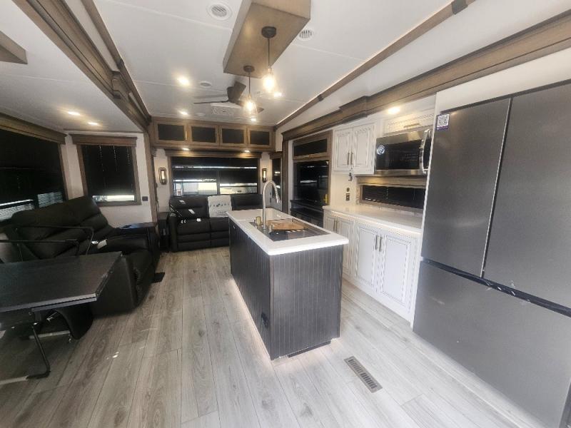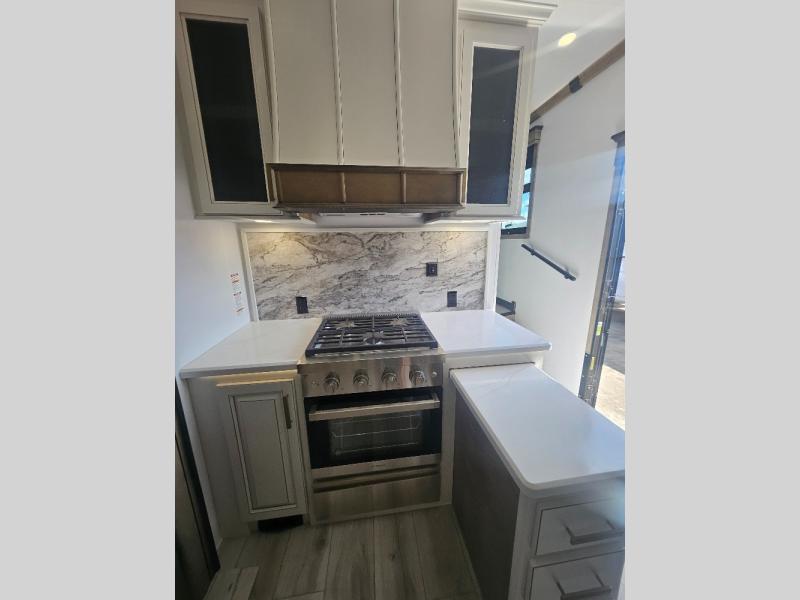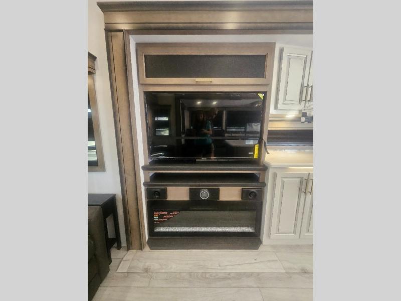 Luxury abounds throughout this fifth wheel! Starting in the kitchen with the island, two pull out pantries with extra countertop space above it, a 24" range with hidden storage, and a pull out countertop for more prepping space. The full bathroom has a 48" x 30" fiberglass shower with a seat, decorative glass enclosure, and skylight above it for more natural lighting as two get ready at once with the dual sink vanity. Sleep like a baby in the front private bedroom on the king bed slide with storage underneath and keep your clothes looking their best with two closets and additional storage. The rear living area offers true relaxation with a hide-a-bed sofa and residential power recliners across from the entertainment center with a 5,000 BTU decorative fireplace heater and 50" Smart TV to watch your favorite movies!