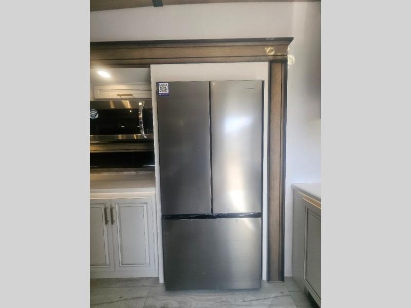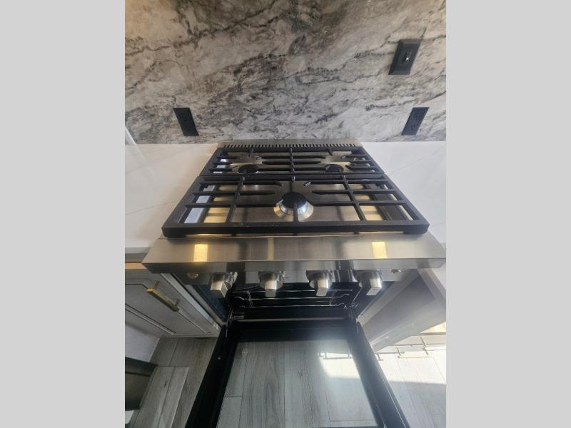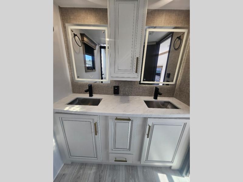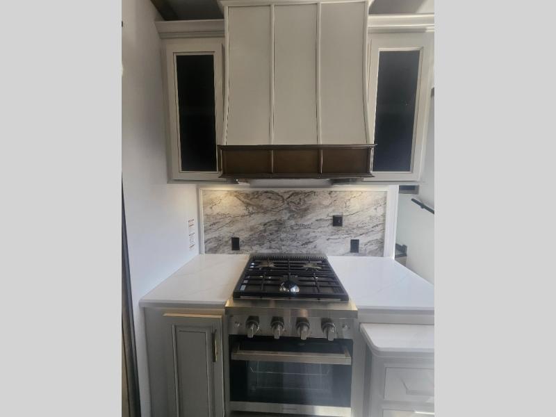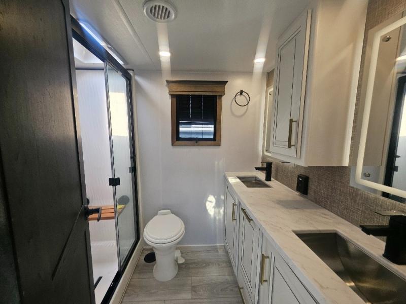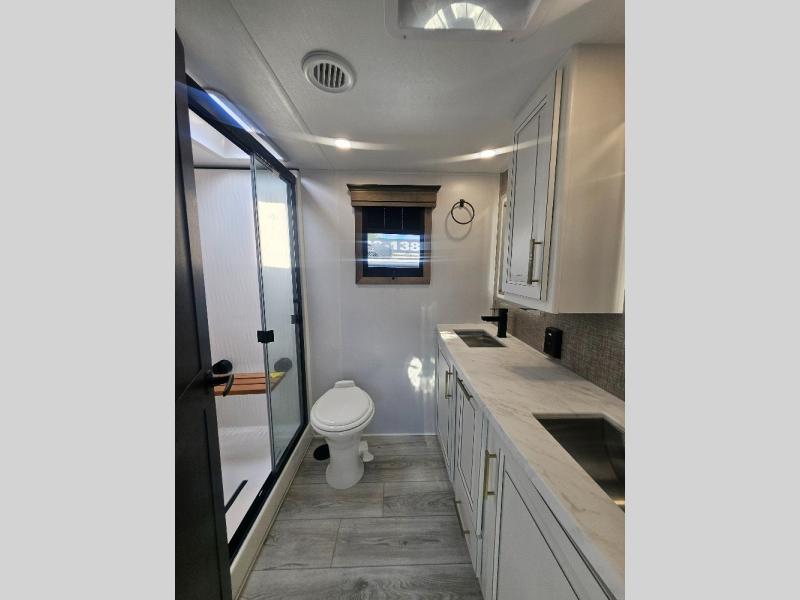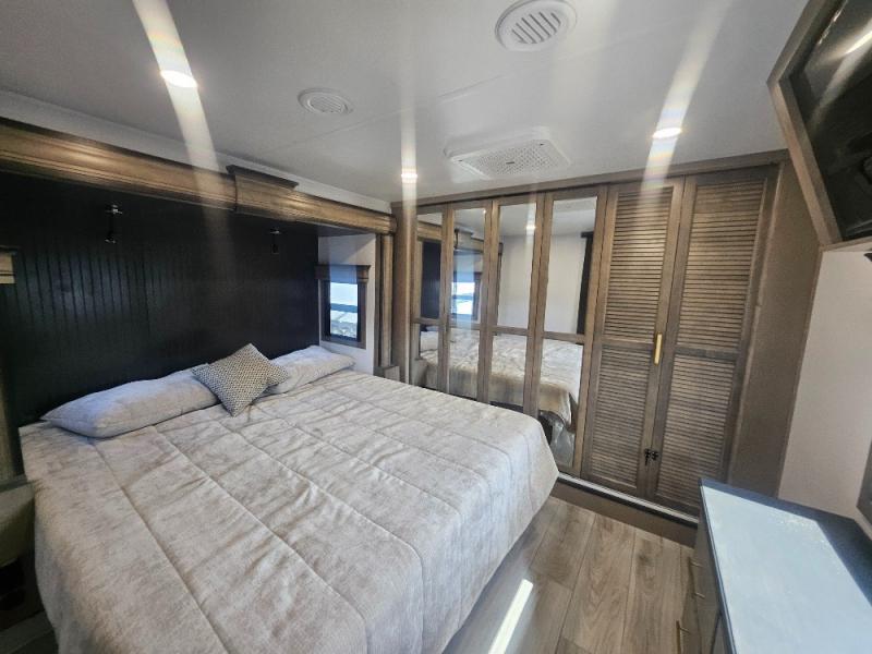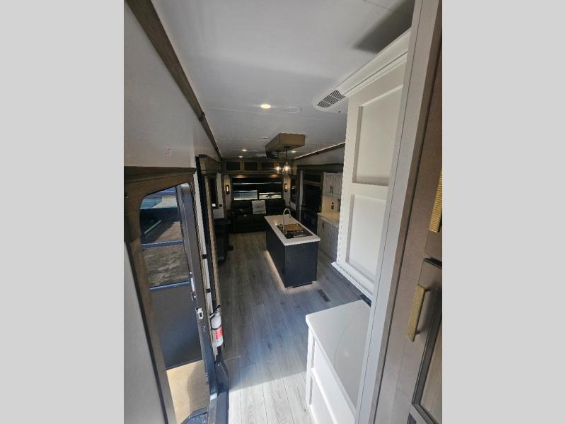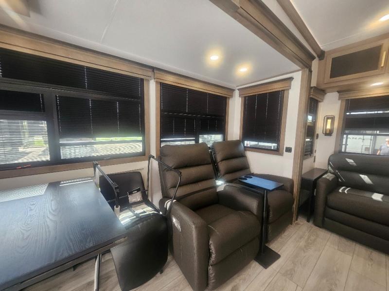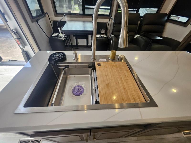 Luxury abounds throughout this fifth wheel! Starting in the kitchen with the island, two pull out pantries with extra countertop space above it, a 24" range with hidden storage, and a pull out countertop for more prepping space. The full bathroom has a 48" x 30" fiberglass shower with a seat, decorative glass enclosure, and skylight above it for more natural lighting as two get ready at once with the dual sink vanity. Sleep like a baby in the front private bedroom on the king bed slide with storage underneath and keep your clothes looking their best with two closets and additional storage. The rear living area offers true relaxation with a hide-a-bed sofa and residential power recliners across from the entertainment center with a 5,000 BTU decorative fireplace heater and 50" Smart TV to watch your favorite movies!