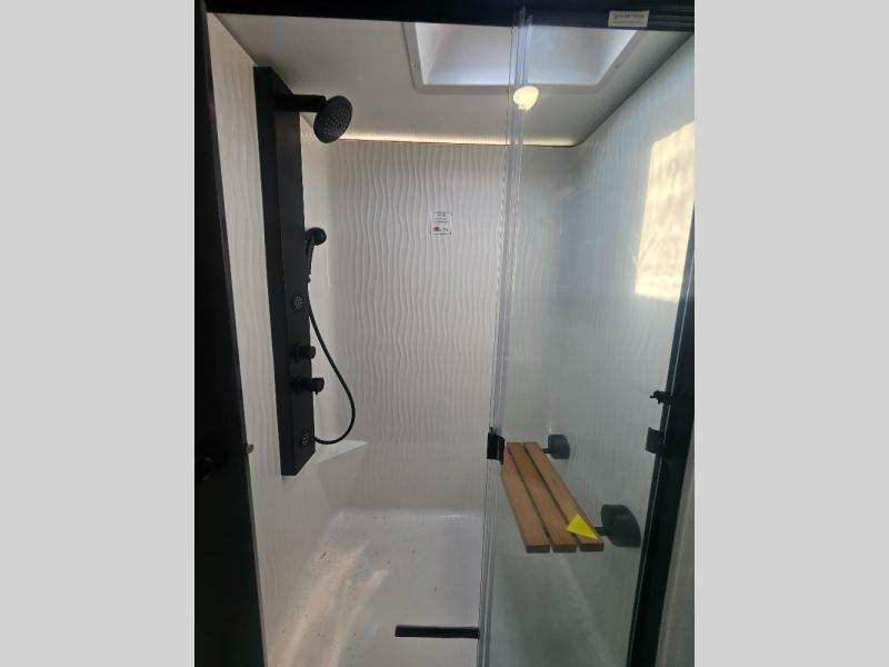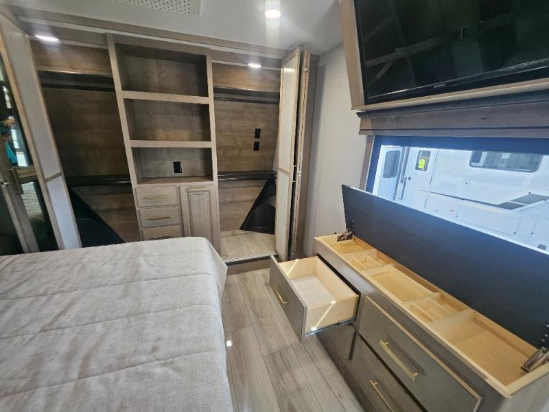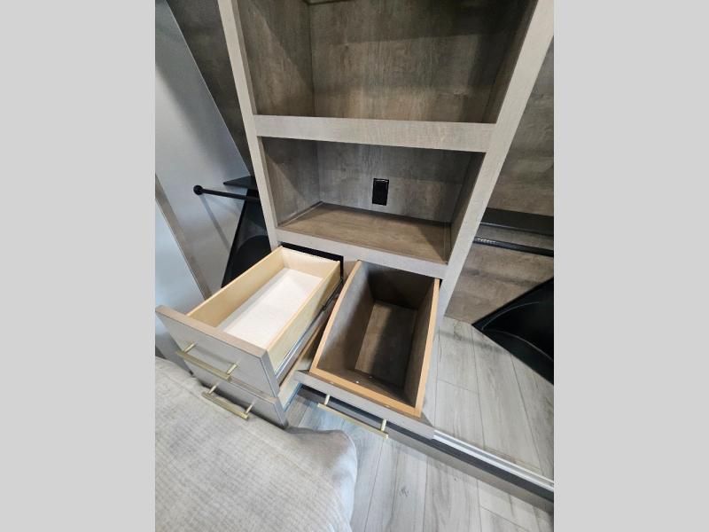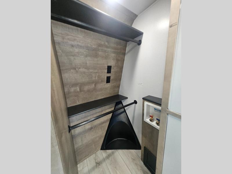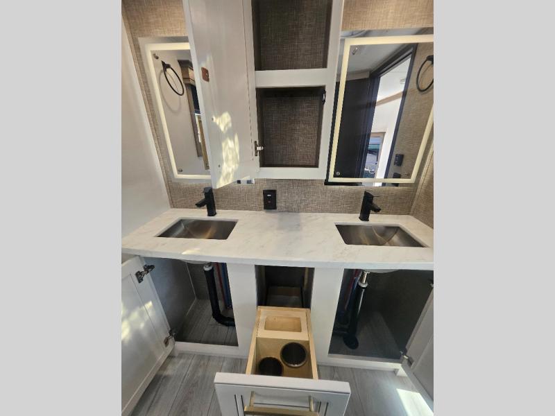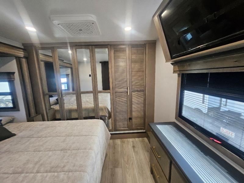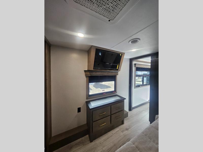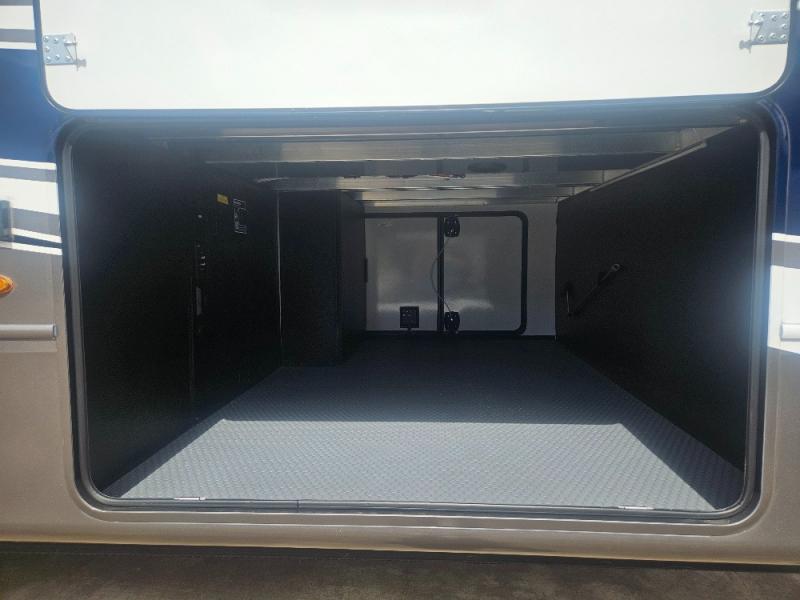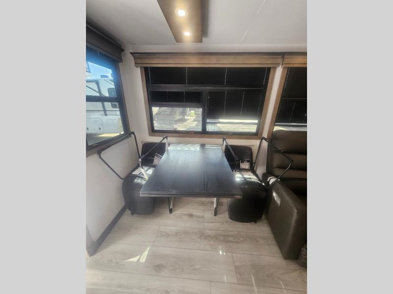 Luxury abounds throughout this fifth wheel! Starting in the kitchen with the island, two pull out pantries with extra countertop space above it, a 24" range with hidden storage, and a pull out countertop for more prepping space. The full bathroom has a 48" x 30" fiberglass shower with a seat, decorative glass enclosure, and skylight above it for more natural lighting as two get ready at once with the dual sink vanity. Sleep like a baby in the front private bedroom on the king bed slide with storage underneath and keep your clothes looking their best with two closets and additional storage. The rear living area offers true relaxation with a hide-a-bed sofa and residential power recliners across from the entertainment center with a 5,000 BTU decorative fireplace heater and 50" Smart TV to watch your favorite movies!