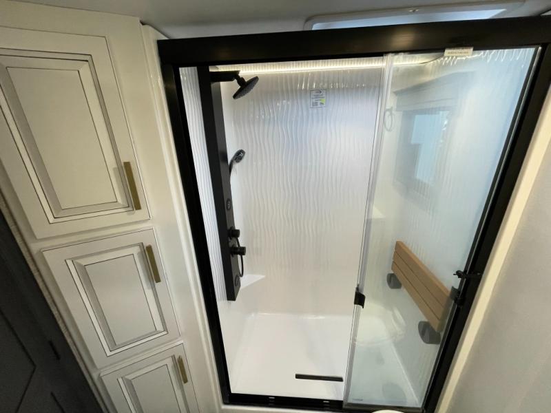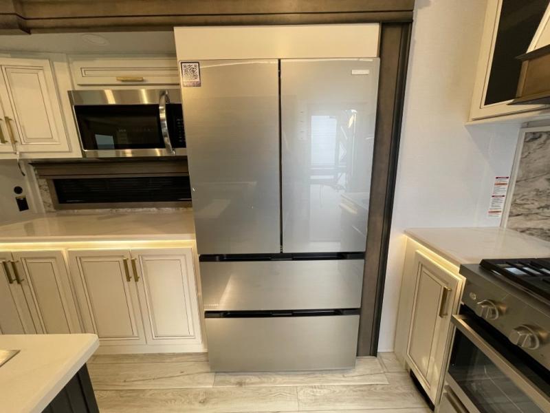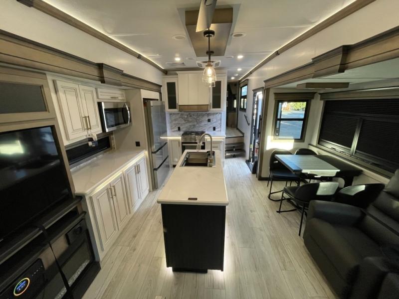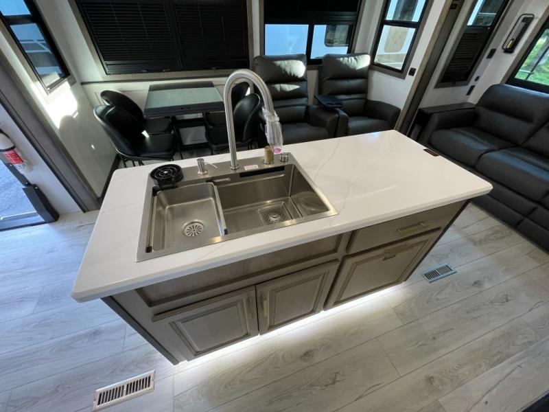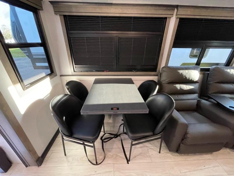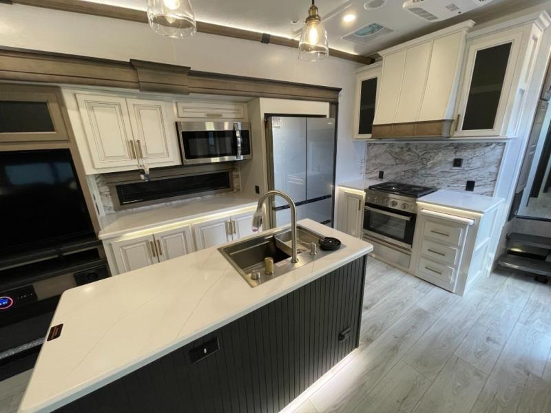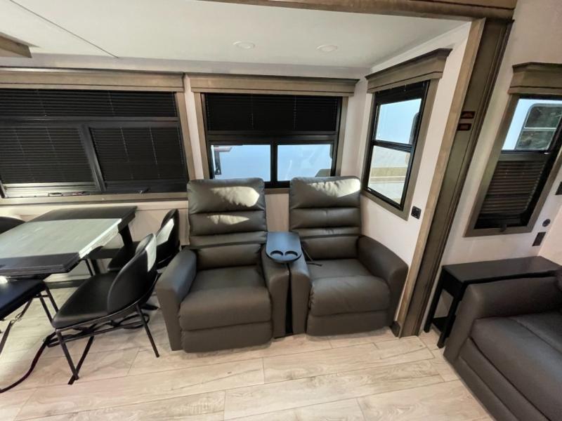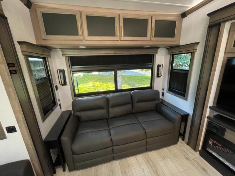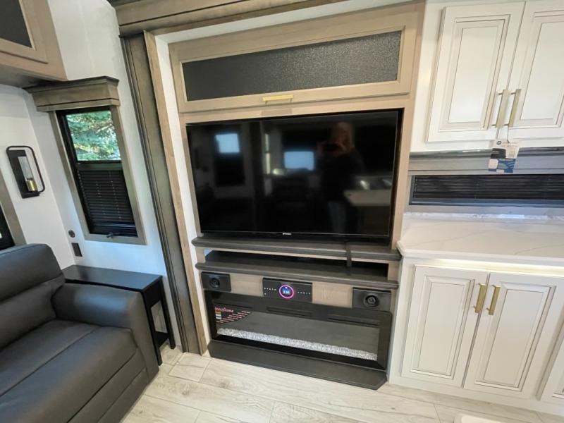 Luxury abounds throughout this fifth wheel! Starting in the kitchen with the island, two pull out pantries with extra countertop space above it, a 24" range with hidden storage, and a pull out countertop for more prepping space. The full bathroom has a 48" x 30" fiberglass shower with a seat, decorative glass enclosure, and skylight above it for more natural lighting as two get ready at once with the dual sink vanity. Sleep like a baby in the front private bedroom on the king bed slide with storage underneath and keep your clothes looking their best with two closets and additional storage. The rear living area offers true relaxation with a hide-a-bed sofa and residential power recliners across from the entertainment center with a 5,000 BTU decorative fireplace heater and 50" Smart TV to watch your favorite movies!