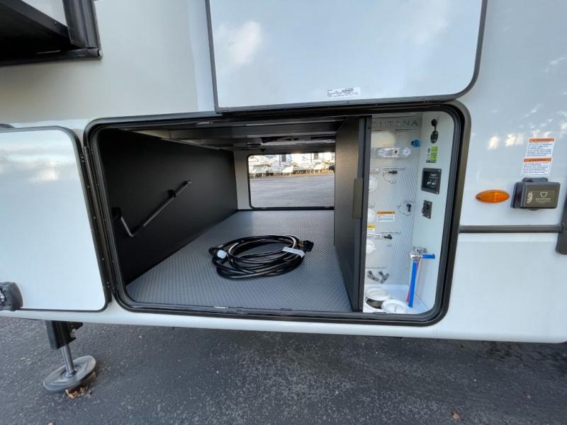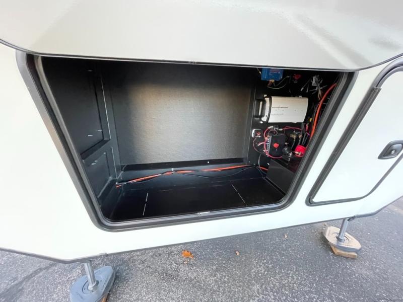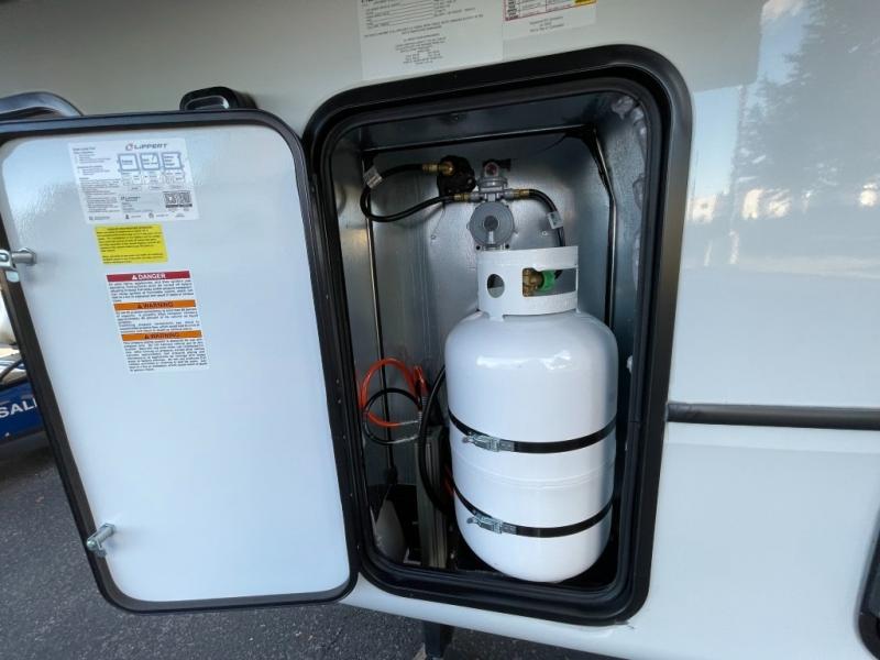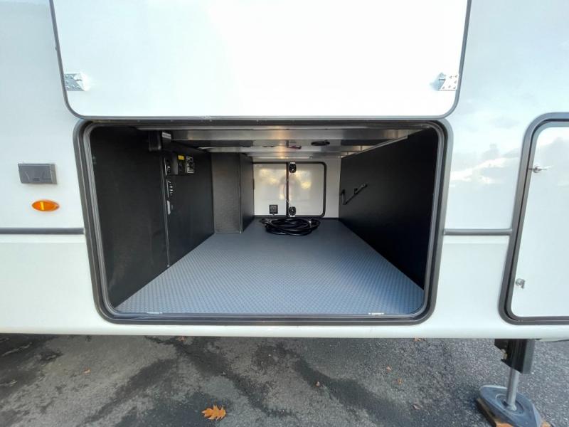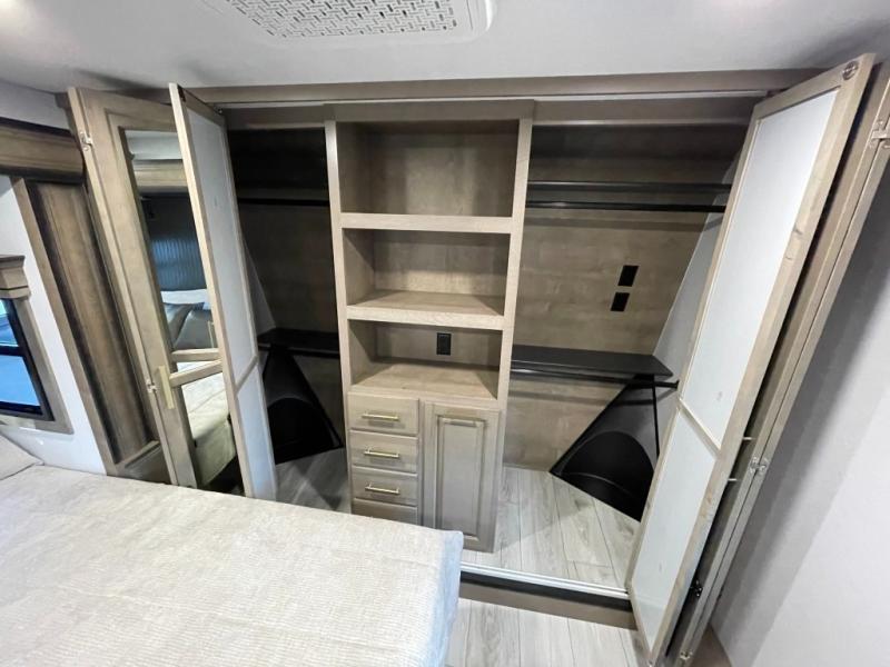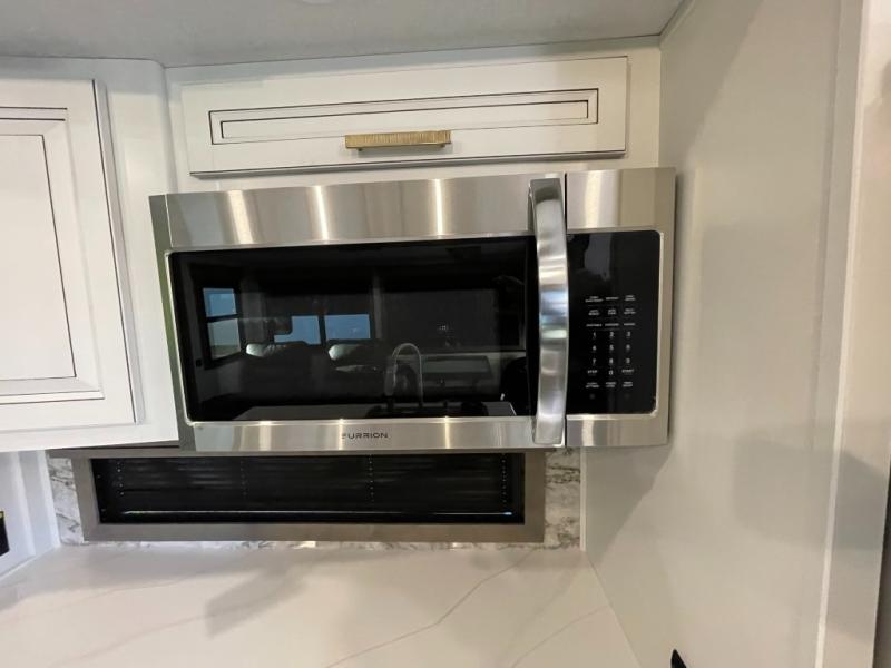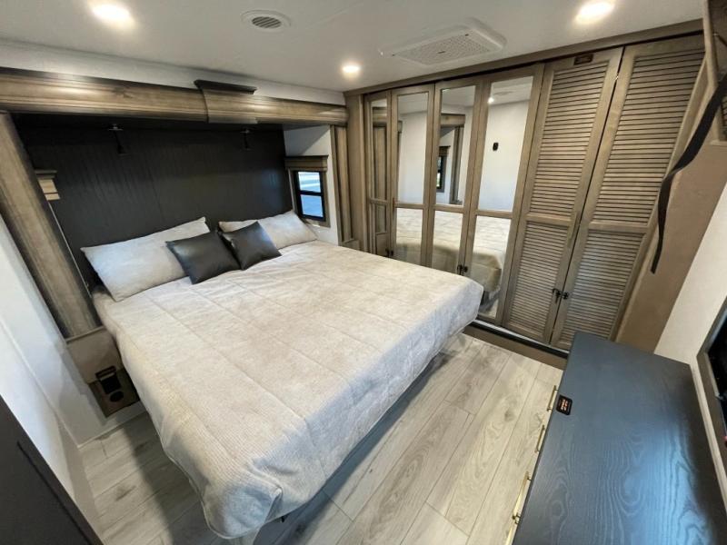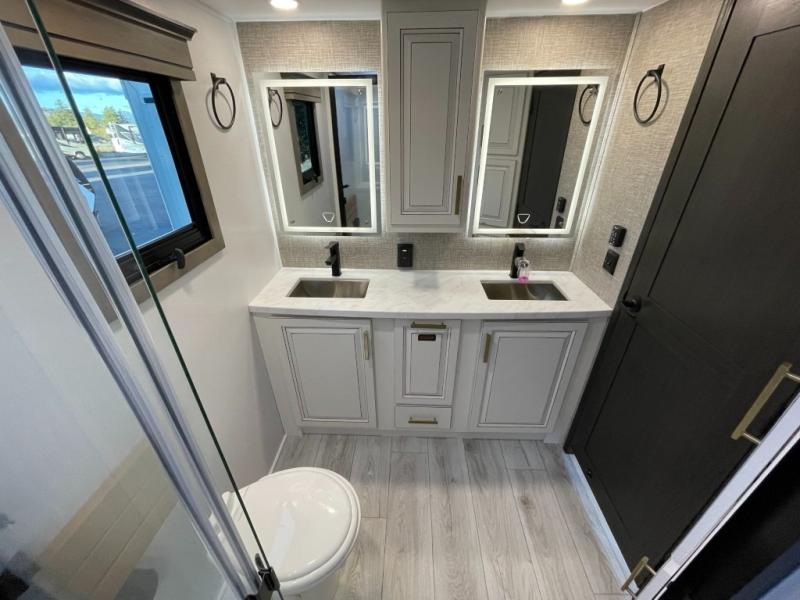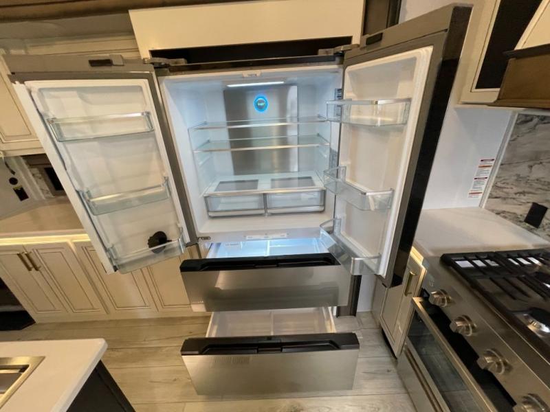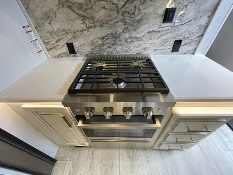 Luxury abounds throughout this fifth wheel! Starting in the kitchen with the island, two pull out pantries with extra countertop space above it, a 24" range with hidden storage, and a pull out countertop for more prepping space. The full bathroom has a 48" x 30" fiberglass shower with a seat, decorative glass enclosure, and skylight above it for more natural lighting as two get ready at once with the dual sink vanity. Sleep like a baby in the front private bedroom on the king bed slide with storage underneath and keep your clothes looking their best with two closets and additional storage. The rear living area offers true relaxation with a hide-a-bed sofa and residential power recliners across from the entertainment center with a 5,000 BTU decorative fireplace heater and 50" Smart TV to watch your favorite movies!