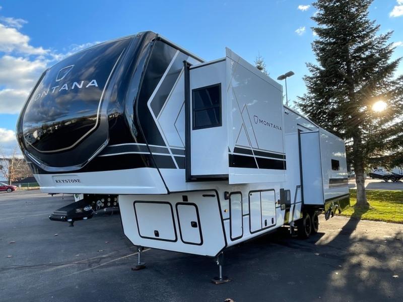 Enjoy luxury, innovation, and the outdoors in any one of Montana's finest fifth wheels. Each set the standard with exceptional features, and exciting factory installed options to provide you a great home on the road. Keystone's 12" I-beam chassis with z-frame technology provides a strong and durable foundation to your fifth wheel, and the four season living package will help extend your camping season. A few other construction features you will appreciate include a MORryde CRE3000 suspension, a fully walkable roof with an alpha seamless TPO membrane system, and 4k square frameless tinted safety glass windows. Each feature stylish interiors with two decor choices paired with beautiful hardwood cabinetry, Beauflor vinyl flooring throughout, central vacuum, plus a La-Z-Boy furniture package for all-around comfort!