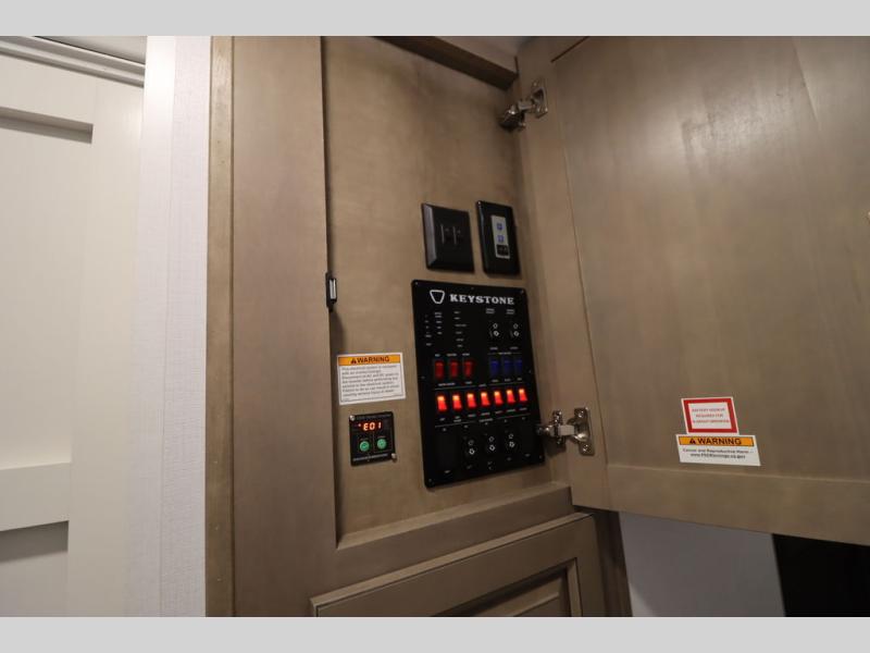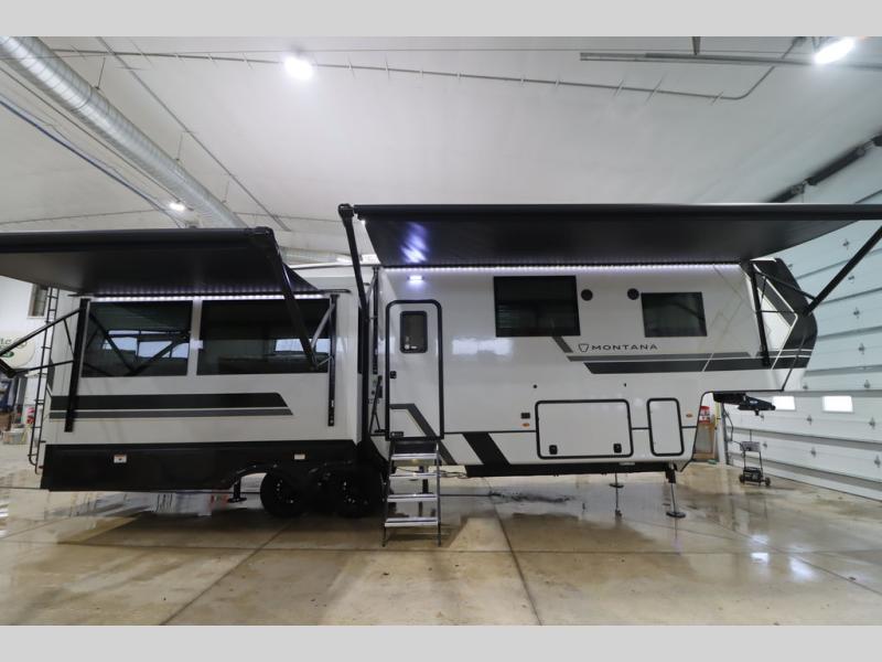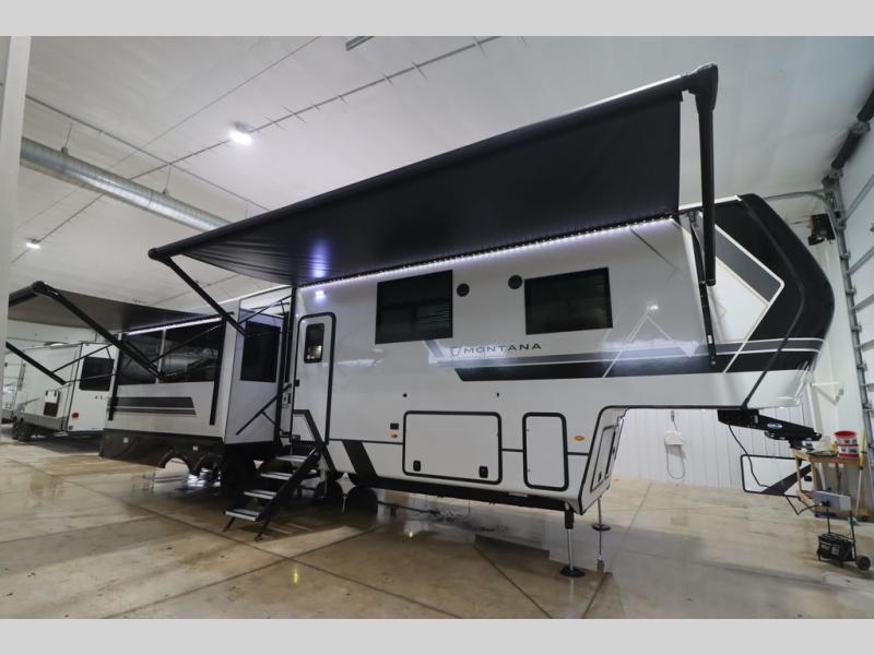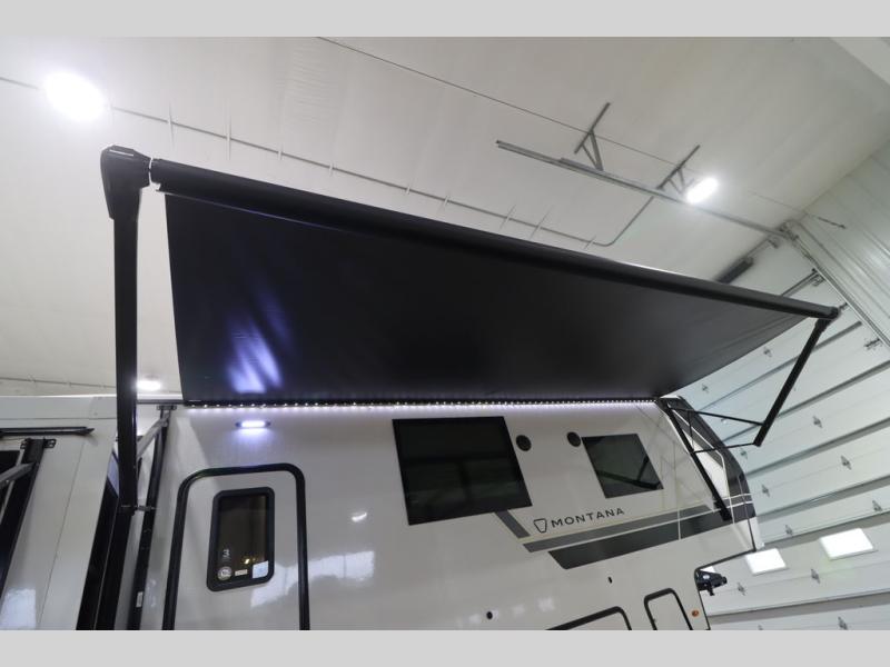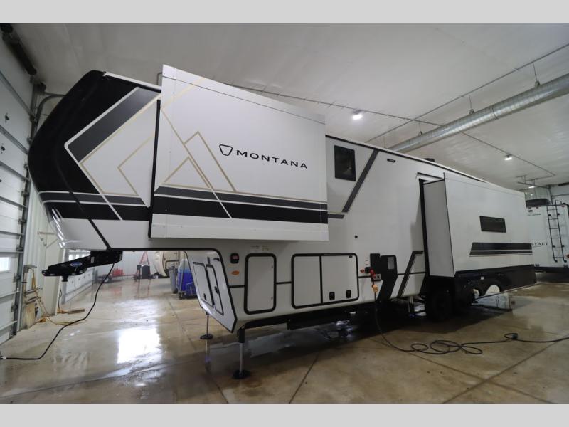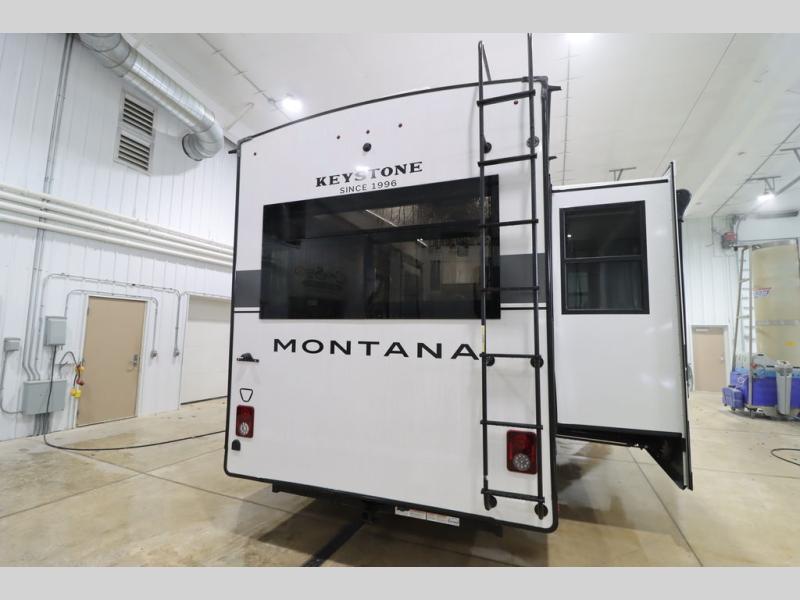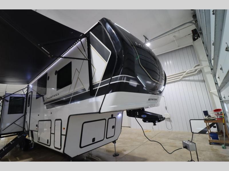 Enjoy luxury, innovation, and the outdoors in any one of Montana's finest fifth wheels. Each set the standard with exceptional features, and exciting factory installed options to provide you a great home on the road. Keystone's 12" I-beam chassis with z-frame technology provides a strong and durable foundation to your fifth wheel, and the four season living package will help extend your camping season. A few other construction features you will appreciate include a MORryde CRE3000 suspension, a fully walkable roof with an alpha seamless TPO membrane system, and 4k square frameless tinted safety glass windows. Each feature stylish interiors with two decor choices paired with beautiful hardwood cabinetry, Beauflor vinyl flooring throughout, central vacuum, plus a La-Z-Boy furniture package for all-around comfort!