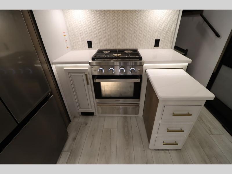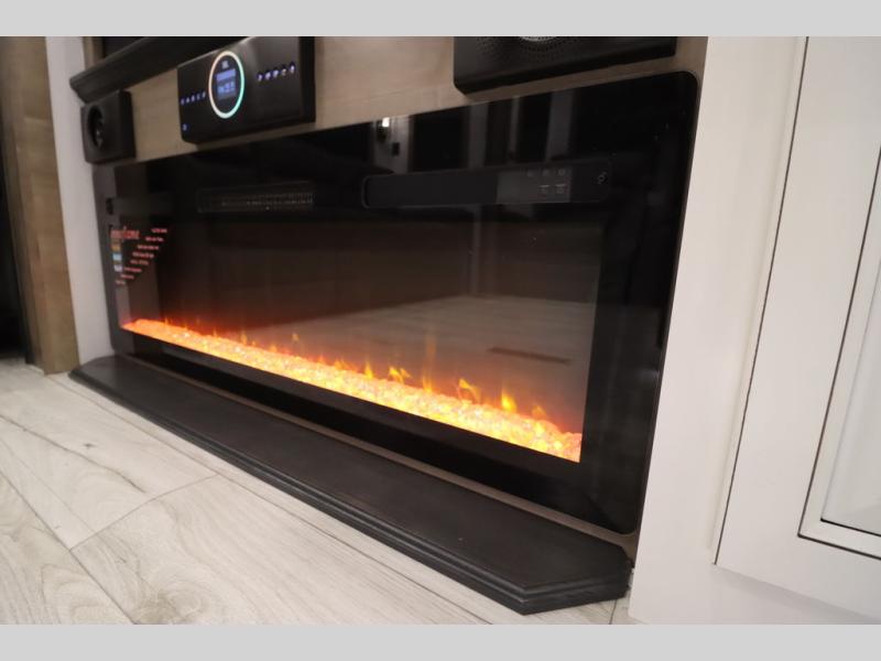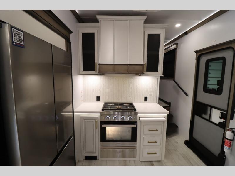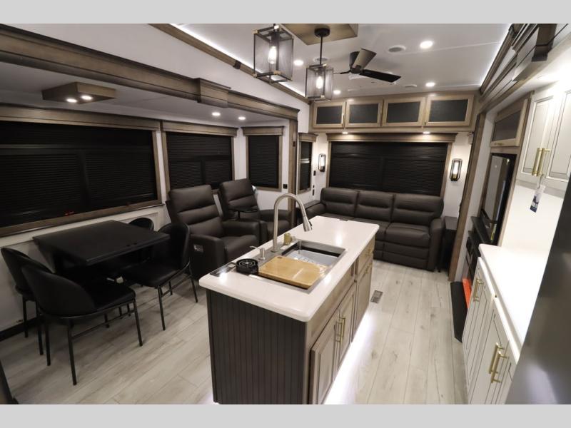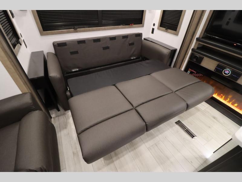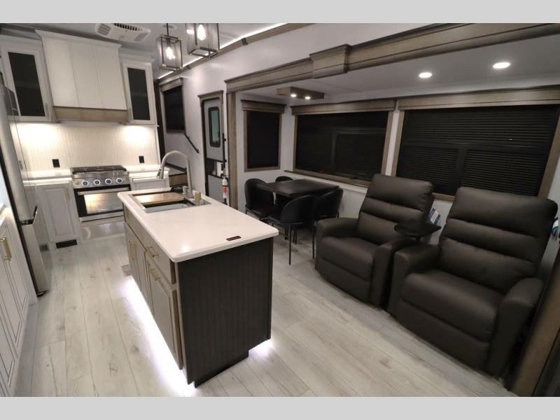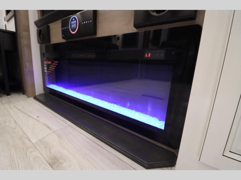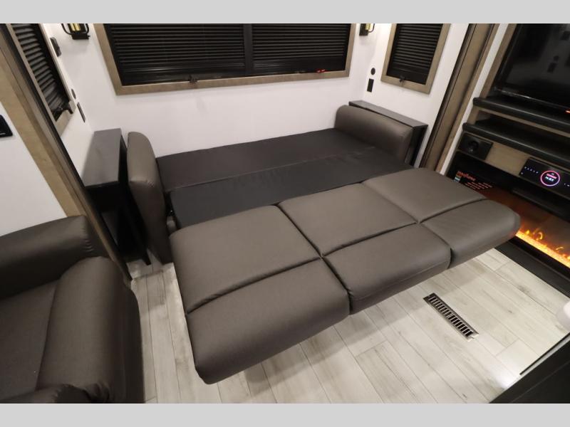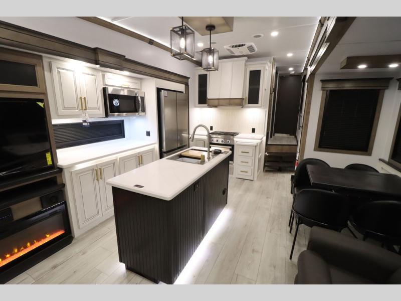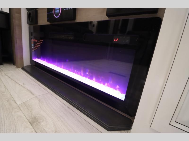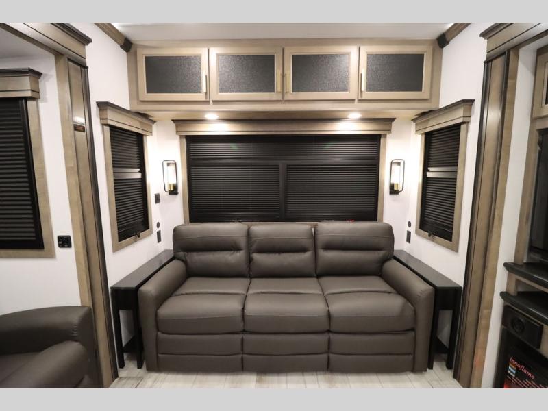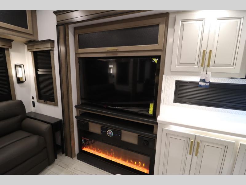 Luxury abounds throughout this fifth wheel! Starting in the kitchen with the island, two pull out pantries with extra countertop space above it, a 24" range with hidden storage, and a pull out countertop for more prepping space. The full bathroom has a 48" x 30" fiberglass shower with a seat, decorative glass enclosure, and skylight above it for more natural lighting as two get ready at once with the dual sink vanity. Sleep like a baby in the front private bedroom on the king bed slide with storage underneath and keep your clothes looking their best with two closets and additional storage. The rear living area offers true relaxation with a hide-a-bed sofa and residential power recliners across from the entertainment center with a 5,000 BTU decorative fireplace heater and 50" Smart TV to watch your favorite movies!