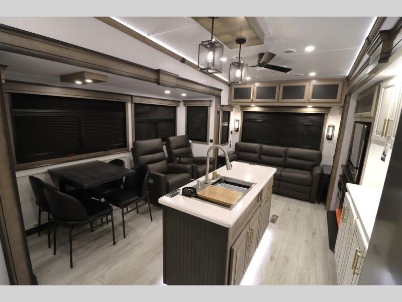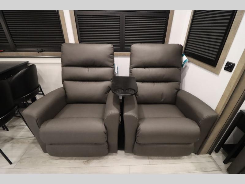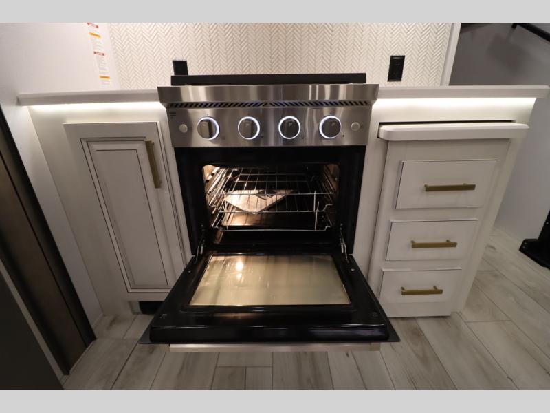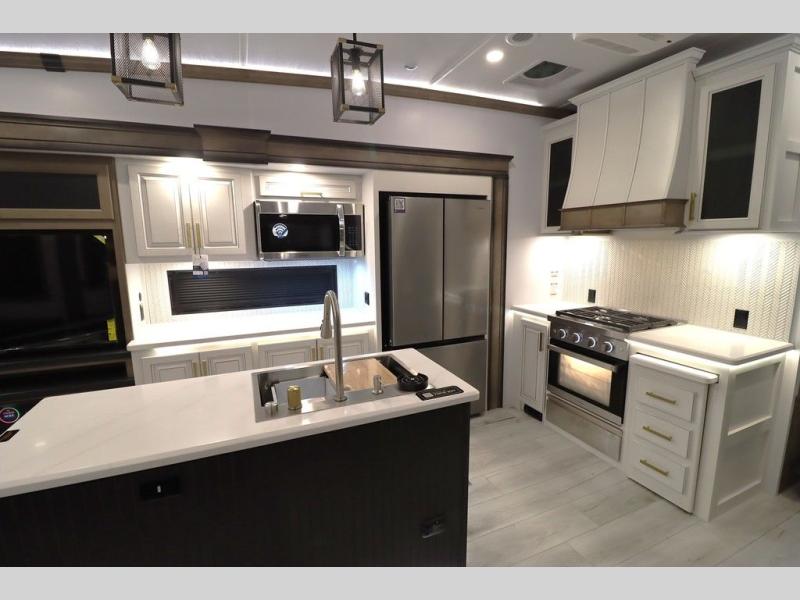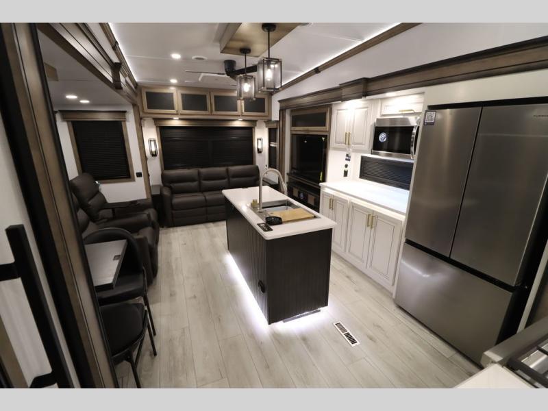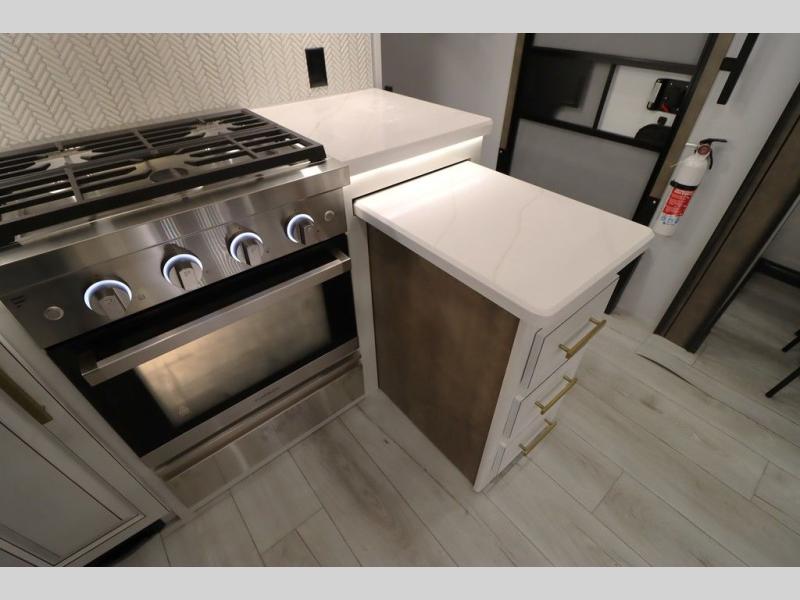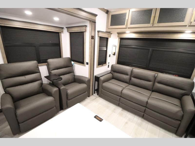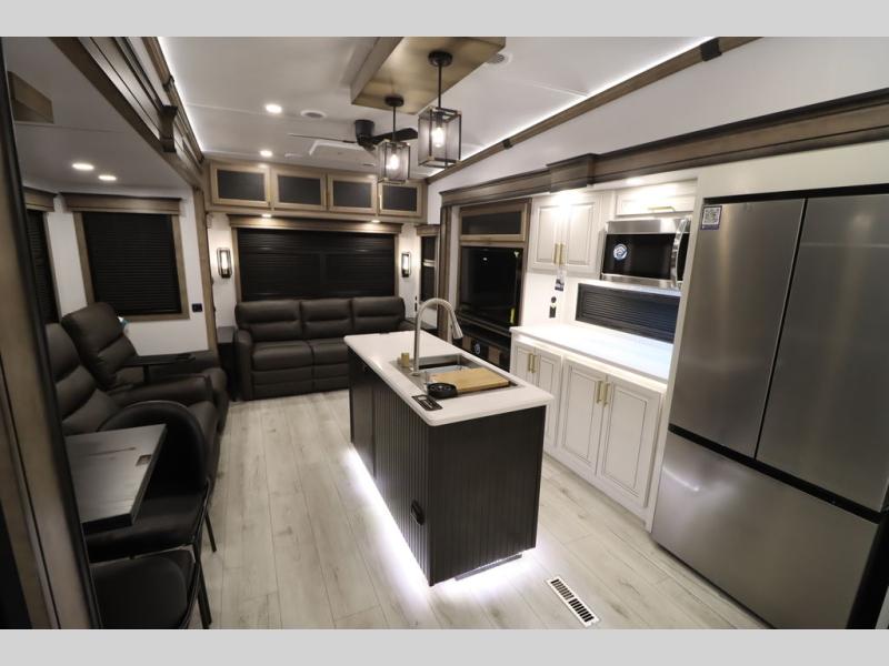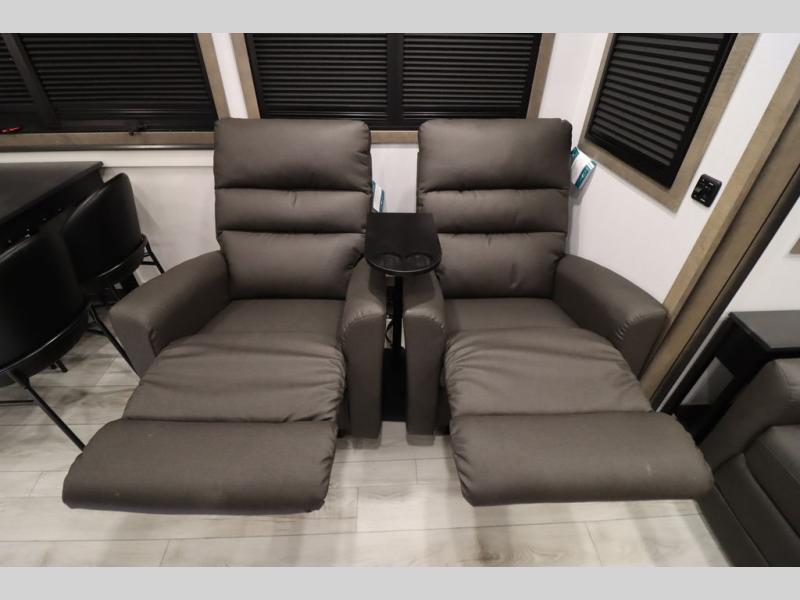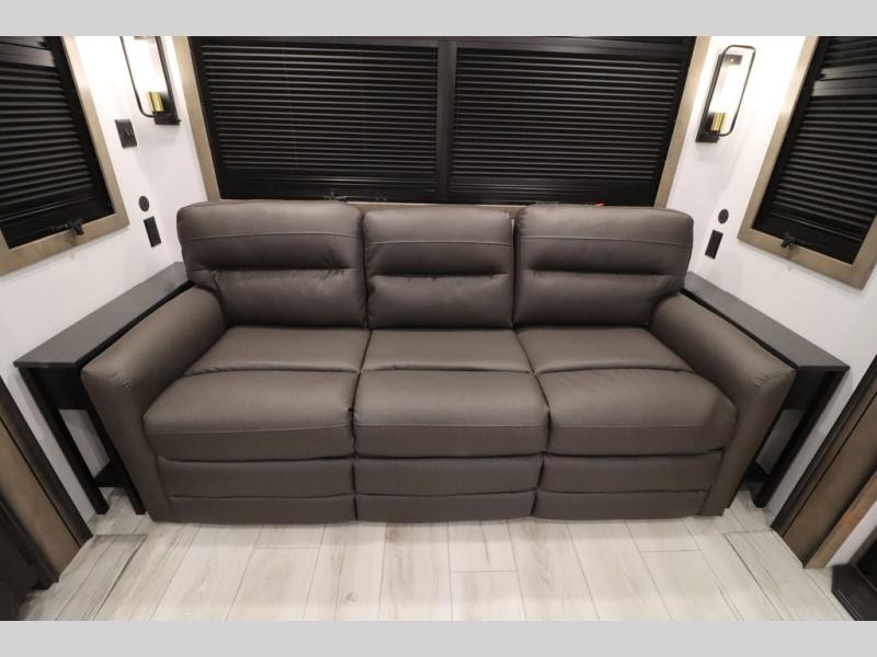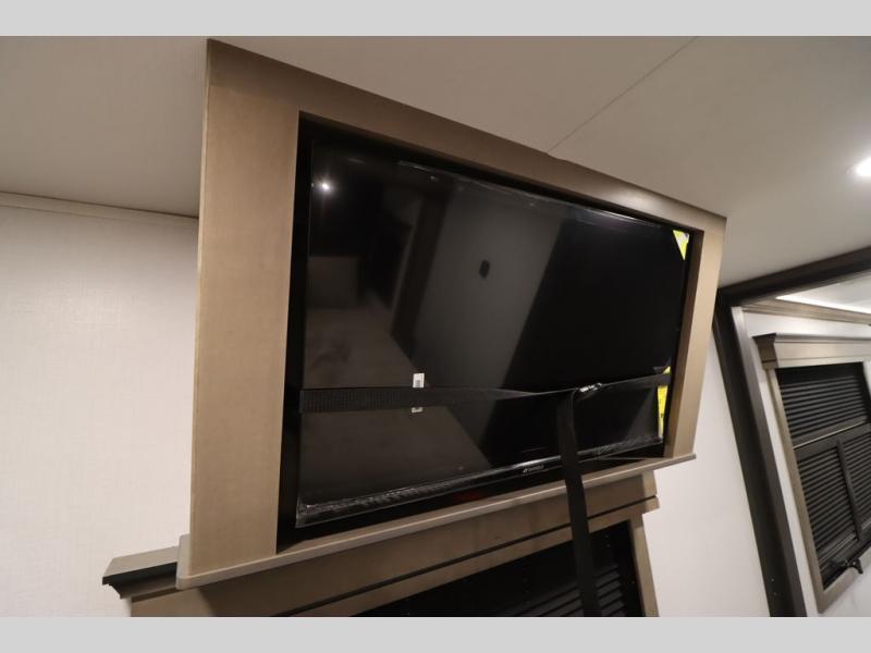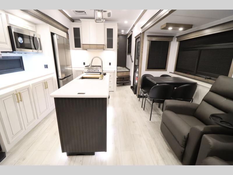 Luxury abounds throughout this fifth wheel! Starting in the kitchen with the island, two pull out pantries with extra countertop space above it, a 24" range with hidden storage, and a pull out countertop for more prepping space. The full bathroom has a 48" x 30" fiberglass shower with a seat, decorative glass enclosure, and skylight above it for more natural lighting as two get ready at once with the dual sink vanity. Sleep like a baby in the front private bedroom on the king bed slide with storage underneath and keep your clothes looking their best with two closets and additional storage. The rear living area offers true relaxation with a hide-a-bed sofa and residential power recliners across from the entertainment center with a 5,000 BTU decorative fireplace heater and 50" Smart TV to watch your favorite movies!