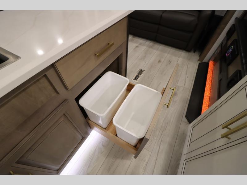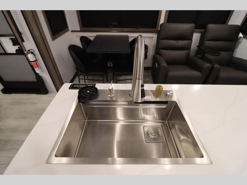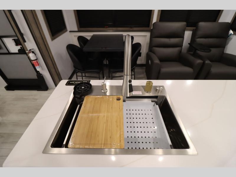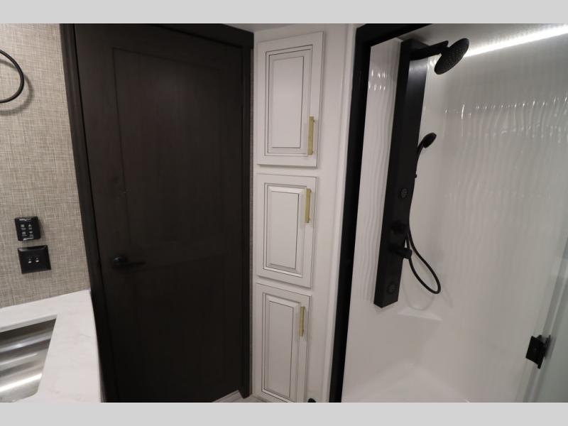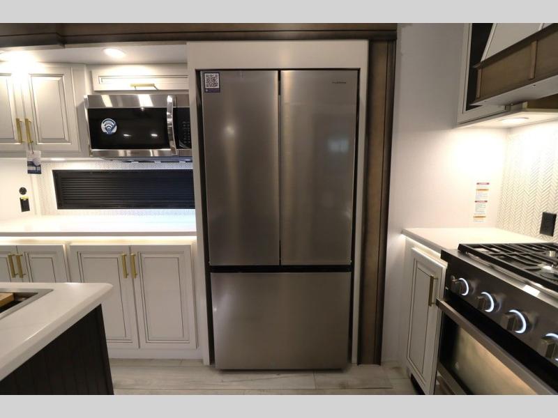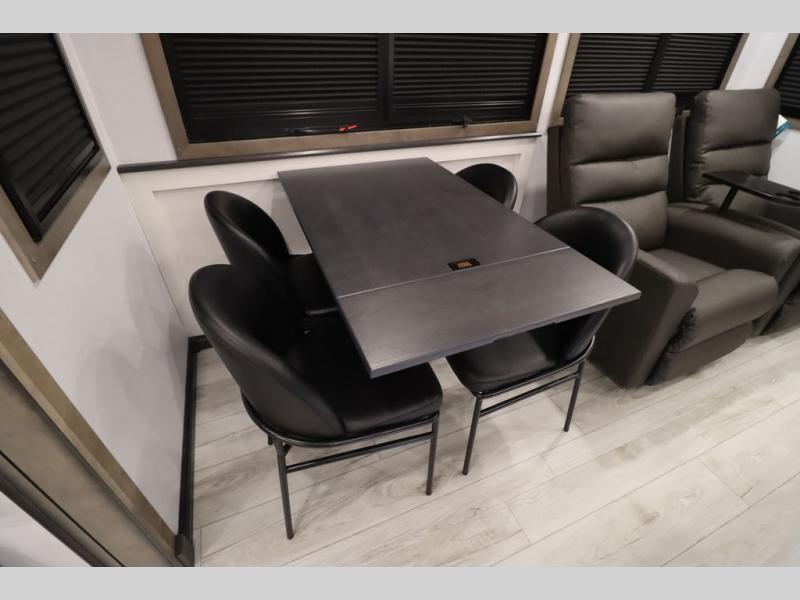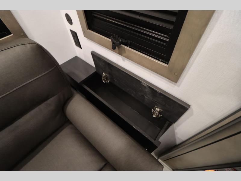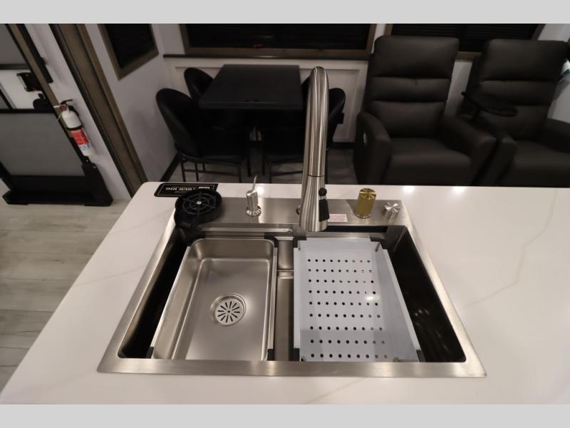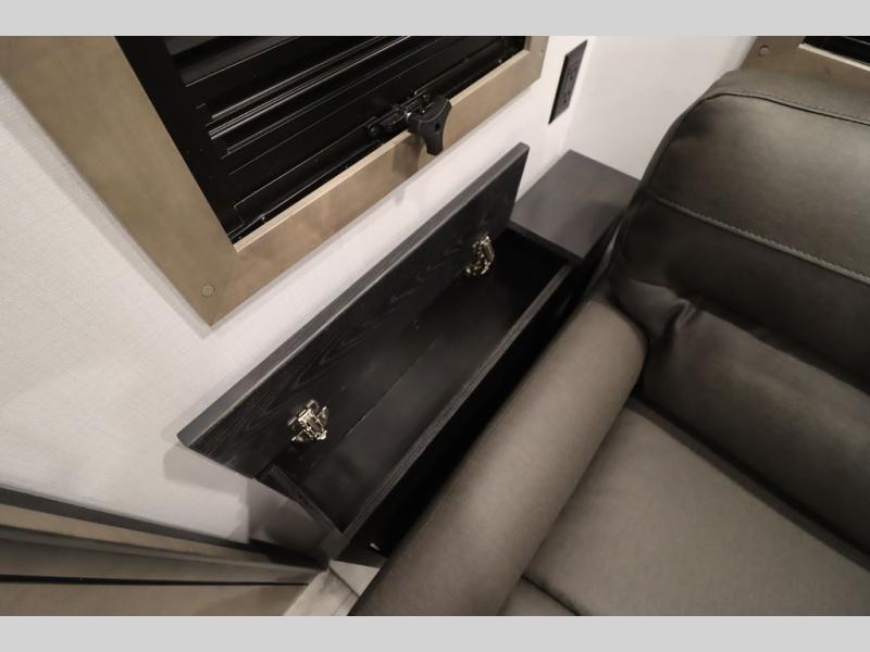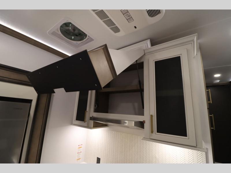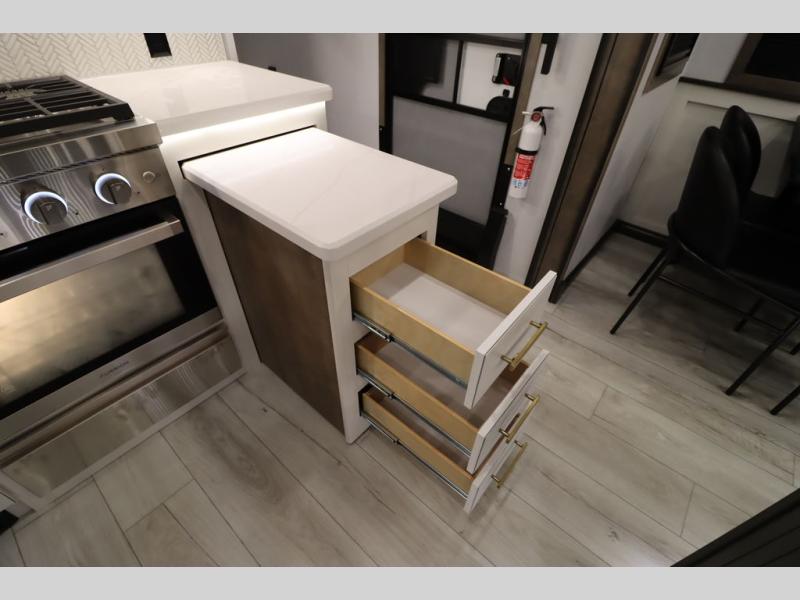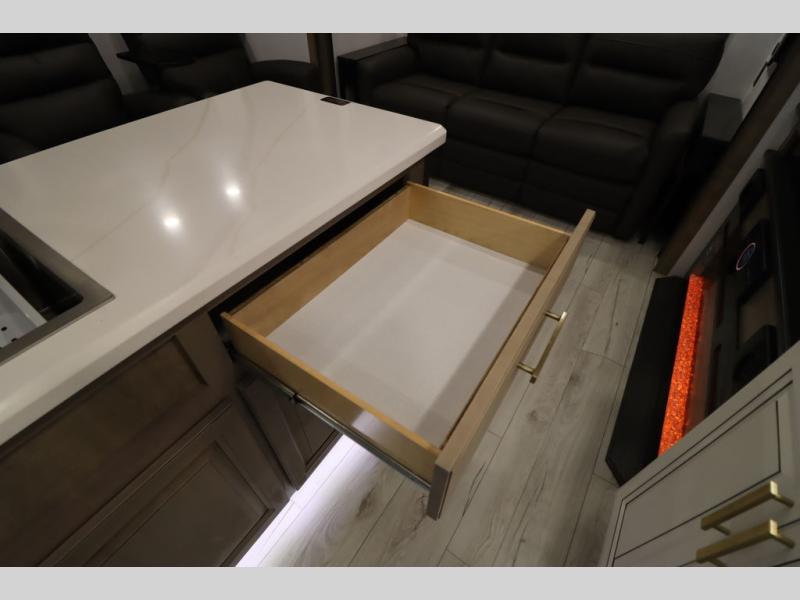 Luxury abounds throughout this fifth wheel! Starting in the kitchen with the island, two pull out pantries with extra countertop space above it, a 24" range with hidden storage, and a pull out countertop for more prepping space. The full bathroom has a 48" x 30" fiberglass shower with a seat, decorative glass enclosure, and skylight above it for more natural lighting as two get ready at once with the dual sink vanity. Sleep like a baby in the front private bedroom on the king bed slide with storage underneath and keep your clothes looking their best with two closets and additional storage. The rear living area offers true relaxation with a hide-a-bed sofa and residential power recliners across from the entertainment center with a 5,000 BTU decorative fireplace heater and 50" Smart TV to watch your favorite movies!