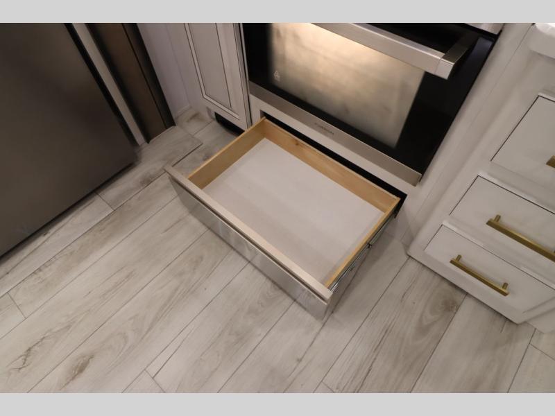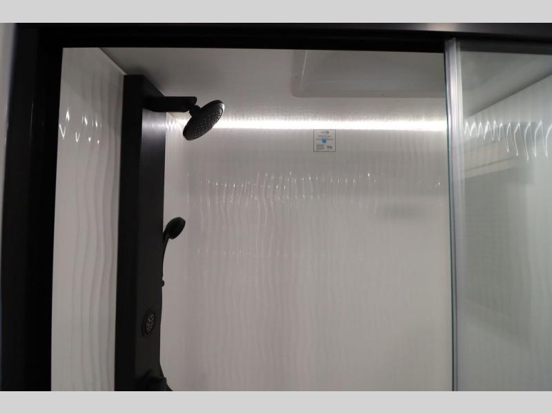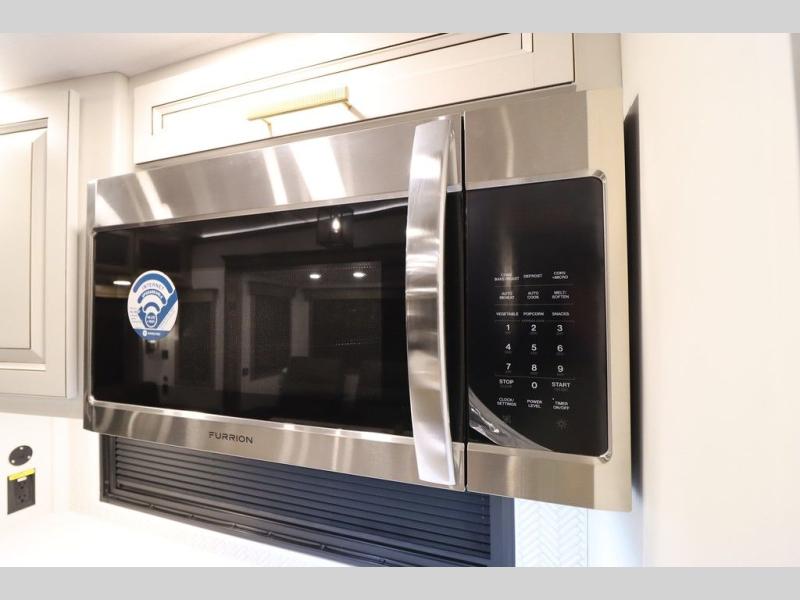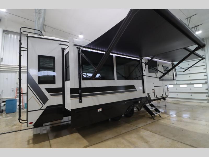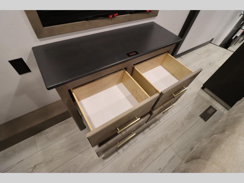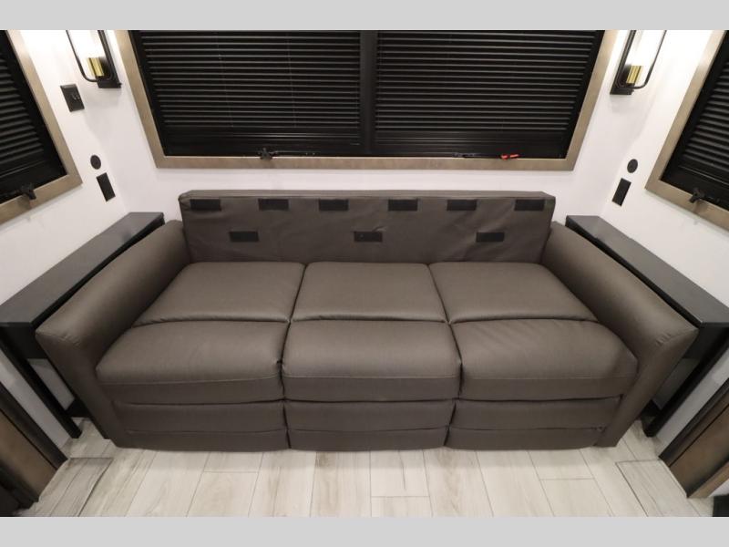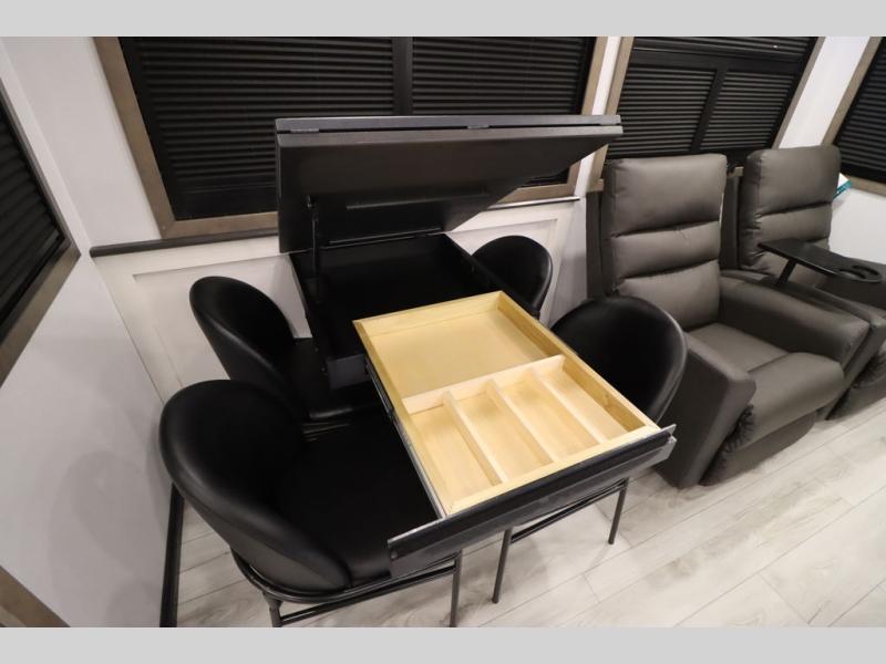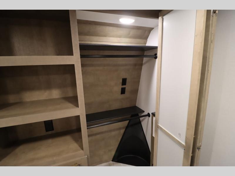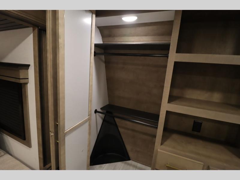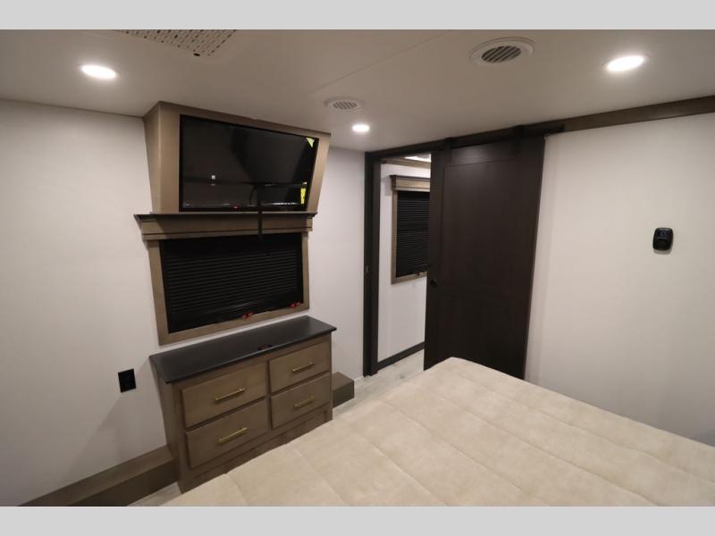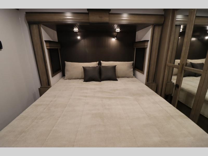 Luxury abounds throughout this fifth wheel! Starting in the kitchen with the island, two pull out pantries with extra countertop space above it, a 24" range with hidden storage, and a pull out countertop for more prepping space. The full bathroom has a 48" x 30" fiberglass shower with a seat, decorative glass enclosure, and skylight above it for more natural lighting as two get ready at once with the dual sink vanity. Sleep like a baby in the front private bedroom on the king bed slide with storage underneath and keep your clothes looking their best with two closets and additional storage. The rear living area offers true relaxation with a hide-a-bed sofa and residential power recliners across from the entertainment center with a 5,000 BTU decorative fireplace heater and 50" Smart TV to watch your favorite movies!