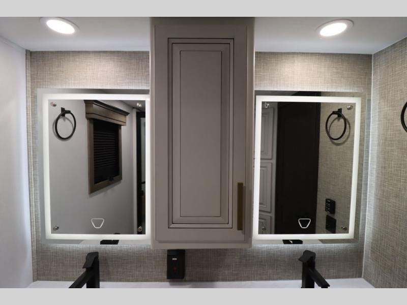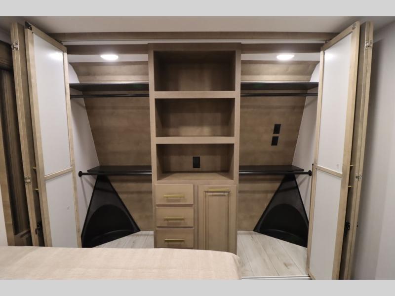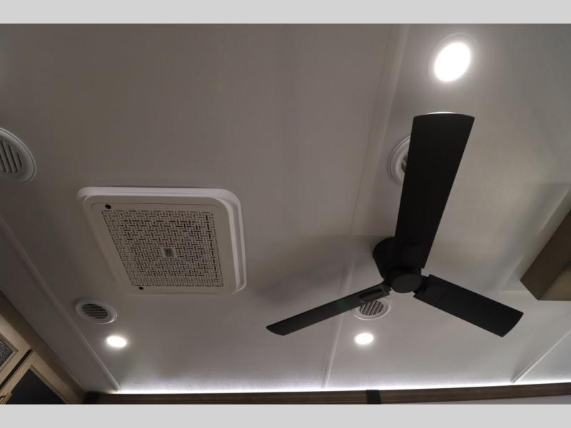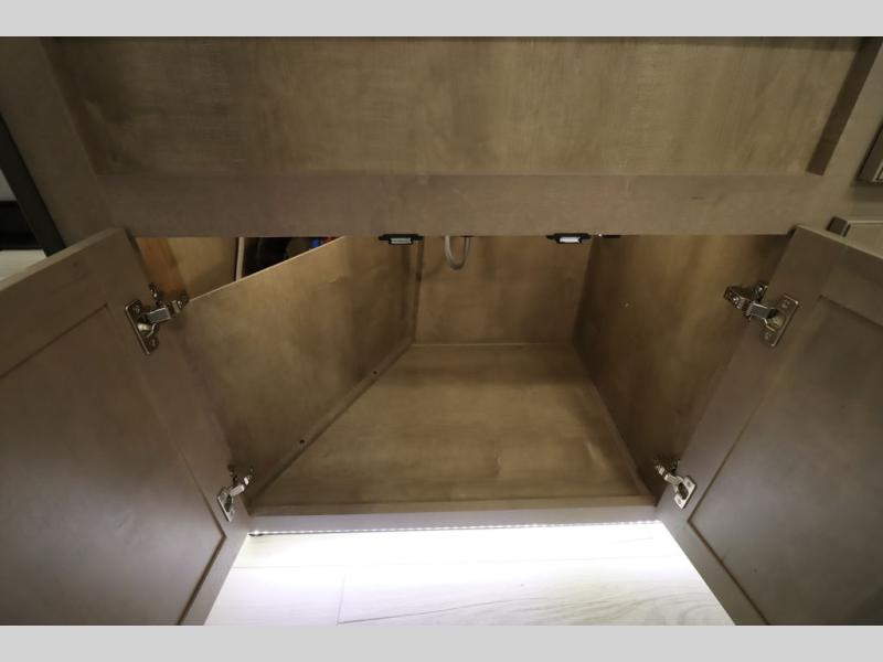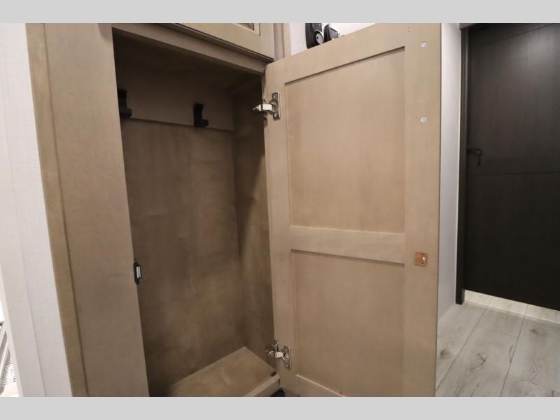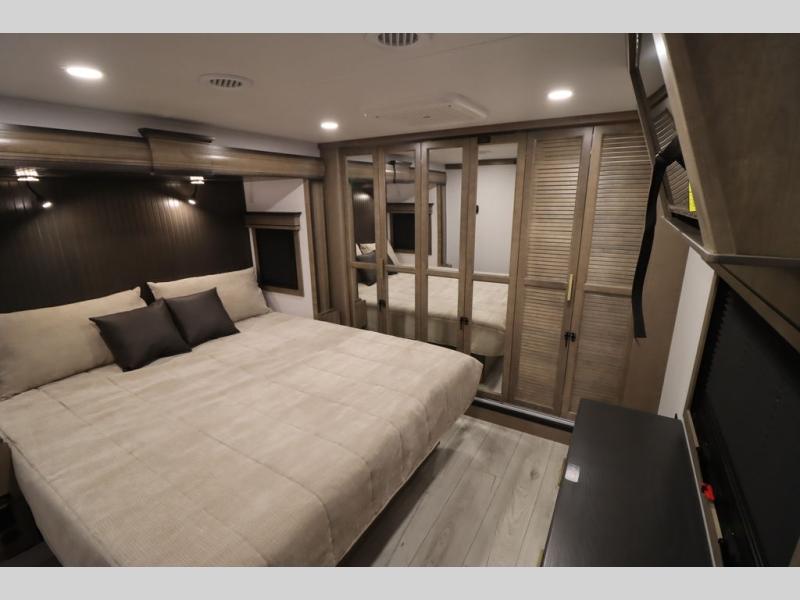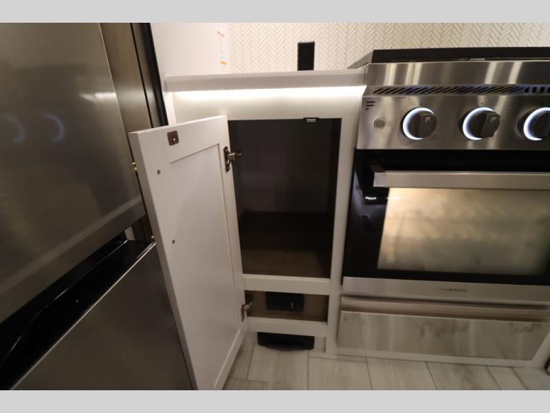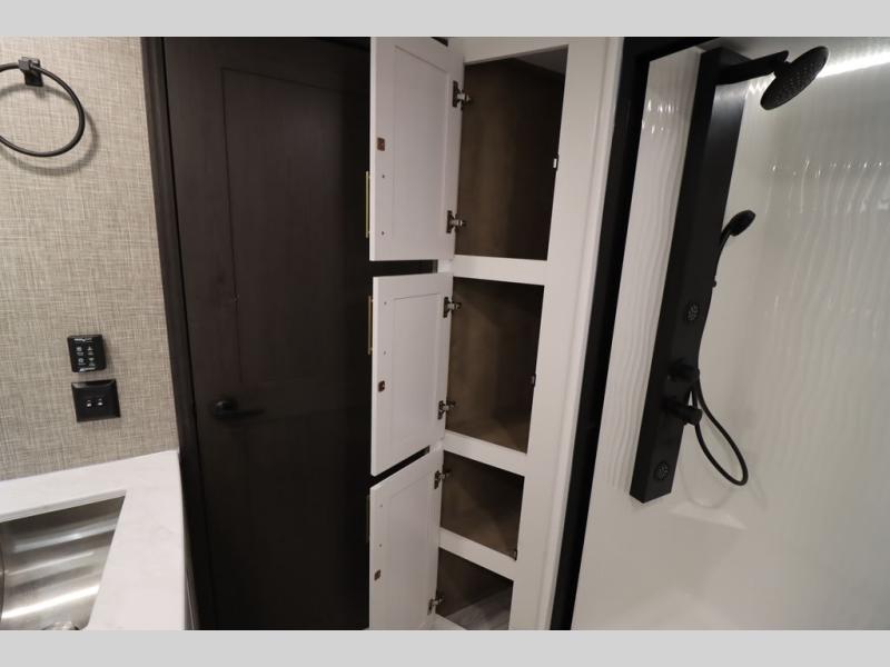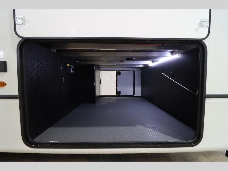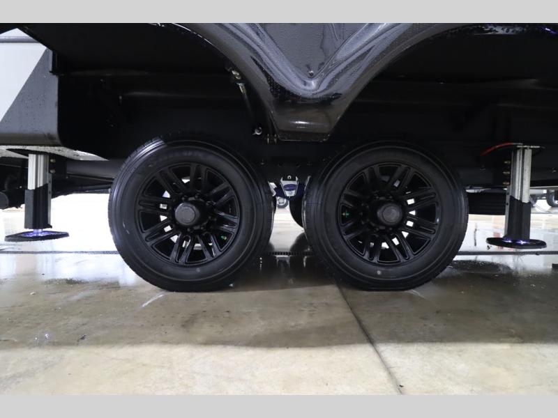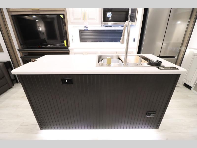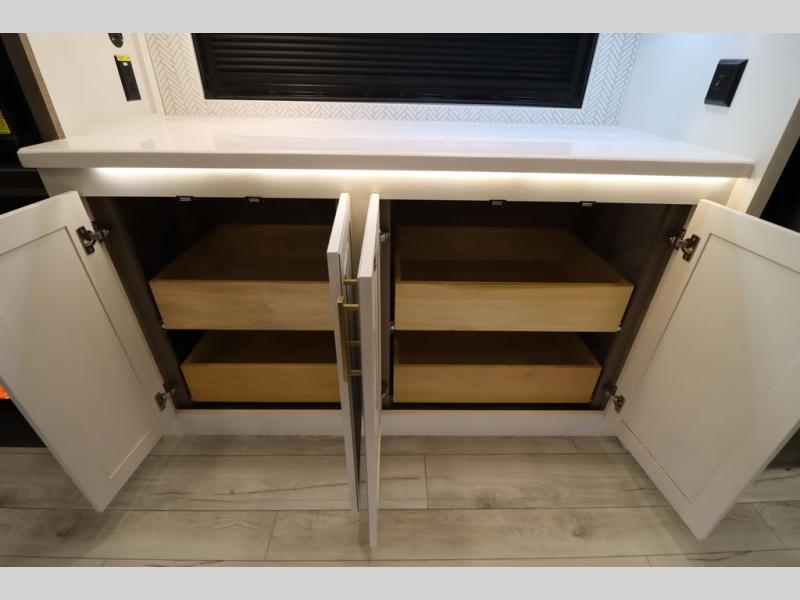 Luxury abounds throughout this fifth wheel! Starting in the kitchen with the island, two pull out pantries with extra countertop space above it, a 24" range with hidden storage, and a pull out countertop for more prepping space. The full bathroom has a 48" x 30" fiberglass shower with a seat, decorative glass enclosure, and skylight above it for more natural lighting as two get ready at once with the dual sink vanity. Sleep like a baby in the front private bedroom on the king bed slide with storage underneath and keep your clothes looking their best with two closets and additional storage. The rear living area offers true relaxation with a hide-a-bed sofa and residential power recliners across from the entertainment center with a 5,000 BTU decorative fireplace heater and 50" Smart TV to watch your favorite movies!