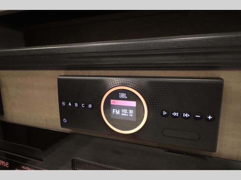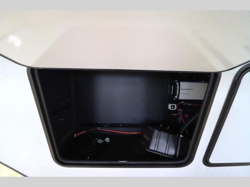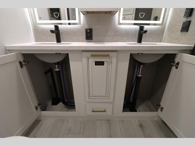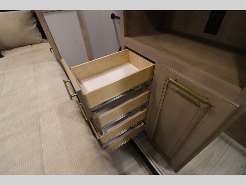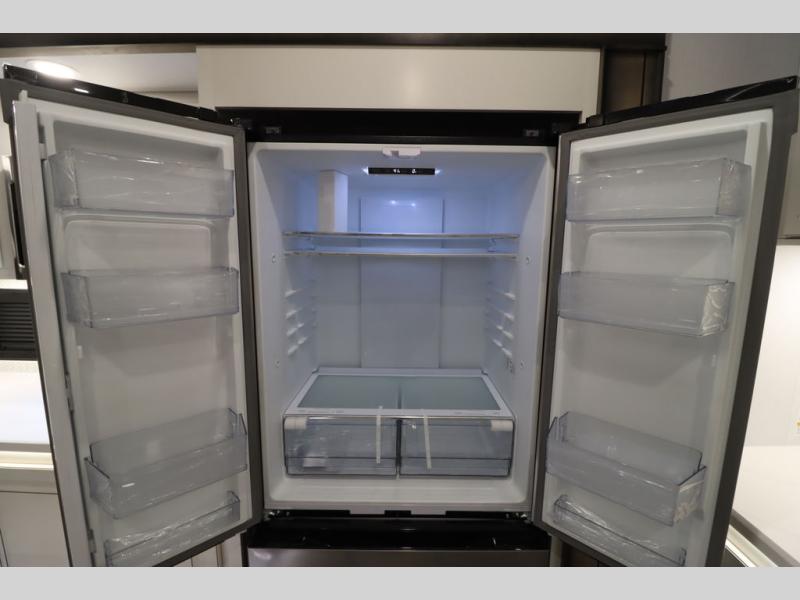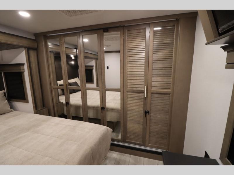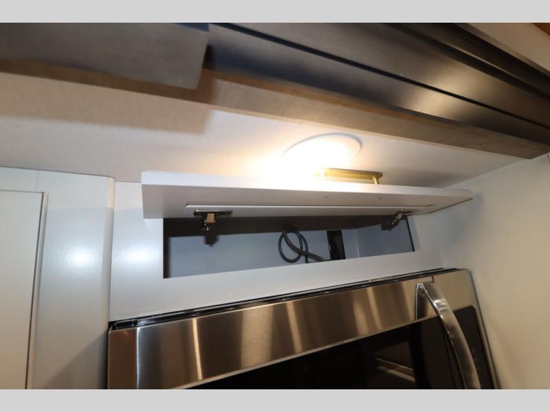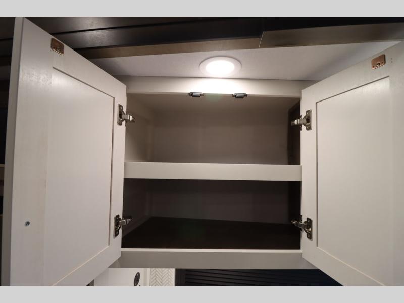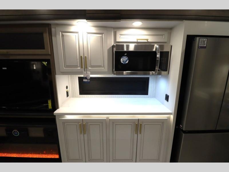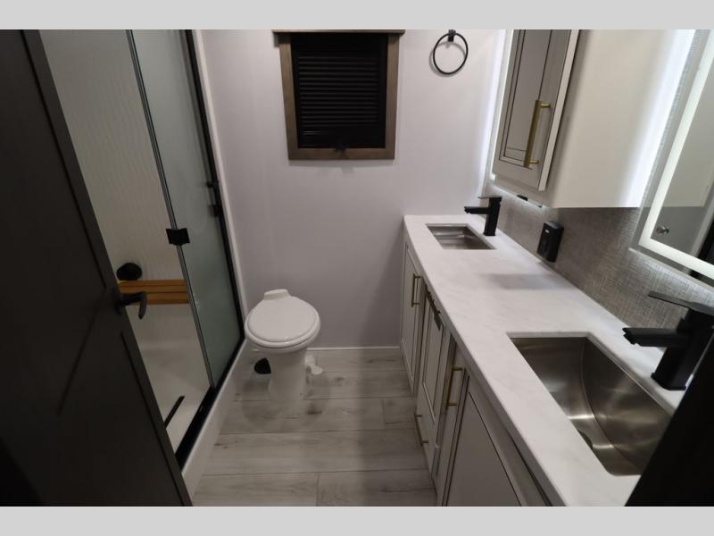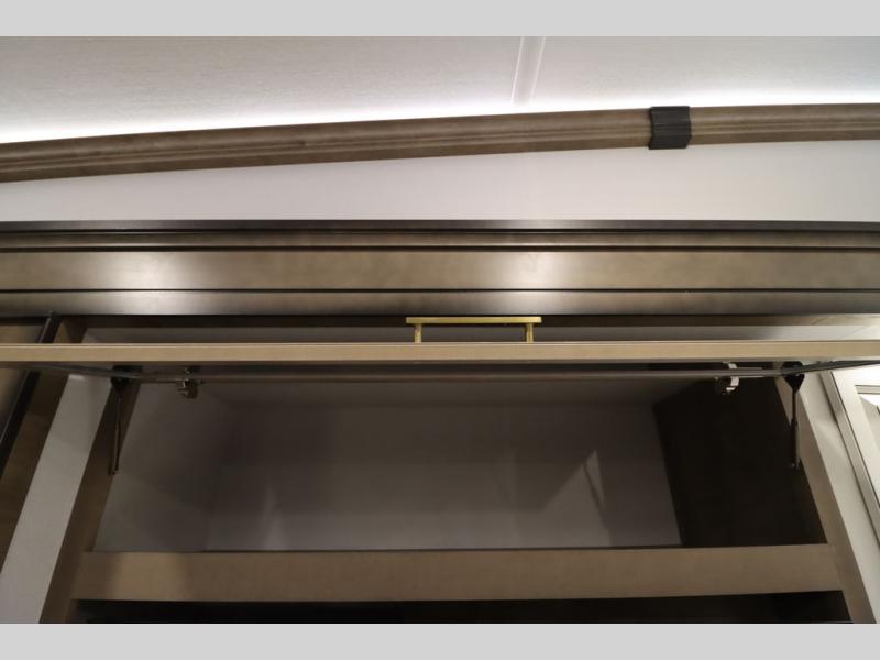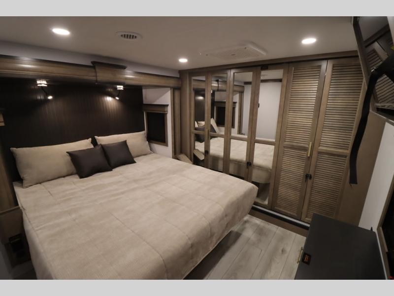 Luxury abounds throughout this fifth wheel! Starting in the kitchen with the island, two pull out pantries with extra countertop space above it, a 24" range with hidden storage, and a pull out countertop for more prepping space. The full bathroom has a 48" x 30" fiberglass shower with a seat, decorative glass enclosure, and skylight above it for more natural lighting as two get ready at once with the dual sink vanity. Sleep like a baby in the front private bedroom on the king bed slide with storage underneath and keep your clothes looking their best with two closets and additional storage. The rear living area offers true relaxation with a hide-a-bed sofa and residential power recliners across from the entertainment center with a 5,000 BTU decorative fireplace heater and 50" Smart TV to watch your favorite movies!