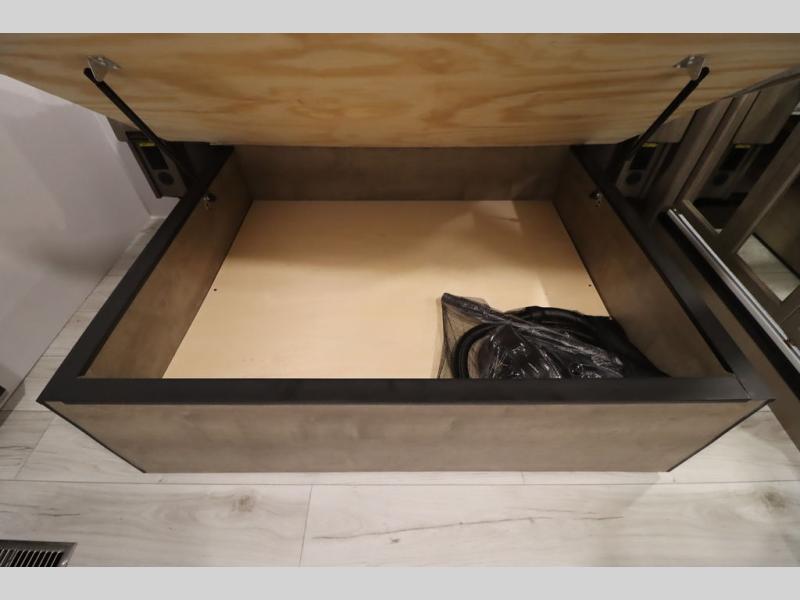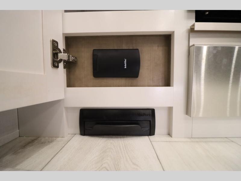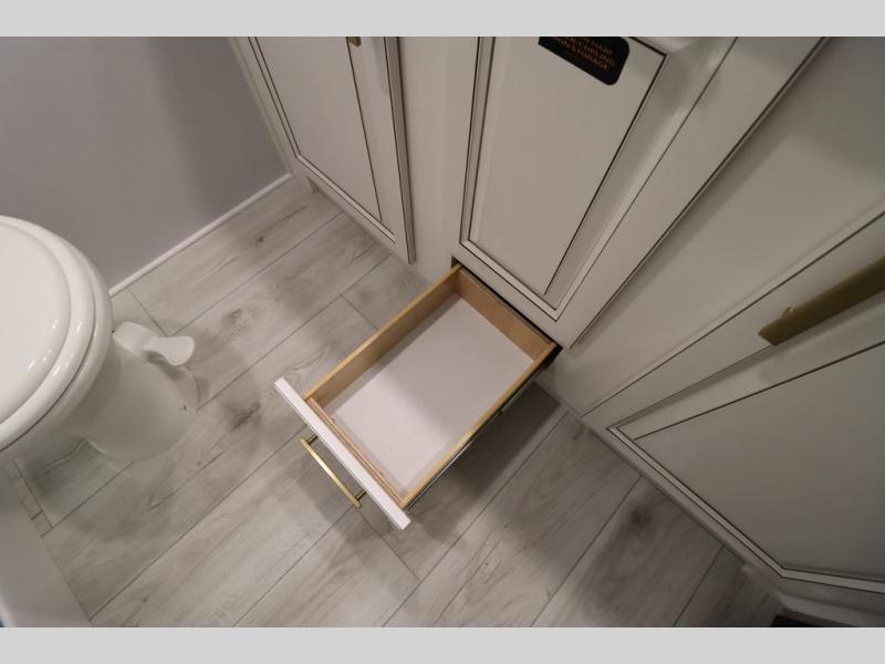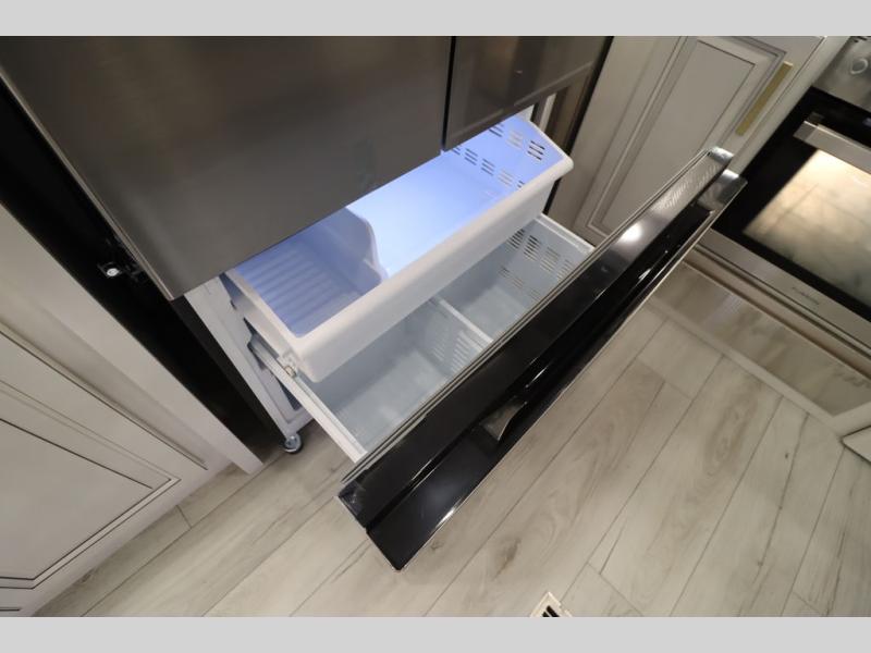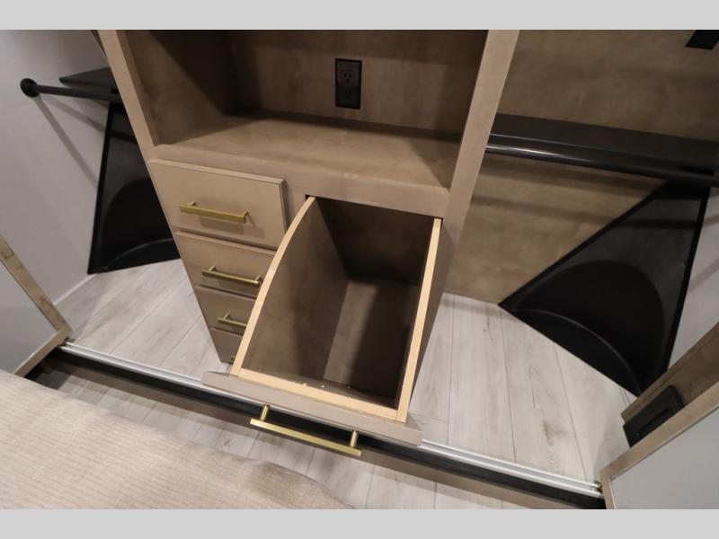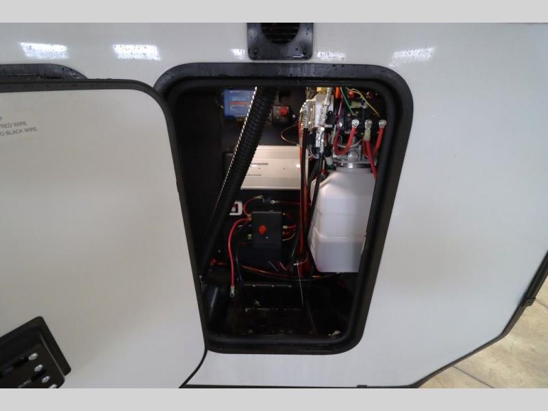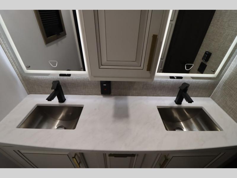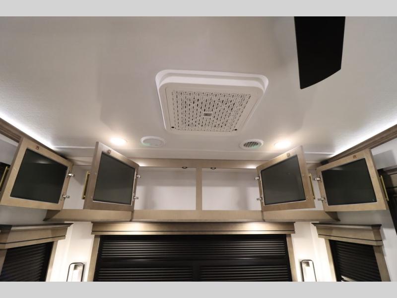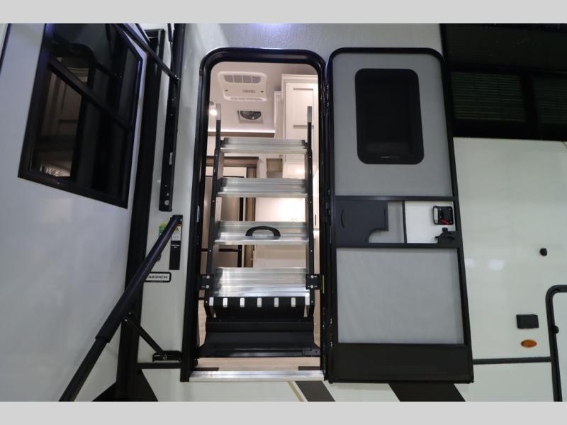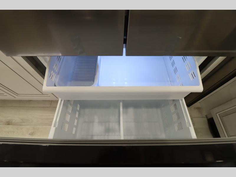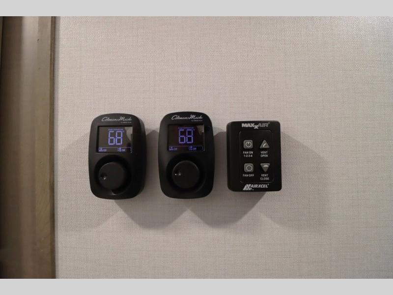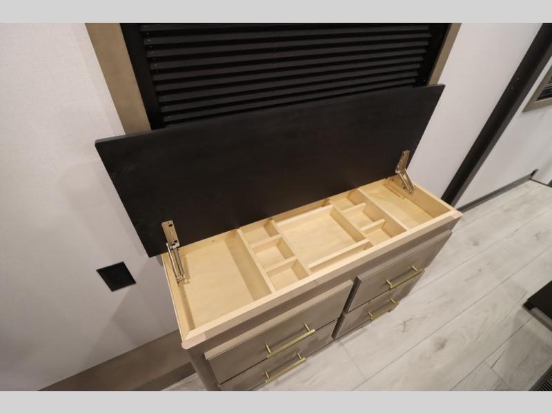 Luxury abounds throughout this fifth wheel! Starting in the kitchen with the island, two pull out pantries with extra countertop space above it, a 24" range with hidden storage, and a pull out countertop for more prepping space. The full bathroom has a 48" x 30" fiberglass shower with a seat, decorative glass enclosure, and skylight above it for more natural lighting as two get ready at once with the dual sink vanity. Sleep like a baby in the front private bedroom on the king bed slide with storage underneath and keep your clothes looking their best with two closets and additional storage. The rear living area offers true relaxation with a hide-a-bed sofa and residential power recliners across from the entertainment center with a 5,000 BTU decorative fireplace heater and 50" Smart TV to watch your favorite movies!
