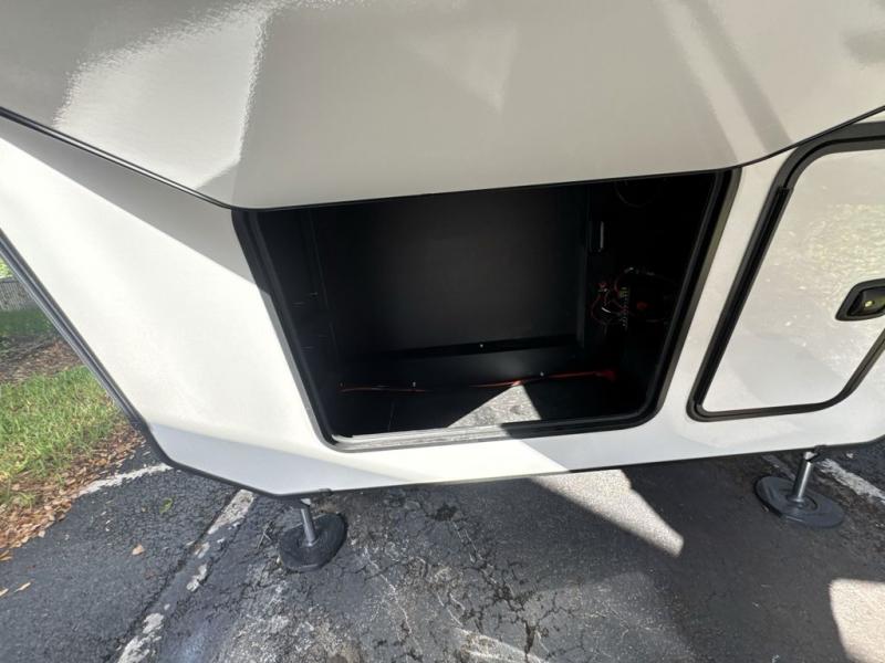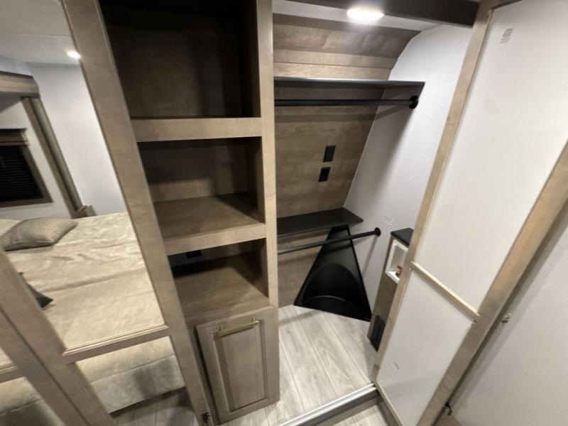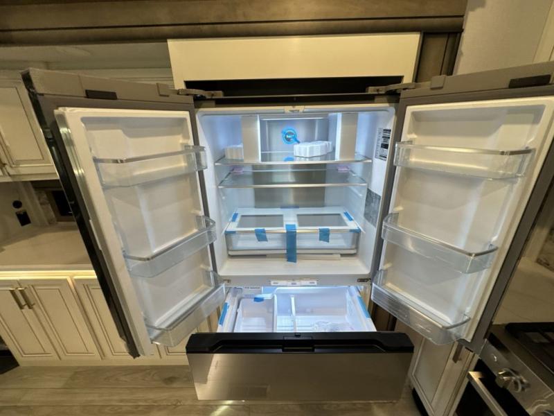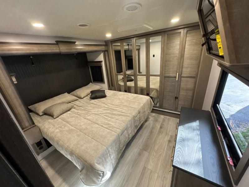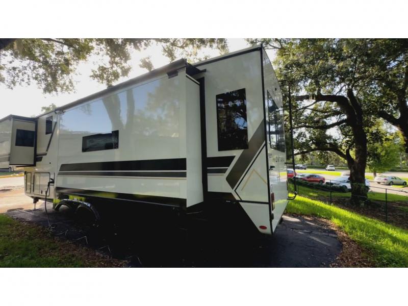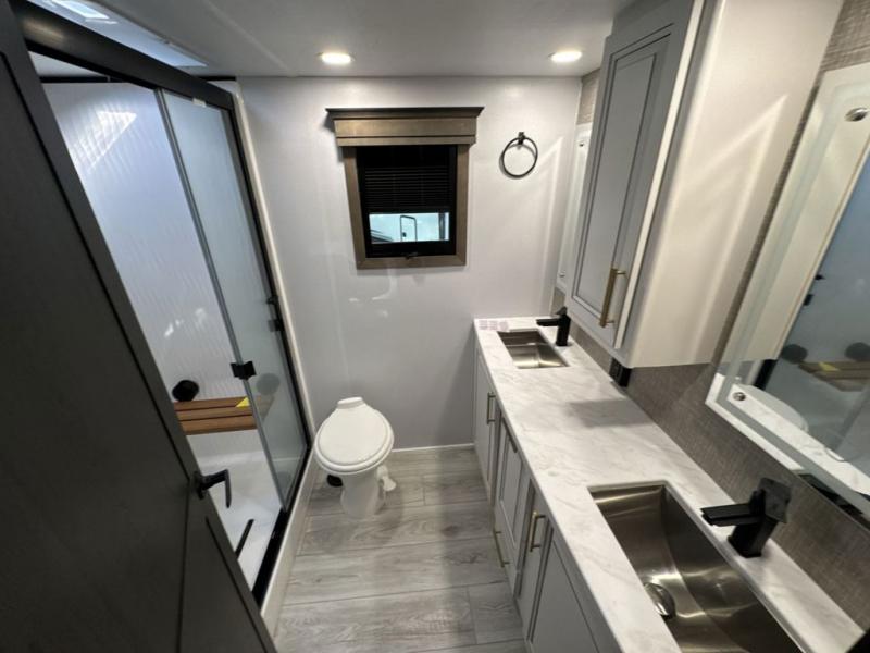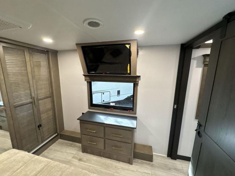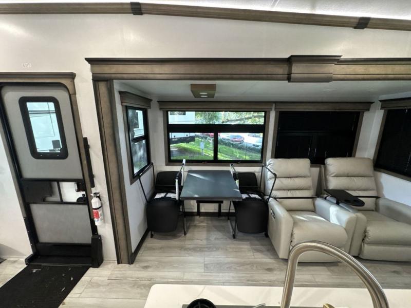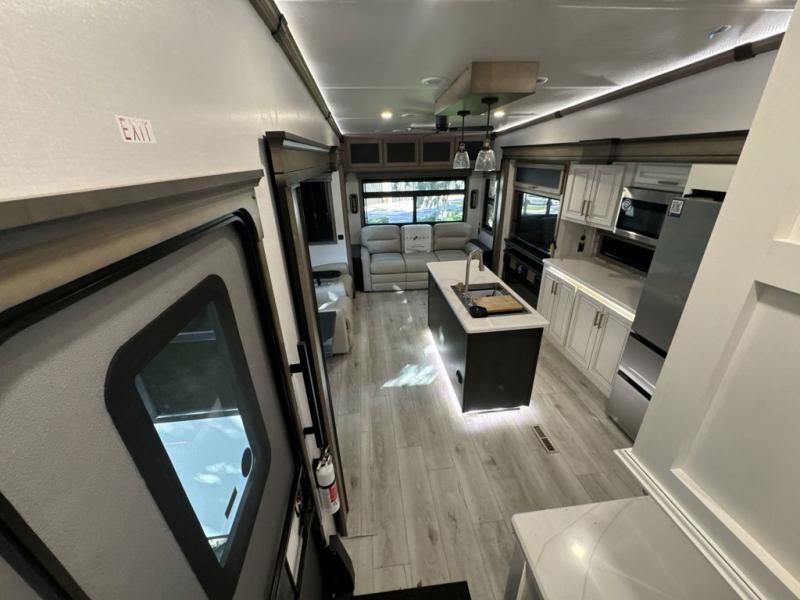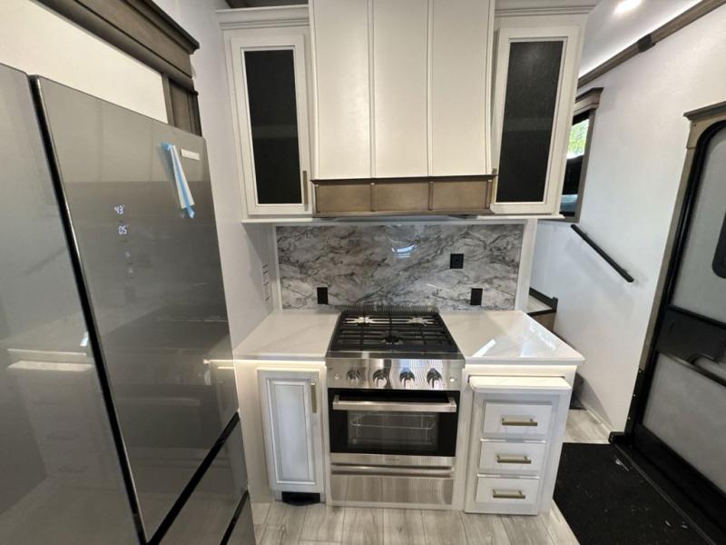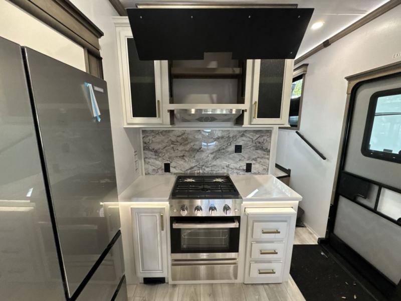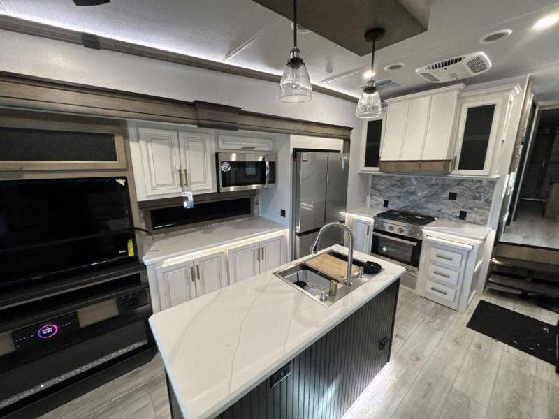 Luxury abounds throughout this fifth wheel! Starting in the kitchen with the island, two pull out pantries with extra countertop space above it, a 24" range with hidden storage, and a pull out countertop for more prepping space. The full bathroom has a 48" x 30" fiberglass shower with a seat, decorative glass enclosure, and skylight above it for more natural lighting as two get ready at once with the dual sink vanity. Sleep like a baby in the front private bedroom on the king bed slide with storage underneath and keep your clothes looking their best with two closets and additional storage. The rear living area offers true relaxation with a hide-a-bed sofa and residential power recliners across from the entertainment center with a 5,000 BTU decorative fireplace heater and 50" Smart TV to watch your favorite movies!