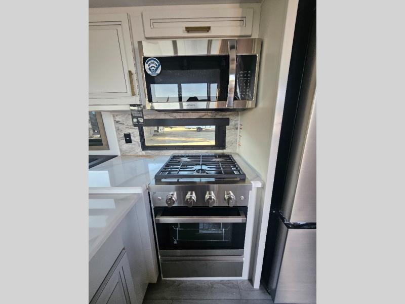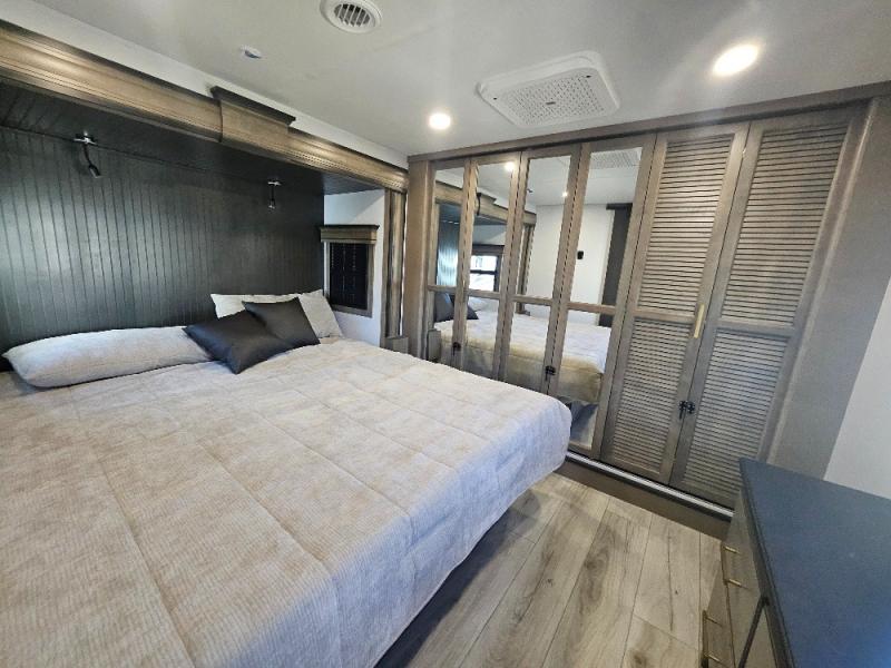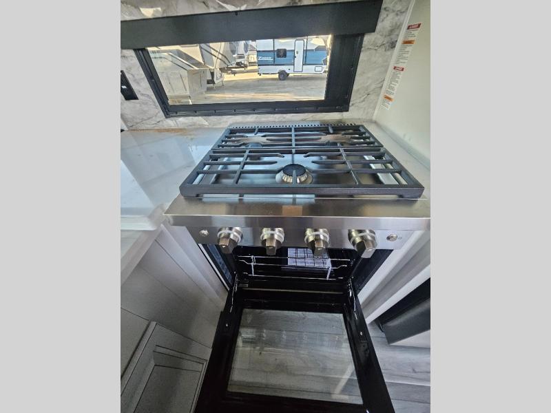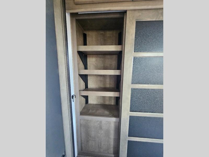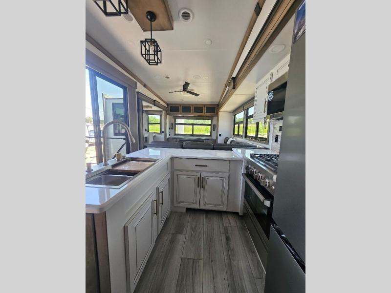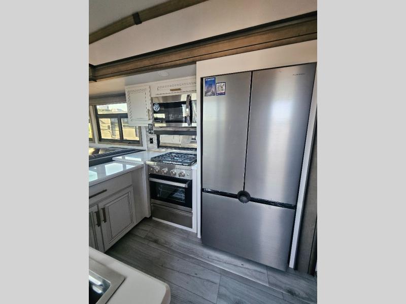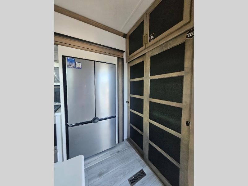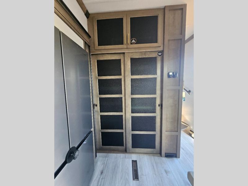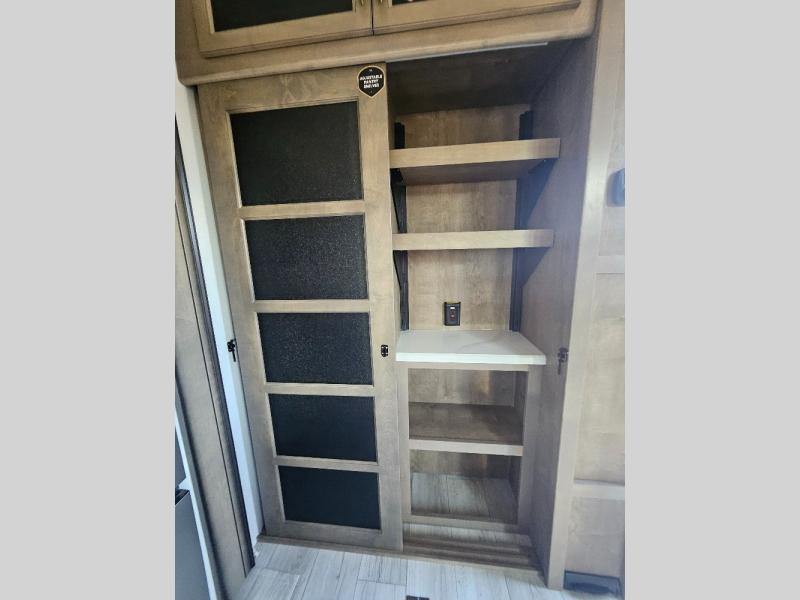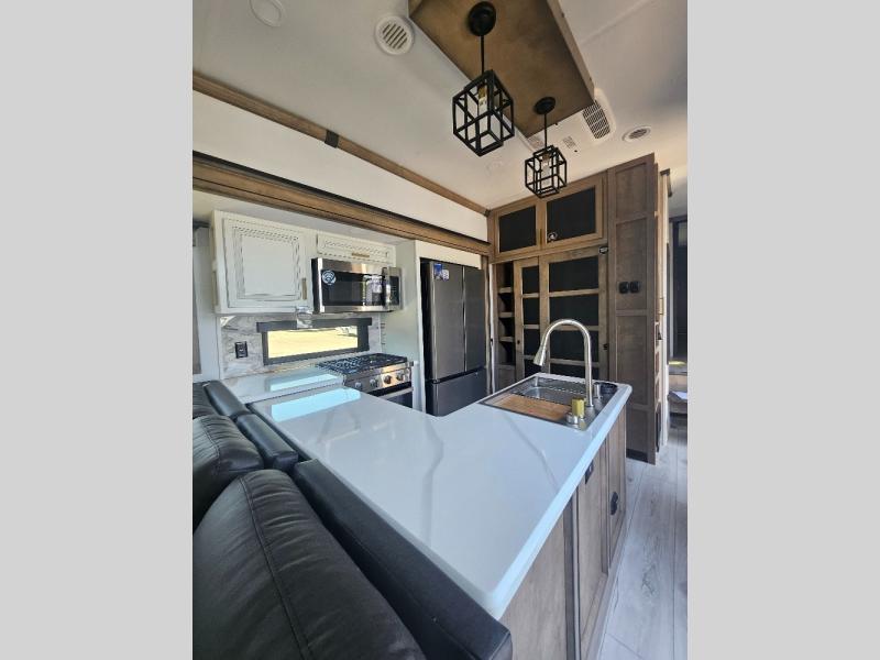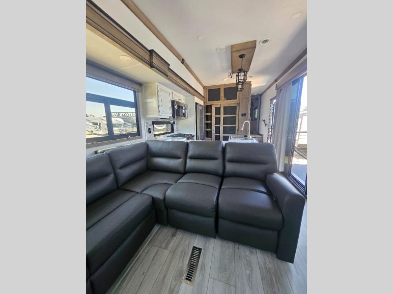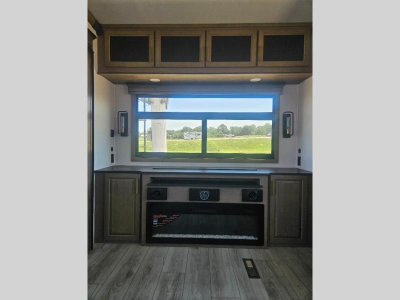 Luxury abounds throughout this fifth wheel starting in the centrally located kitchen featuring an L-shaped counter, a pull down storage pantry, a 24" range with an overhead convection microwave, and an 18 cu. ft. residential refrigerator with ice an maker. Just up the steps to the right of the entry, you will find a spacious bathroom featuring a 48" x 30" fiberglass shower with a seat, decorative glass enclosure, linen cabinet, and skylight above it for more natural lighting. Sleep like a baby in the front private bedroom on the king bed slide with storage underneath, and keep your clothes looking their best with the front closets. The rear entertainment living area offers true relaxation with L-shaped seating including a hide-a-bed sofa along the roadside, and powered theater seating facing the entertainment center with a 5,000 BTU decorative fireplace heater and Smart TV to watch your favorite movies! And don't overlook the best part, the powered side patio to entertain guests!