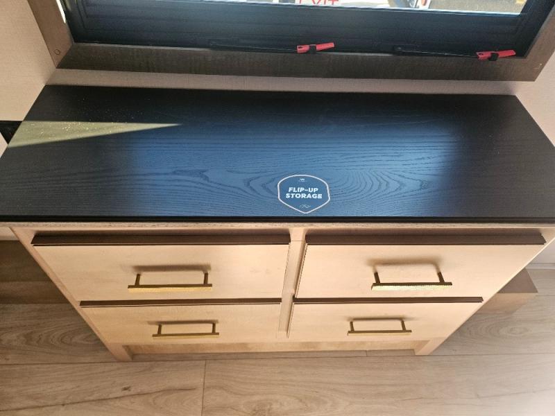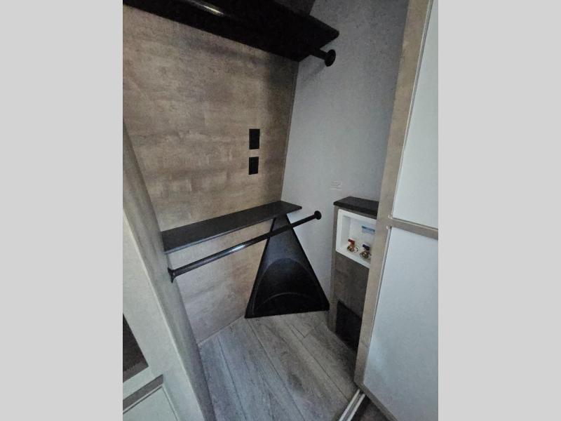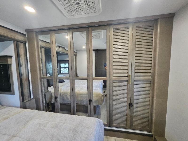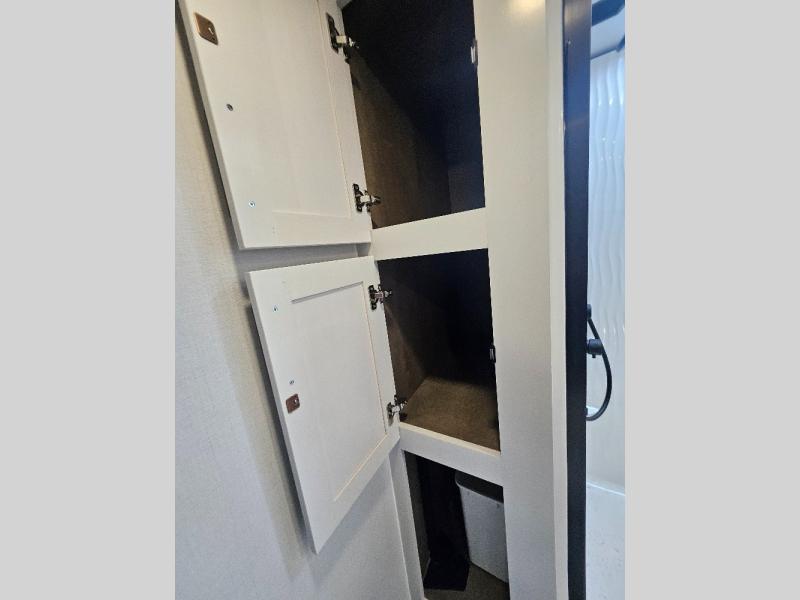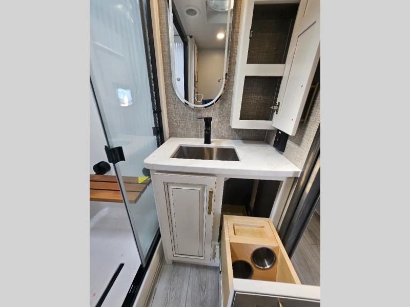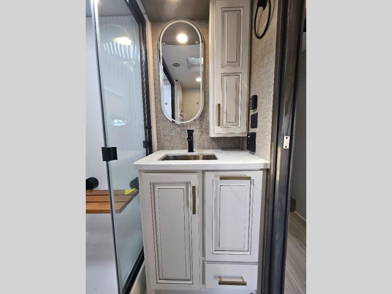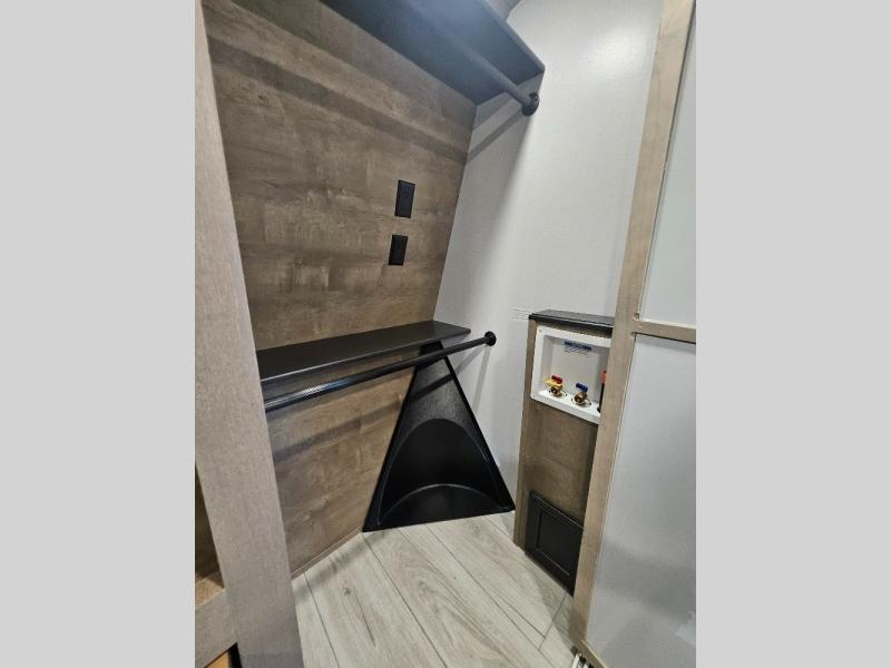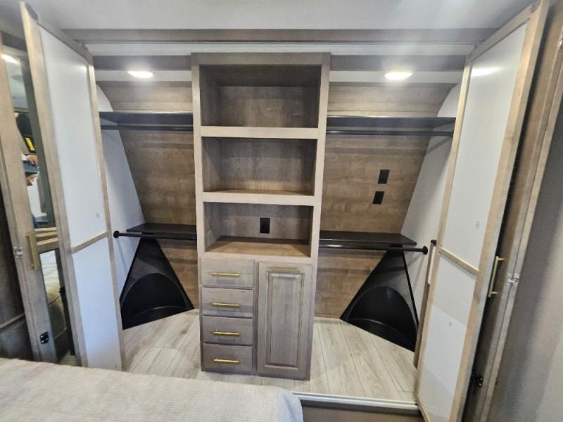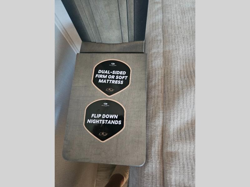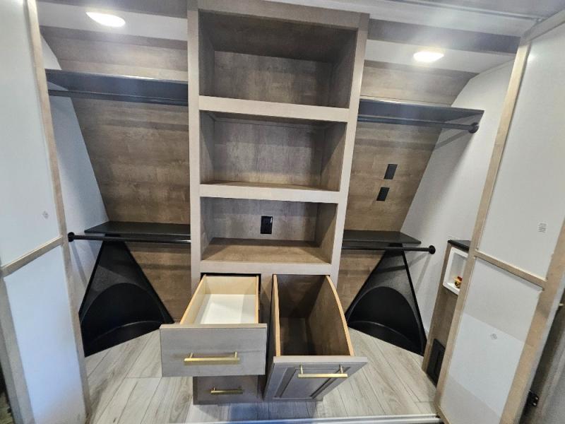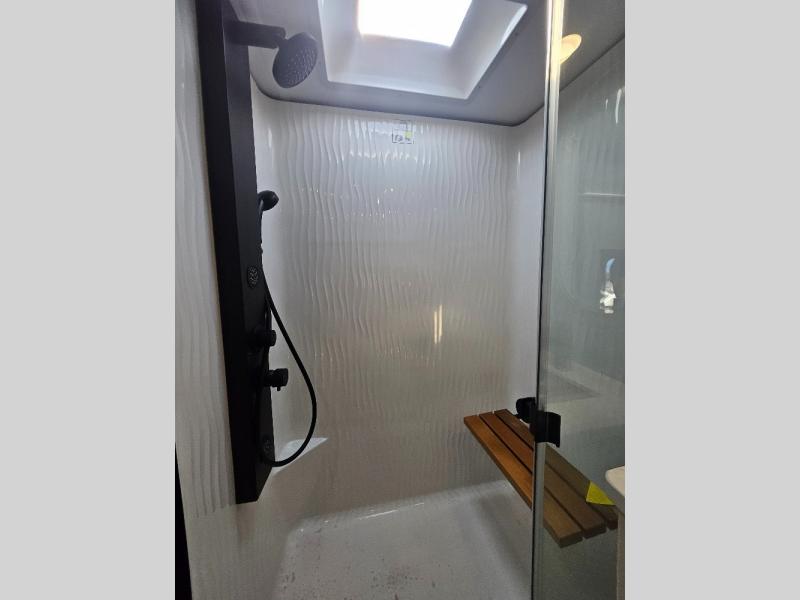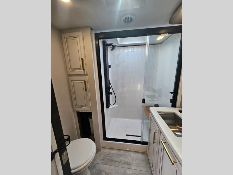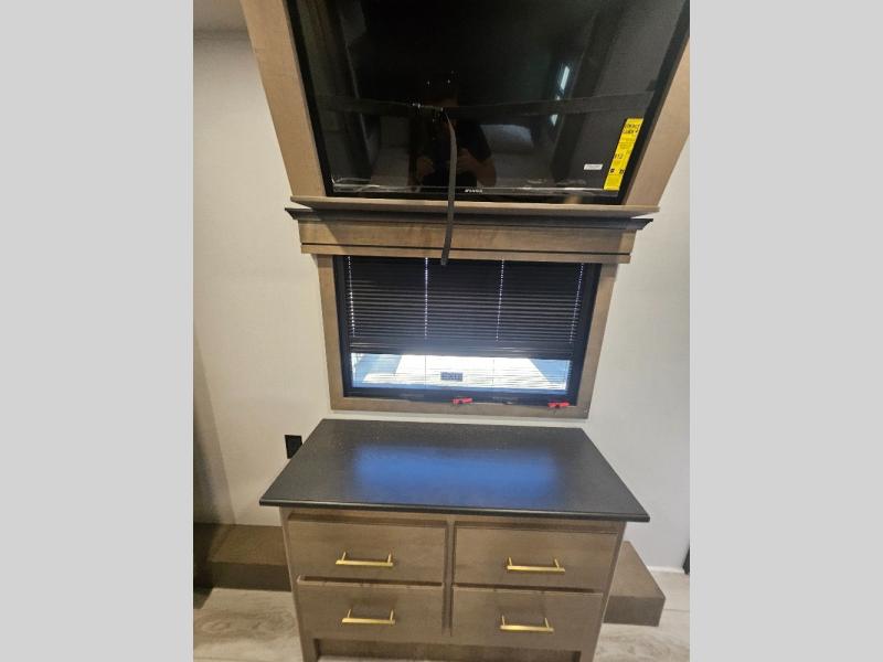 Luxury abounds throughout this fifth wheel starting in the centrally located kitchen featuring an L-shaped counter, a pull down storage pantry, a 24" range with an overhead convection microwave, and an 18 cu. ft. residential refrigerator with ice an maker. Just up the steps to the right of the entry, you will find a spacious bathroom featuring a 48" x 30" fiberglass shower with a seat, decorative glass enclosure, linen cabinet, and skylight above it for more natural lighting. Sleep like a baby in the front private bedroom on the king bed slide with storage underneath, and keep your clothes looking their best with the front closets. The rear entertainment living area offers true relaxation with L-shaped seating including a hide-a-bed sofa along the roadside, and powered theater seating facing the entertainment center with a 5,000 BTU decorative fireplace heater and Smart TV to watch your favorite movies! And don't overlook the best part, the powered side patio to entertain guests!