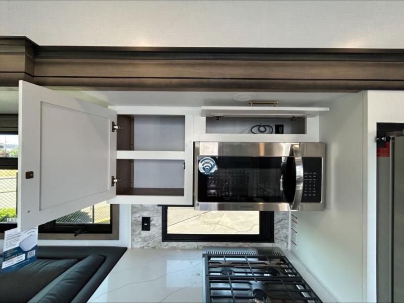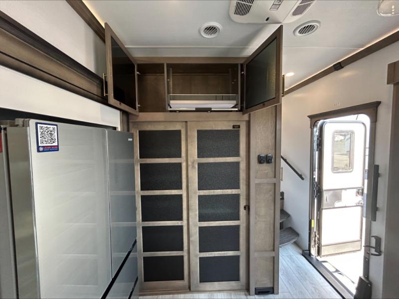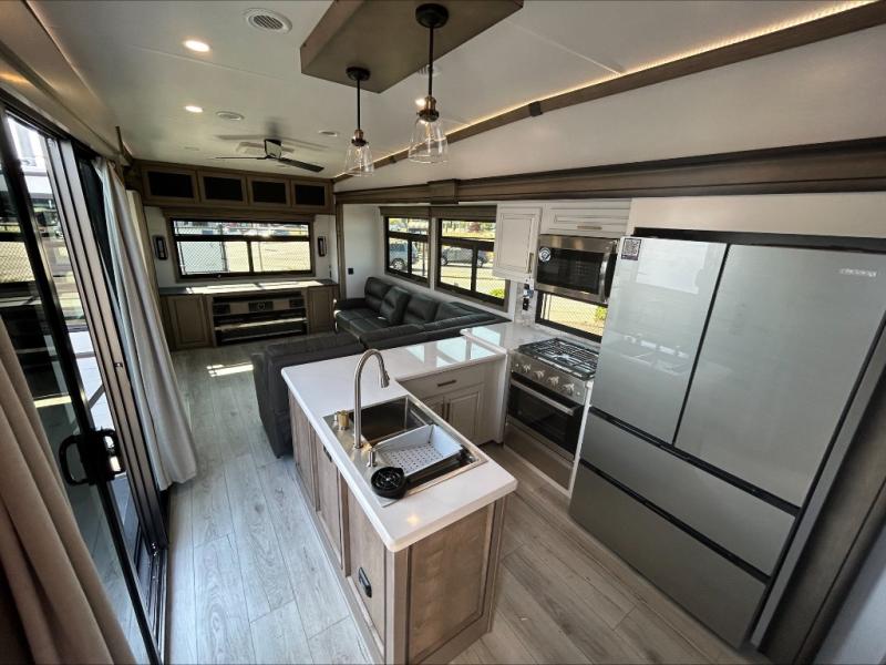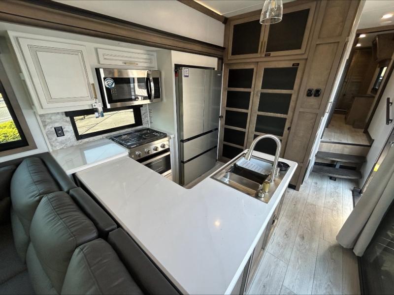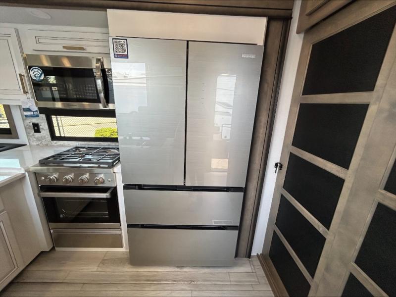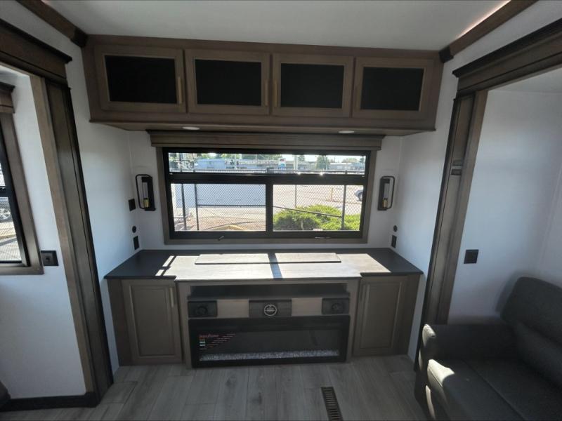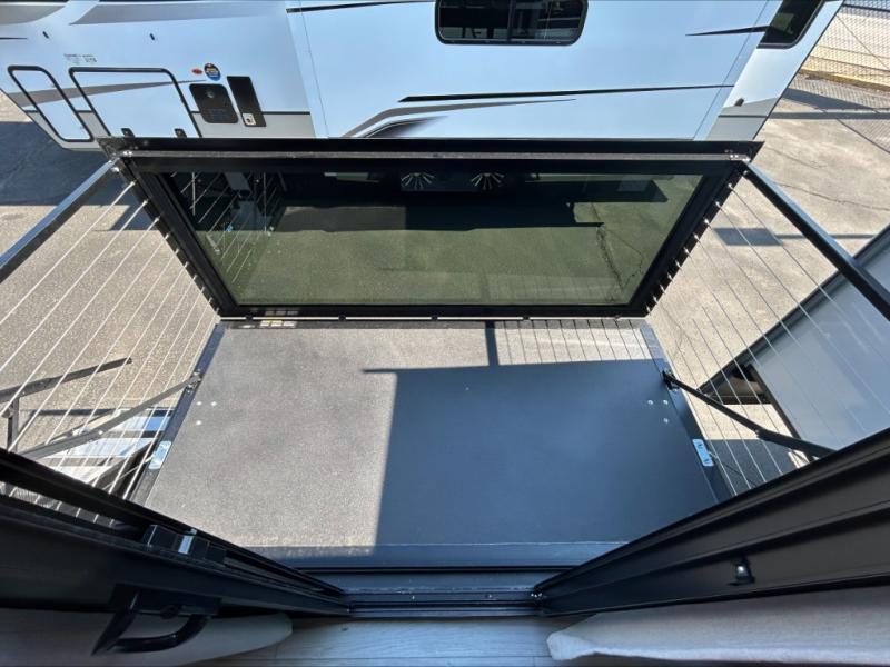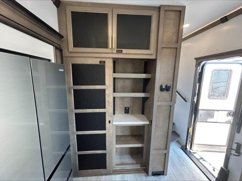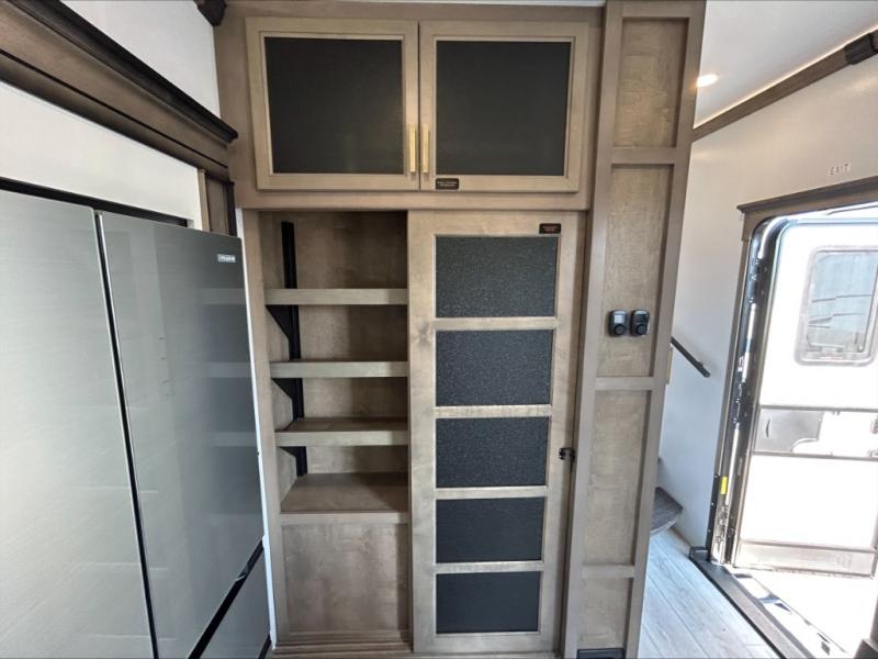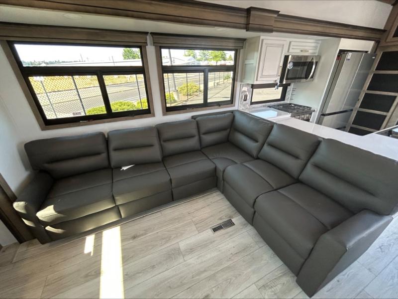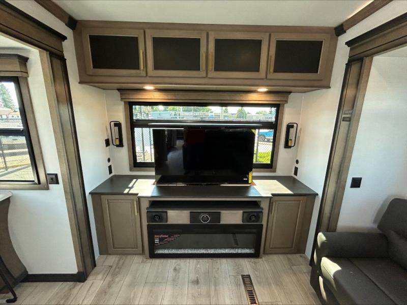 Luxury abounds throughout this fifth wheel starting in the centrally located kitchen featuring an L-shaped counter, a pull down storage pantry, a 24" range with an overhead convection microwave, and an 18 cu. ft. residential refrigerator with ice an maker. Just up the steps to the right of the entry, you will find a spacious bathroom featuring a 48" x 30" fiberglass shower with a seat, decorative glass enclosure, linen cabinet, and skylight above it for more natural lighting. Sleep like a baby in the front private bedroom on the king bed slide with storage underneath, and keep your clothes looking their best with the front closets. The rear entertainment living area offers true relaxation with L-shaped seating including a hide-a-bed sofa along the roadside, and powered theater seating facing the entertainment center with a 5,000 BTU decorative fireplace heater and Smart TV to watch your favorite movies! And don't overlook the best part, the powered side patio to entertain guests!