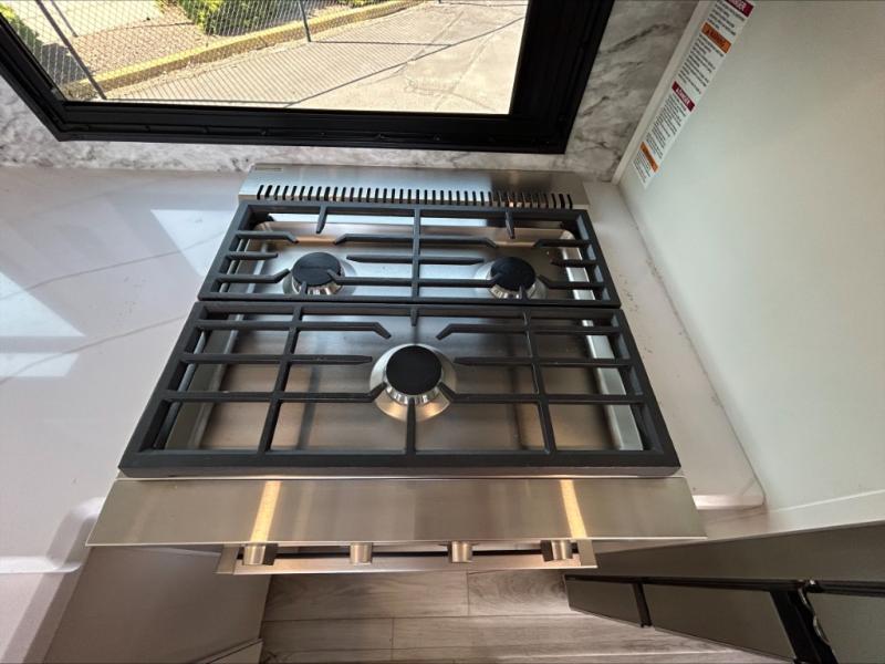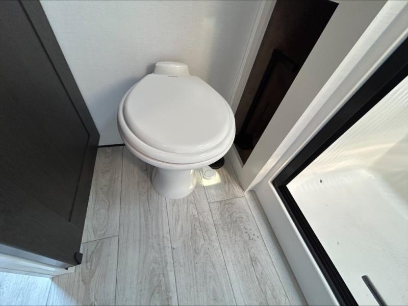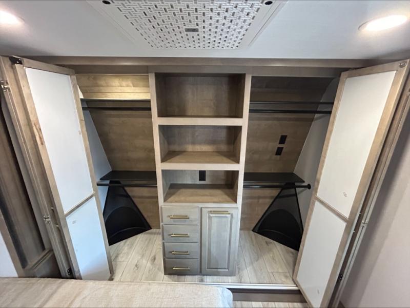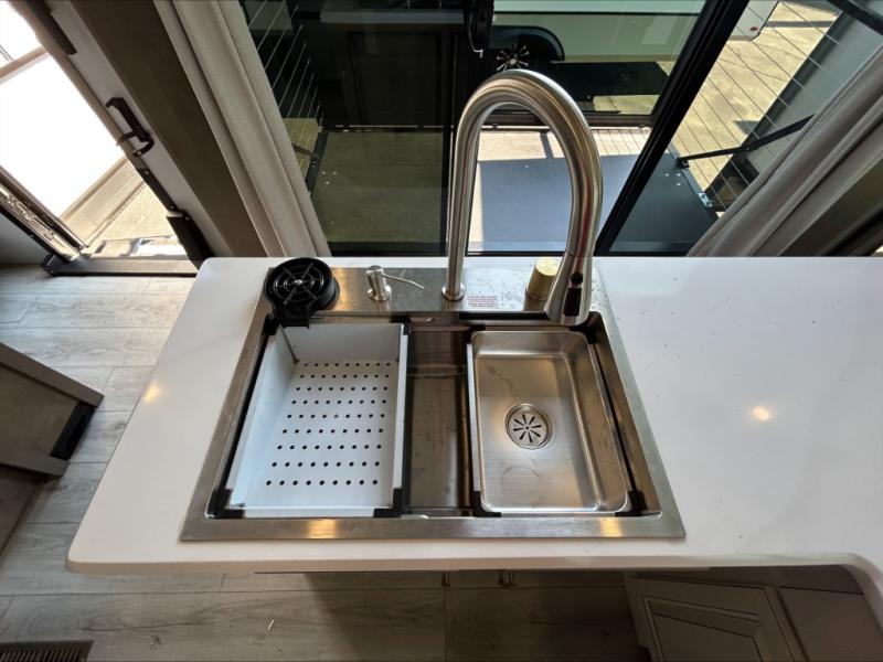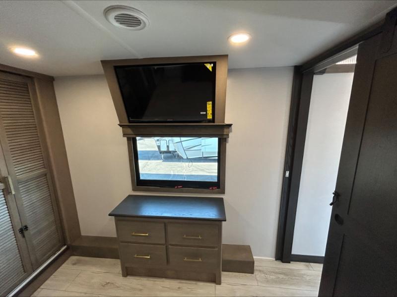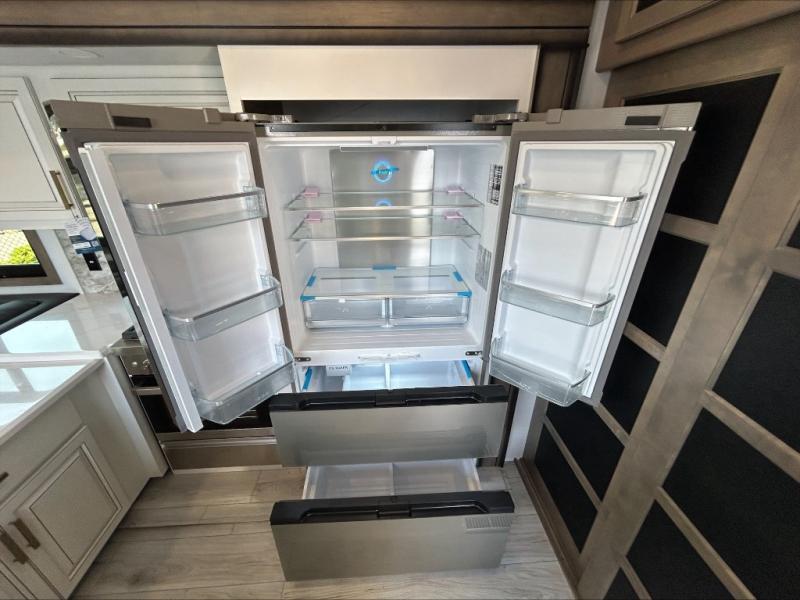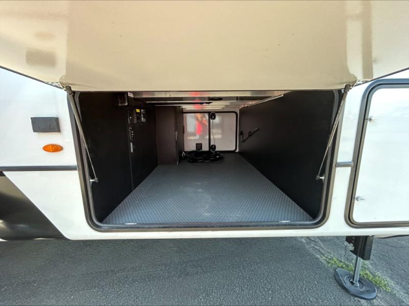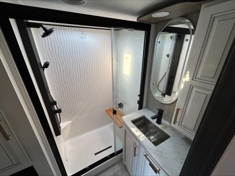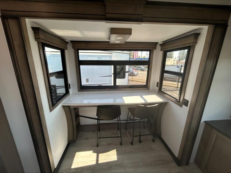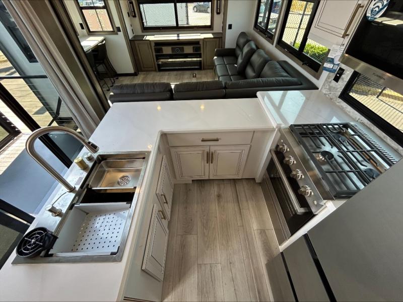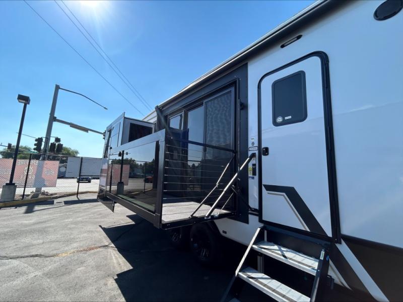 Luxury abounds throughout this fifth wheel starting in the centrally located kitchen featuring an L-shaped counter, a pull down storage pantry, a 24" range with an overhead convection microwave, and an 18 cu. ft. residential refrigerator with ice an maker. Just up the steps to the right of the entry, you will find a spacious bathroom featuring a 48" x 30" fiberglass shower with a seat, decorative glass enclosure, linen cabinet, and skylight above it for more natural lighting. Sleep like a baby in the front private bedroom on the king bed slide with storage underneath, and keep your clothes looking their best with the front closets. The rear entertainment living area offers true relaxation with L-shaped seating including a hide-a-bed sofa along the roadside, and powered theater seating facing the entertainment center with a 5,000 BTU decorative fireplace heater and Smart TV to watch your favorite movies! And don't overlook the best part, the powered side patio to entertain guests!
