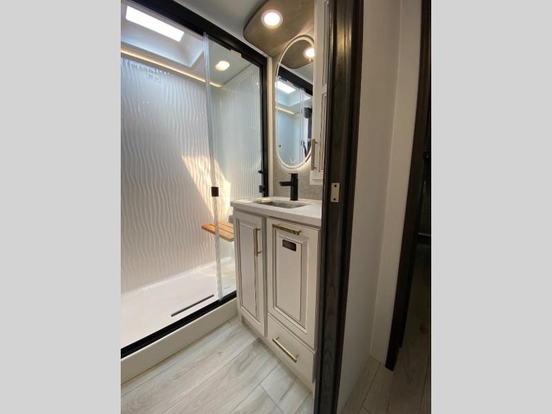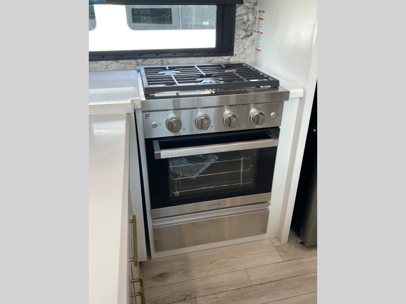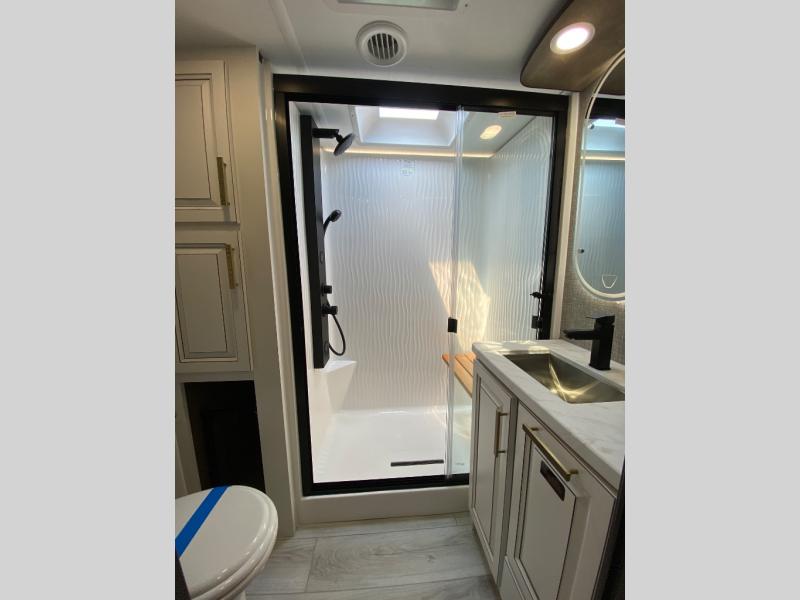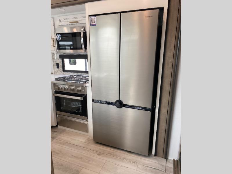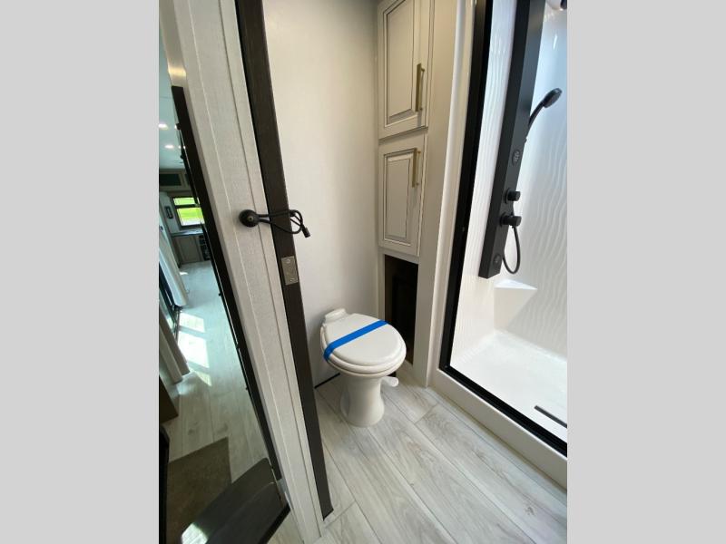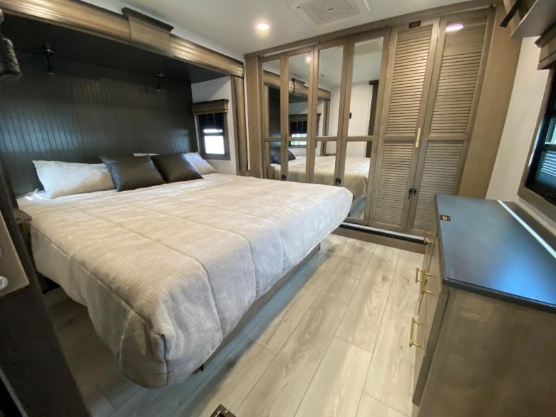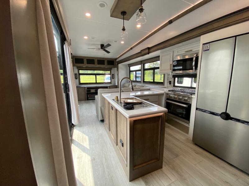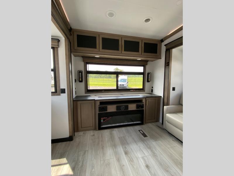 Luxury abounds throughout this fifth wheel starting in the centrally located kitchen featuring an L-shaped counter, a pull down storage pantry, a 24" range with an overhead convection microwave, and an 18 cu. ft. residential refrigerator with ice an maker. Just up the steps to the right of the entry, you will find a spacious bathroom featuring a 48" x 30" fiberglass shower with a seat, decorative glass enclosure, linen cabinet, and skylight above it for more natural lighting. Sleep like a baby in the front private bedroom on the king bed slide with storage underneath, and keep your clothes looking their best with the front closets. The rear entertainment living area offers true relaxation with L-shaped seating including a hide-a-bed sofa along the roadside, and powered theater seating facing the entertainment center with a 5,000 BTU decorative fireplace heater and Smart TV to watch your favorite movies! And don't overlook the best part, the powered side patio to entertain guests!