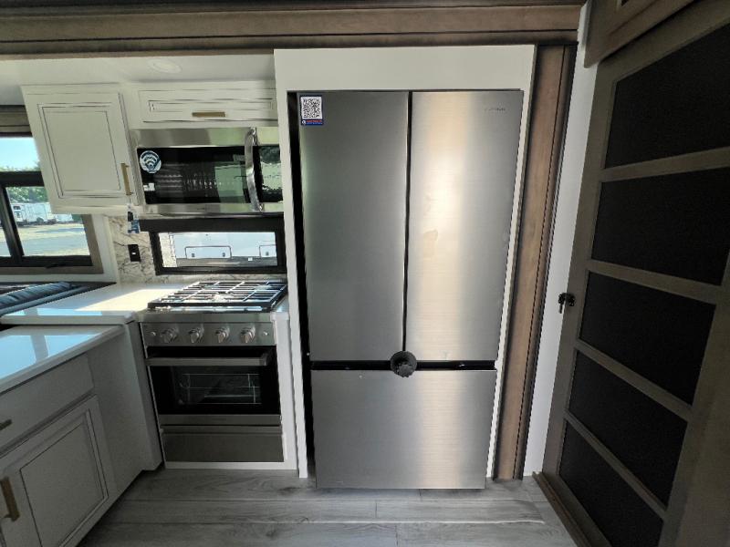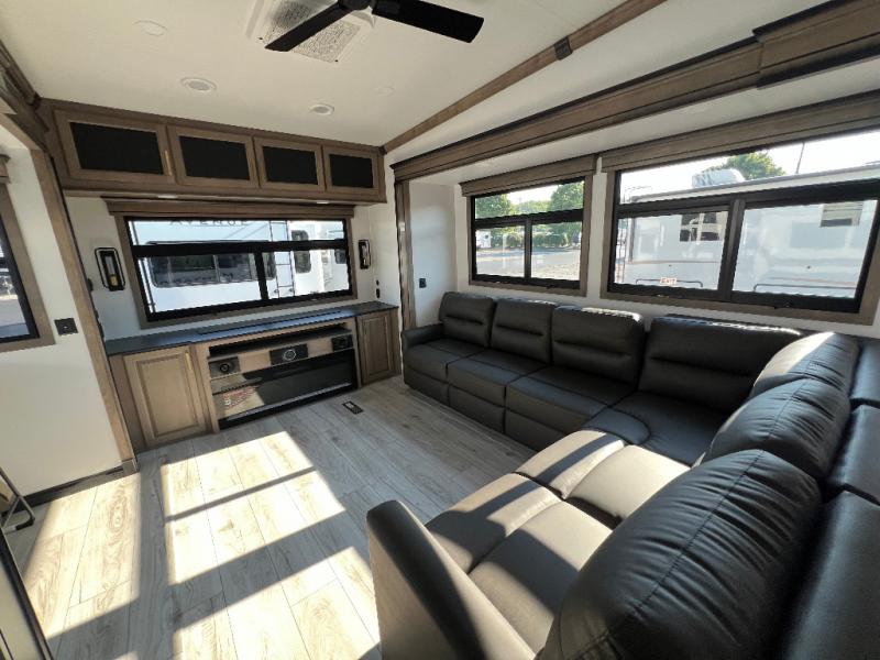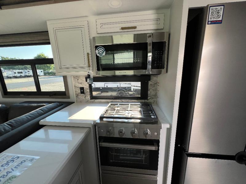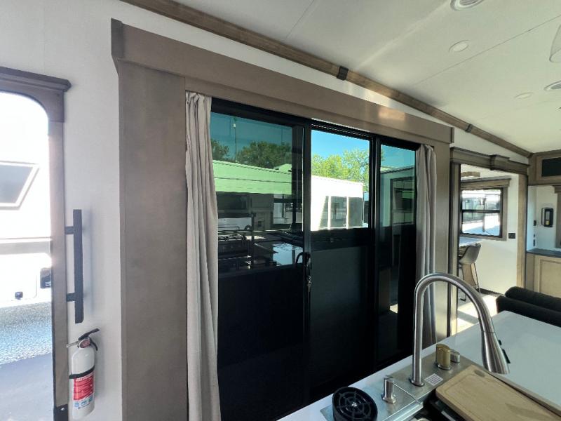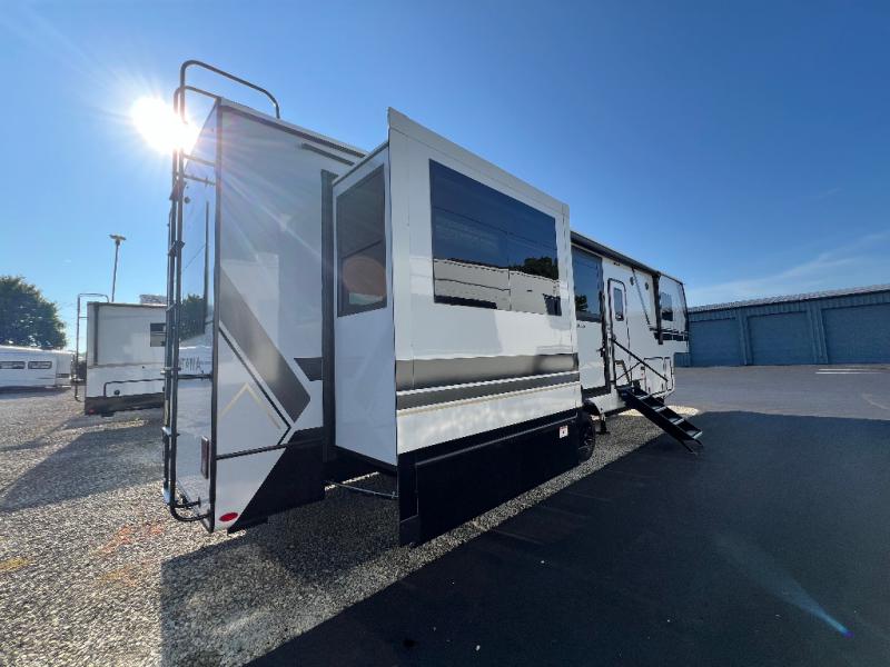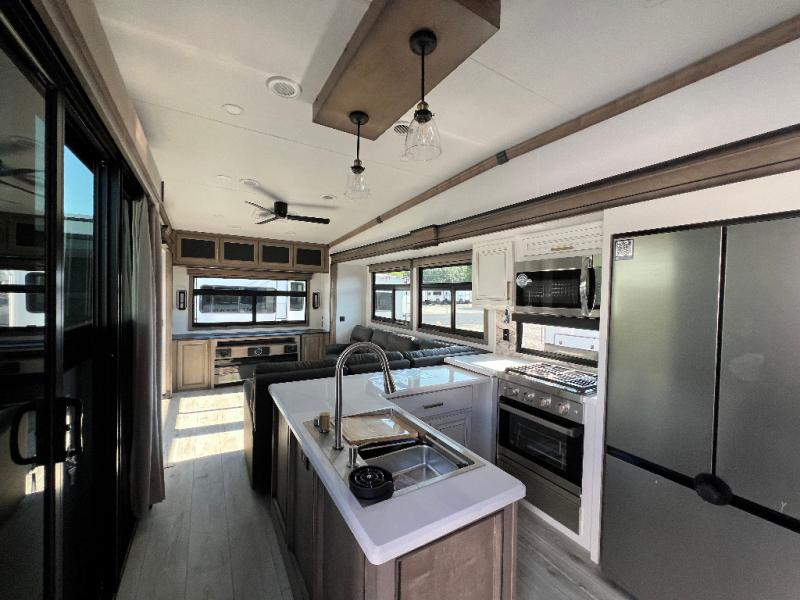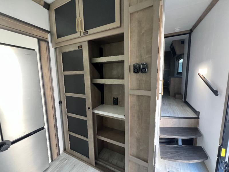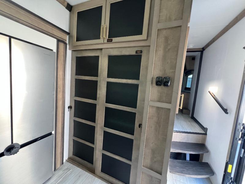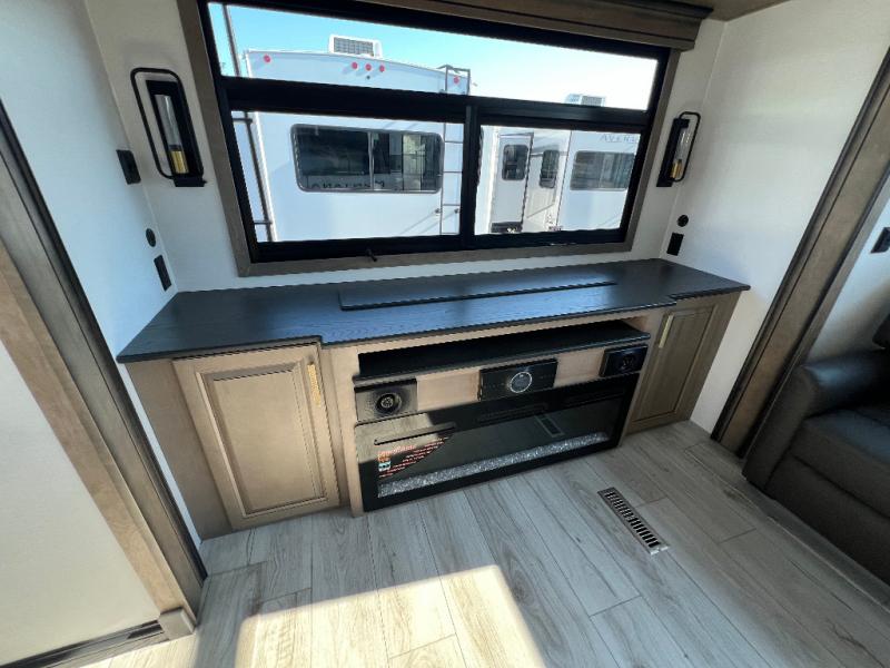 Luxury abounds throughout this fifth wheel starting in the centrally located kitchen featuring an L-shaped counter, a pull down storage pantry, a 24" range with an overhead convection microwave, and an 18 cu. ft. residential refrigerator with ice an maker. Just up the steps to the right of the entry, you will find a spacious bathroom featuring a 48" x 30" fiberglass shower with a seat, decorative glass enclosure, linen cabinet, and skylight above it for more natural lighting. Sleep like a baby in the front private bedroom on the king bed slide with storage underneath, and keep your clothes looking their best with the front closets. The rear entertainment living area offers true relaxation with L-shaped seating including a hide-a-bed sofa along the roadside, and powered theater seating facing the entertainment center with a 5,000 BTU decorative fireplace heater and Smart TV to watch your favorite movies! And don't overlook the best part, the powered side patio to entertain guests!
