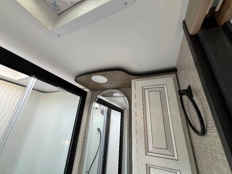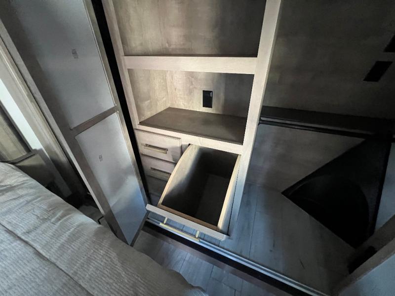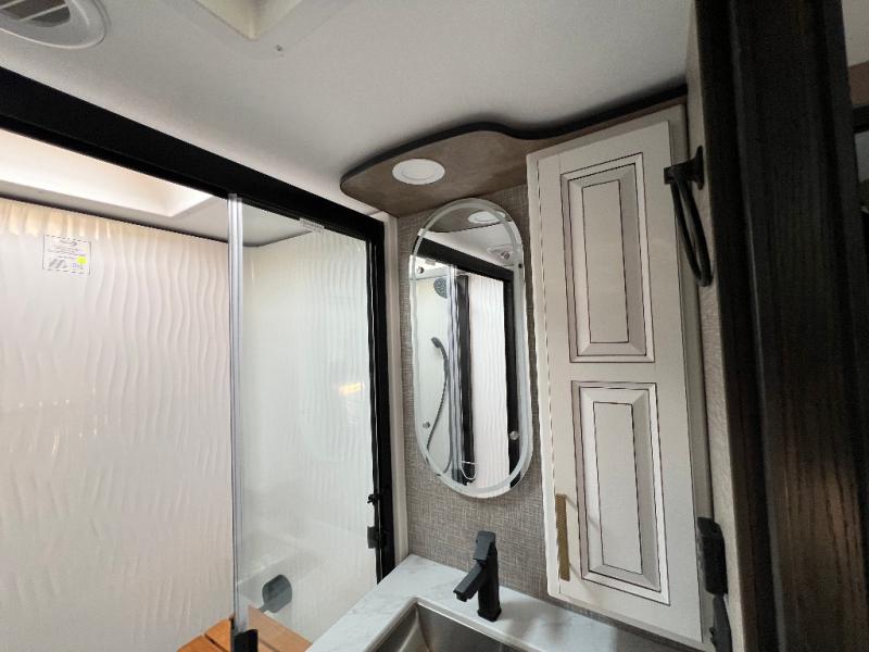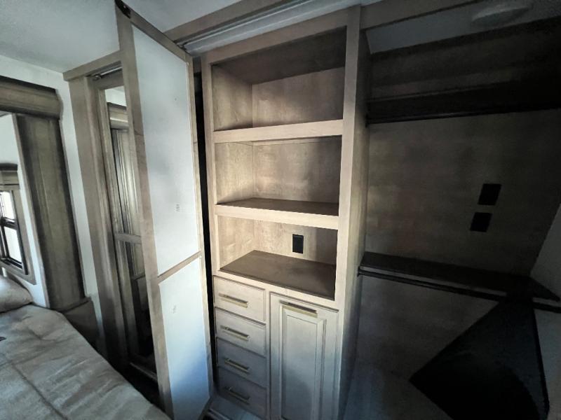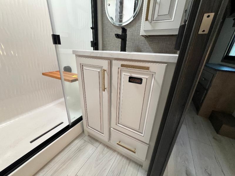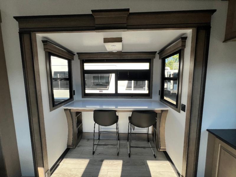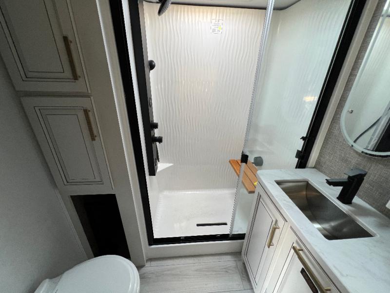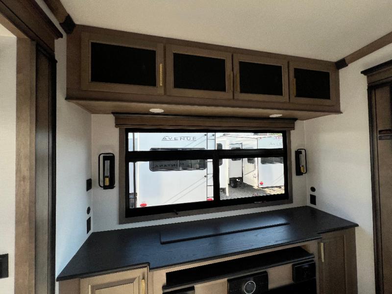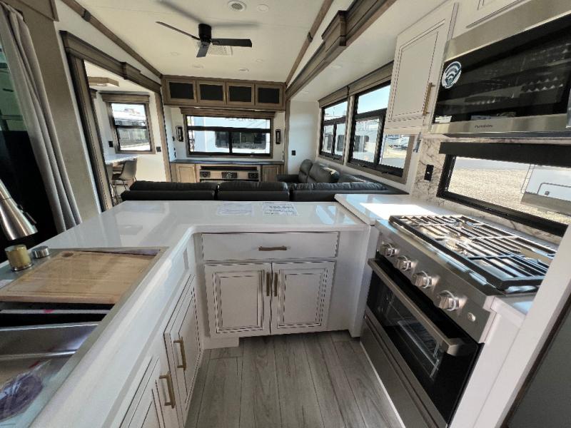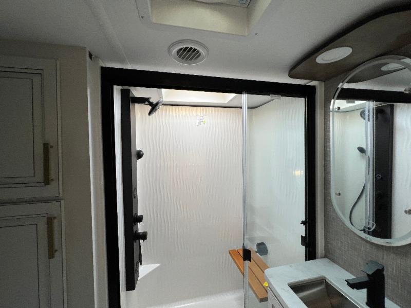 Luxury abounds throughout this fifth wheel starting in the centrally located kitchen featuring an L-shaped counter, a pull down storage pantry, a 24" range with an overhead convection microwave, and an 18 cu. ft. residential refrigerator with ice an maker. Just up the steps to the right of the entry, you will find a spacious bathroom featuring a 48" x 30" fiberglass shower with a seat, decorative glass enclosure, linen cabinet, and skylight above it for more natural lighting. Sleep like a baby in the front private bedroom on the king bed slide with storage underneath, and keep your clothes looking their best with the front closets. The rear entertainment living area offers true relaxation with L-shaped seating including a hide-a-bed sofa along the roadside, and powered theater seating facing the entertainment center with a 5,000 BTU decorative fireplace heater and Smart TV to watch your favorite movies! And don't overlook the best part, the powered side patio to entertain guests!