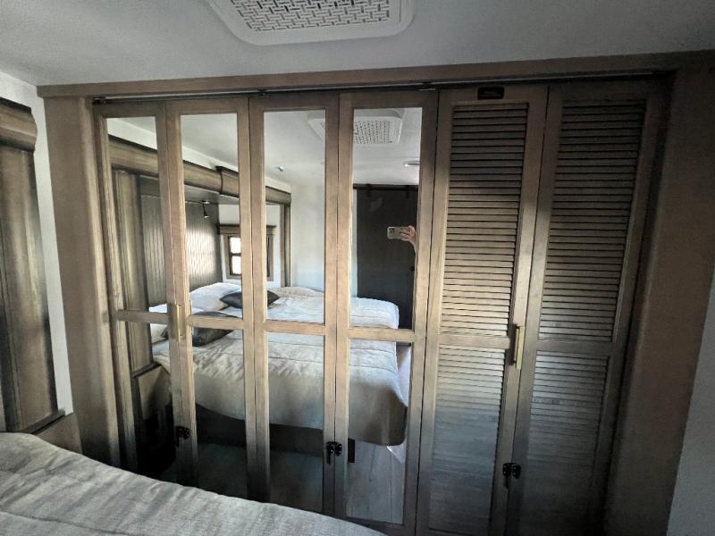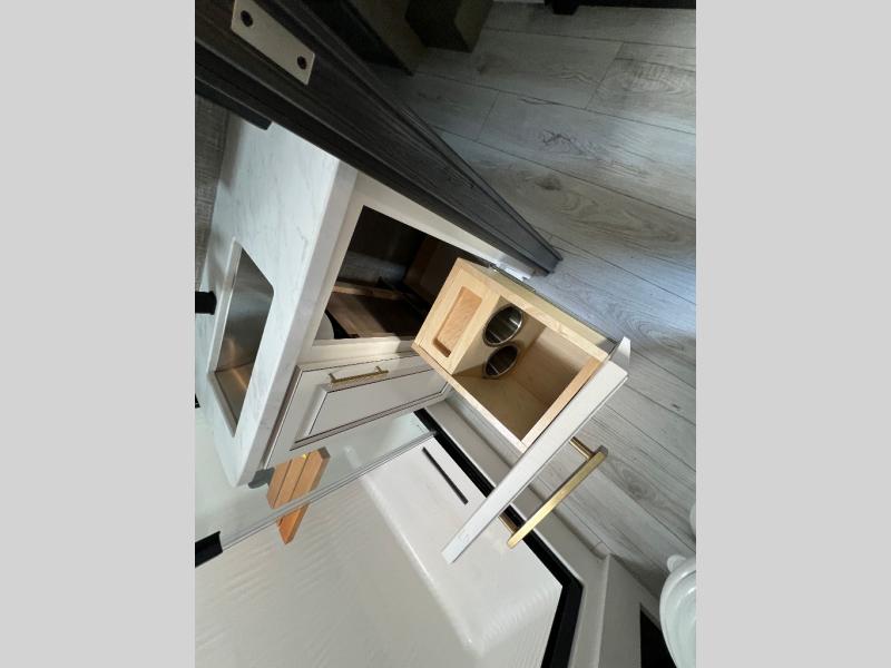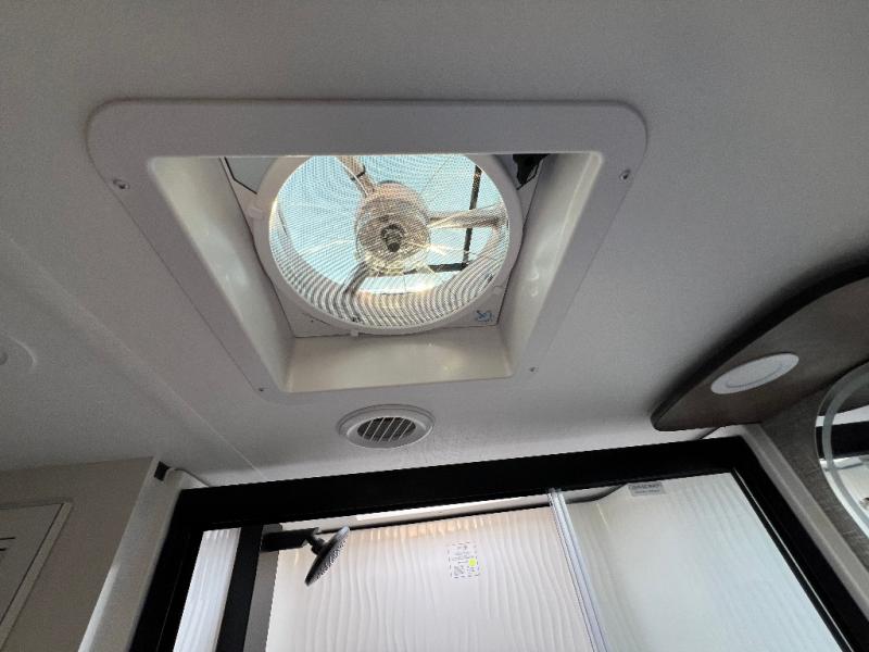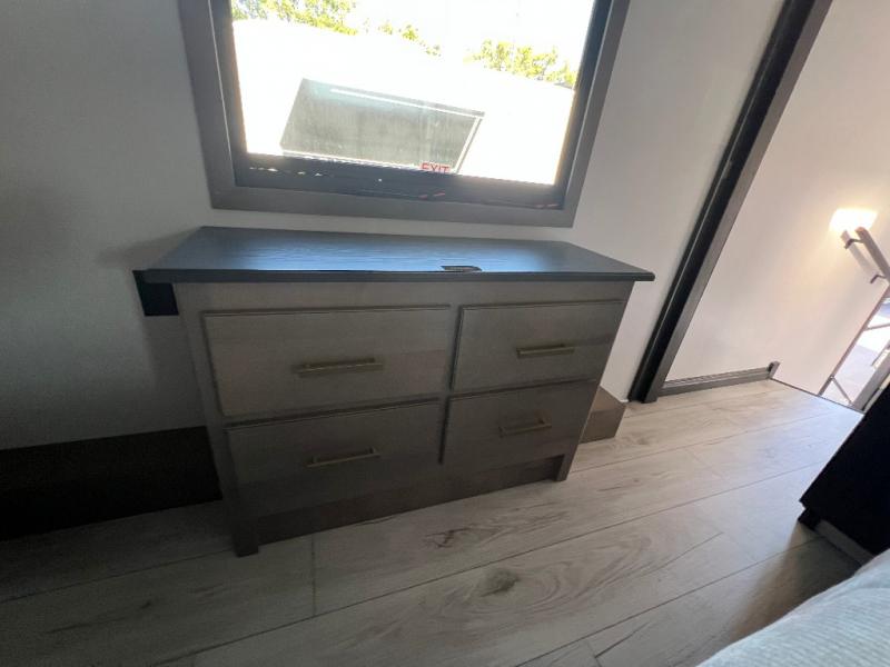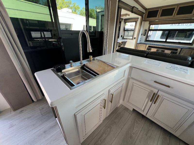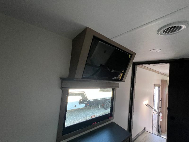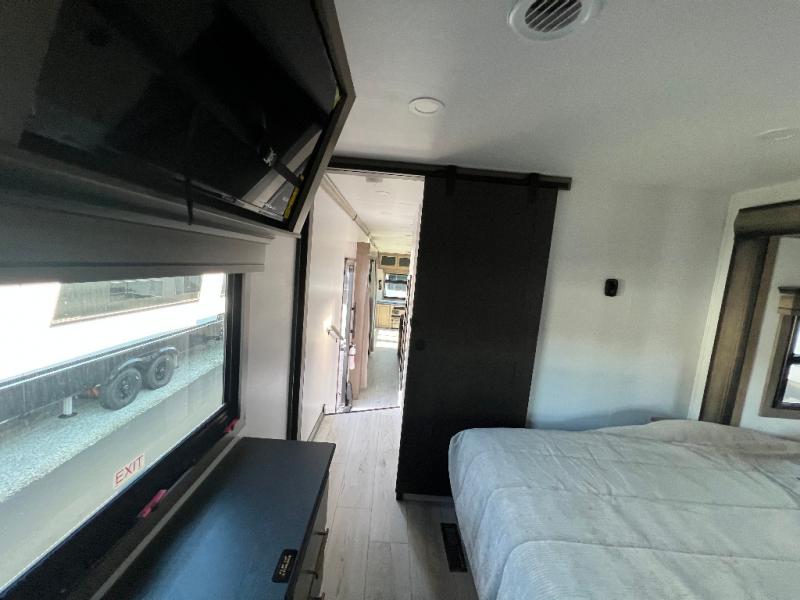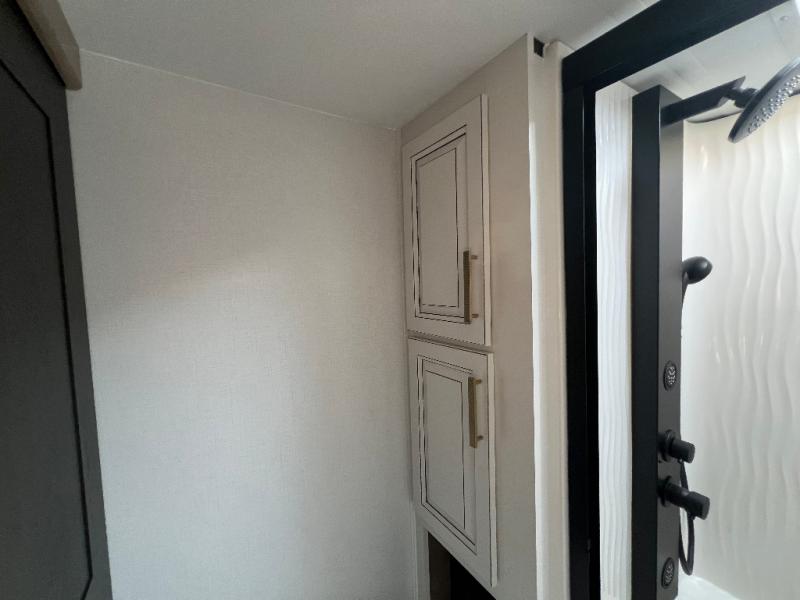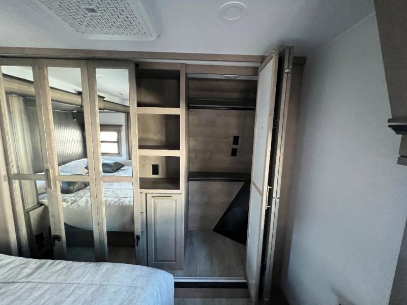 Luxury abounds throughout this fifth wheel starting in the centrally located kitchen featuring an L-shaped counter, a pull down storage pantry, a 24" range with an overhead convection microwave, and an 18 cu. ft. residential refrigerator with ice an maker. Just up the steps to the right of the entry, you will find a spacious bathroom featuring a 48" x 30" fiberglass shower with a seat, decorative glass enclosure, linen cabinet, and skylight above it for more natural lighting. Sleep like a baby in the front private bedroom on the king bed slide with storage underneath, and keep your clothes looking their best with the front closets. The rear entertainment living area offers true relaxation with L-shaped seating including a hide-a-bed sofa along the roadside, and powered theater seating facing the entertainment center with a 5,000 BTU decorative fireplace heater and Smart TV to watch your favorite movies! And don't overlook the best part, the powered side patio to entertain guests!